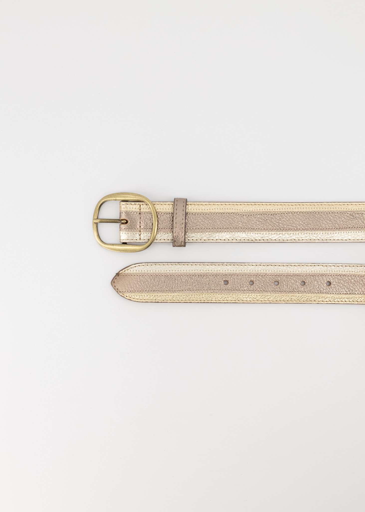 The Louise belt is made of metallic leather and has a gold colored buckle. Louise can be worn as a belt. The belt is 4 cm wide and available in sizes 85, 95 and 105 cm.
