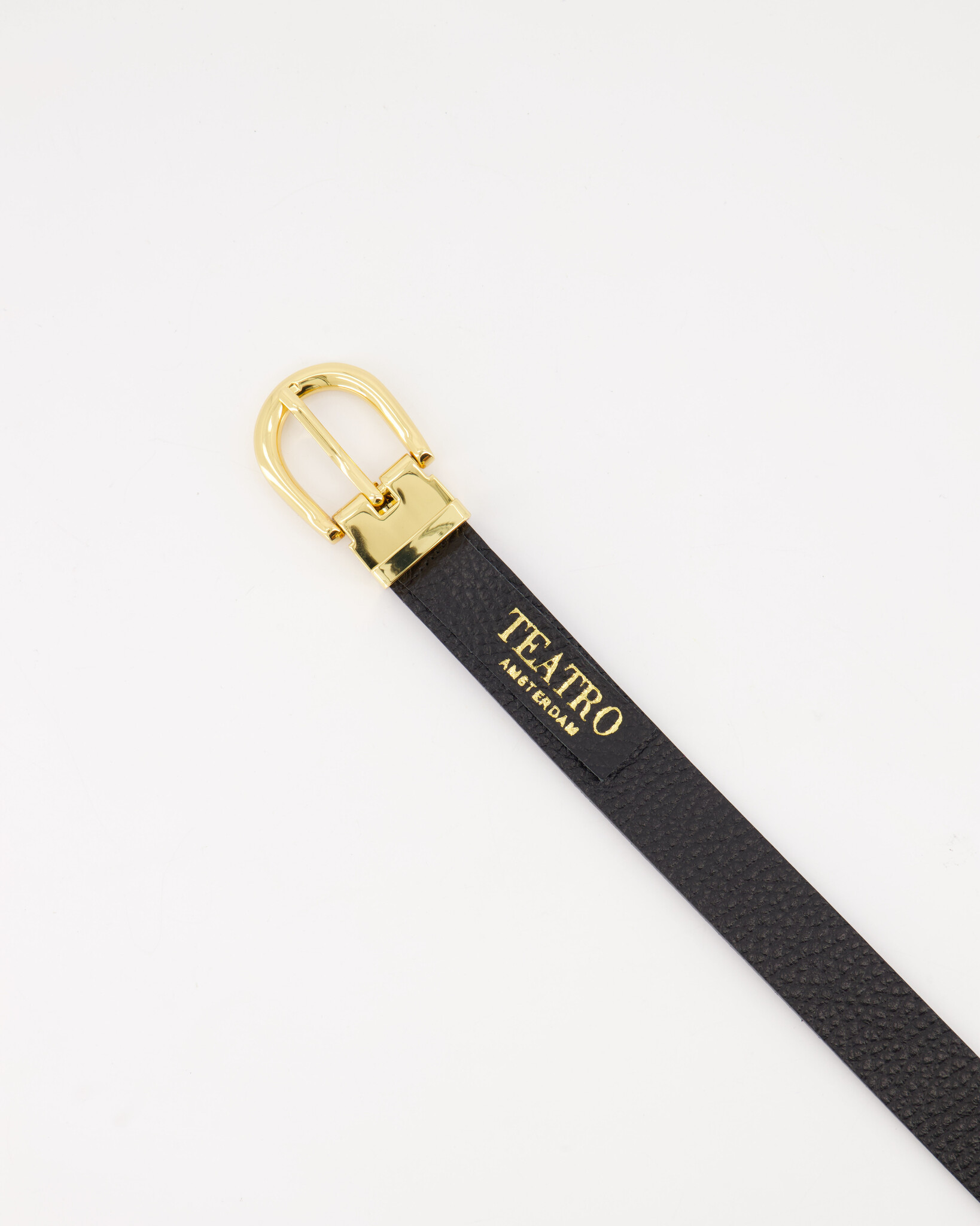 The Meau Reversible Leather Belt, expertly crafted in Italy. This belt offers two styles in one, with metallic leather on one side and grain leather on the other. The removable gold-colored buckle makes customization a breeze.