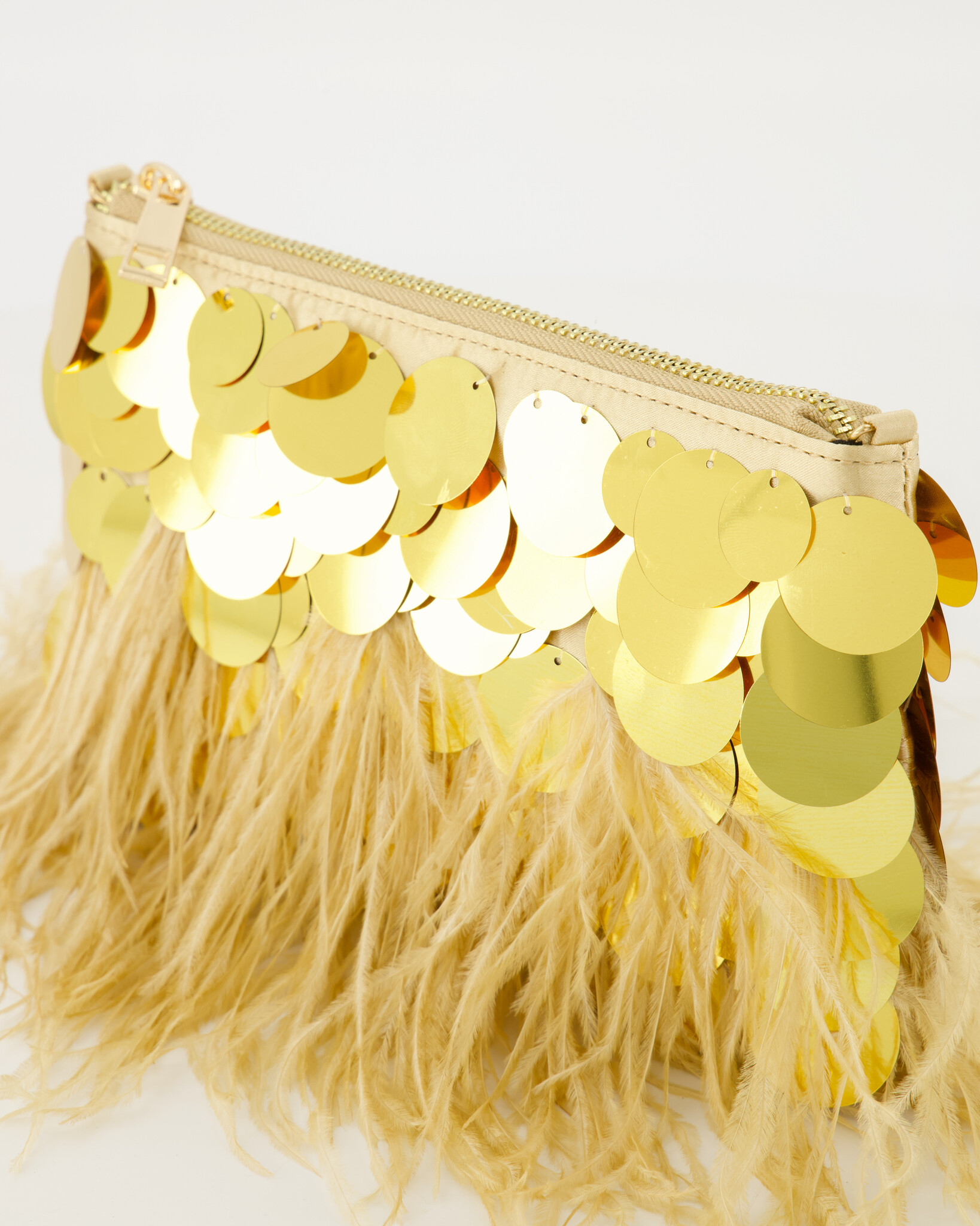 Add glamor to any outfit with the striking Adele clutch. Decorated with gold sequins and lush fringes, this clutch is perfect for parties and special occasions. The bag offers enough space for essentials such as phone, keys and make-up, and has a handy zipper.