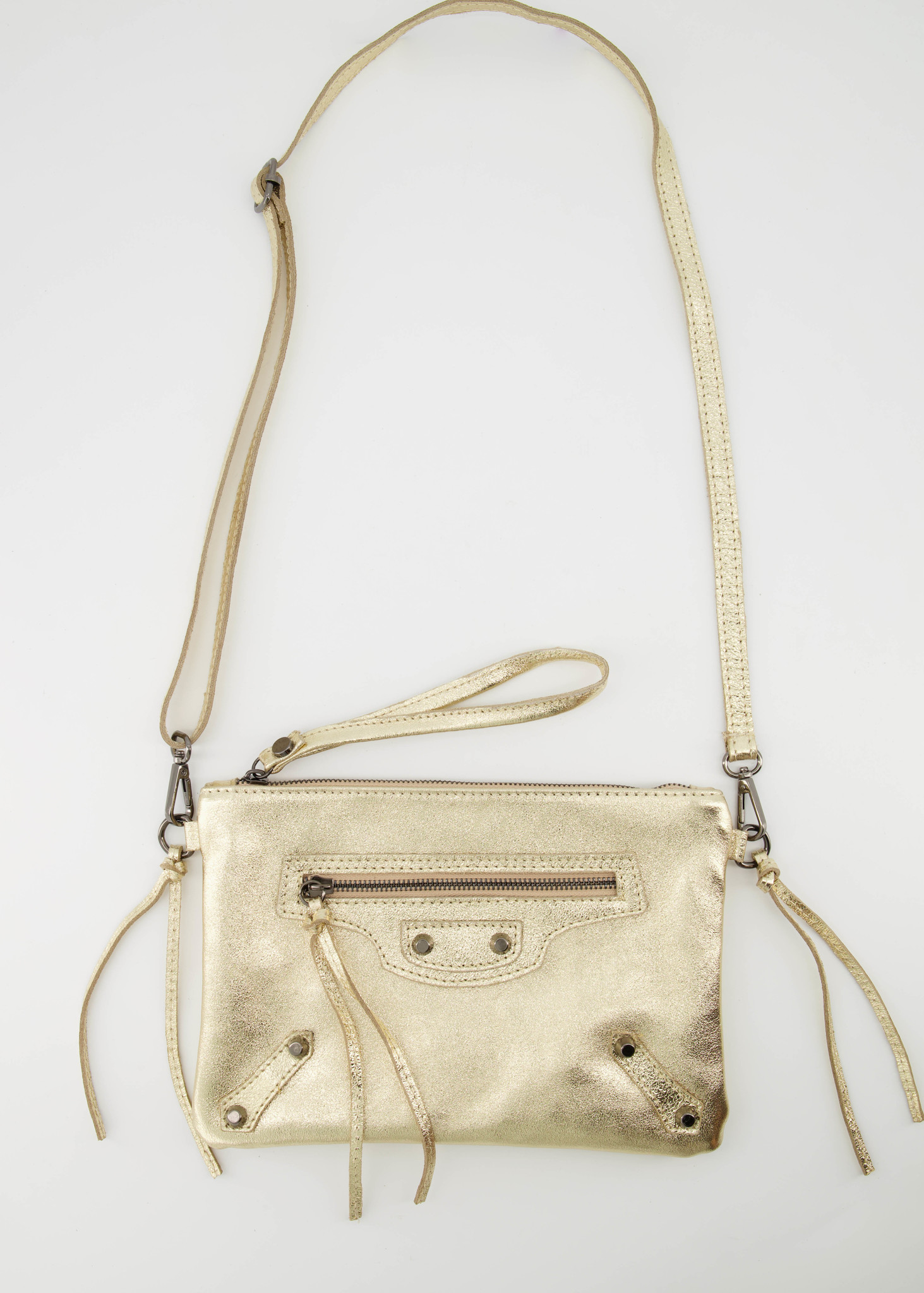 Leather clutch with metal finishes.