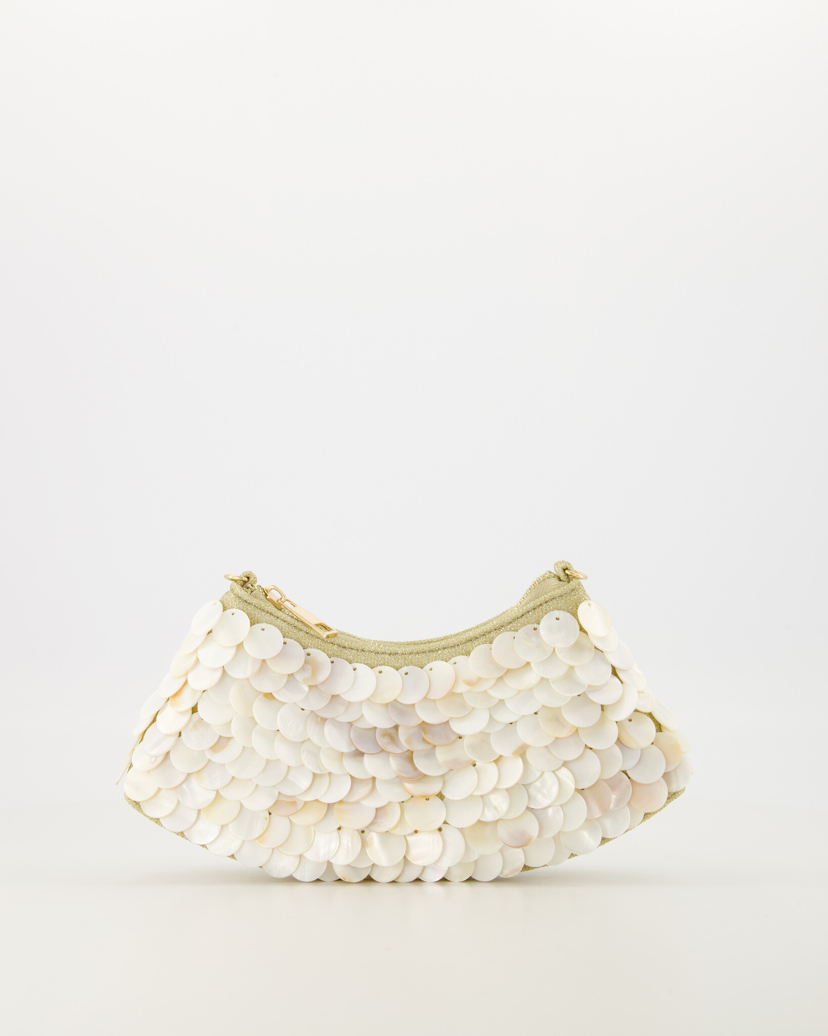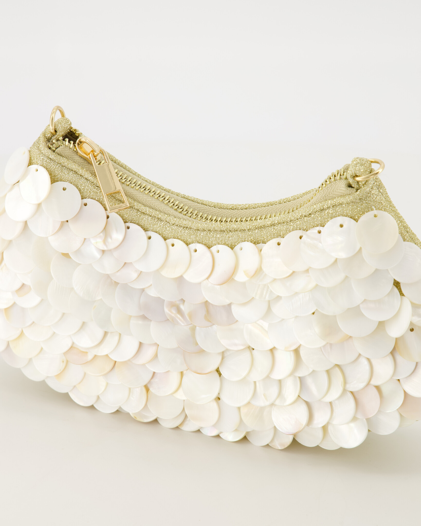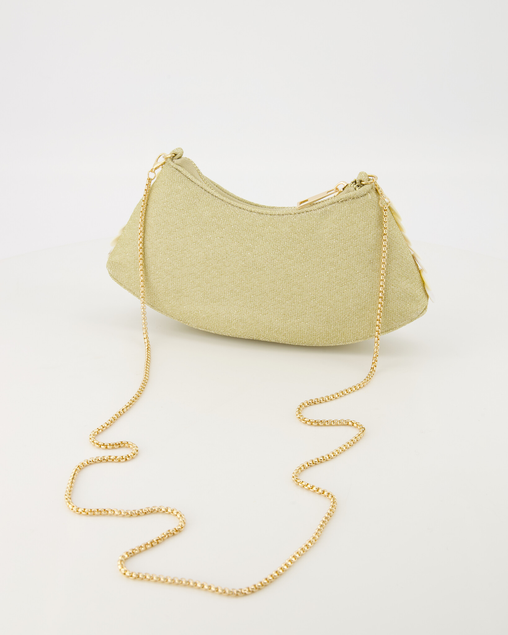 Add a spark of style to your evening outfit with the Reese clutch from our party collection. This striking bag is decorated with large sequins in a beautiful mother of pearl color, which offer a luxurious and modern look. The design closes securely with a handy zipper and comes with a gold-colored chain handle, so you can carry the clutch in your hand or over the shoulder. Perfect for special occasions, the Reese clutch provides plenty of room for your essentials while adding a touch of glamor to any look. An indispensable accessory for the fashion-conscious woman!