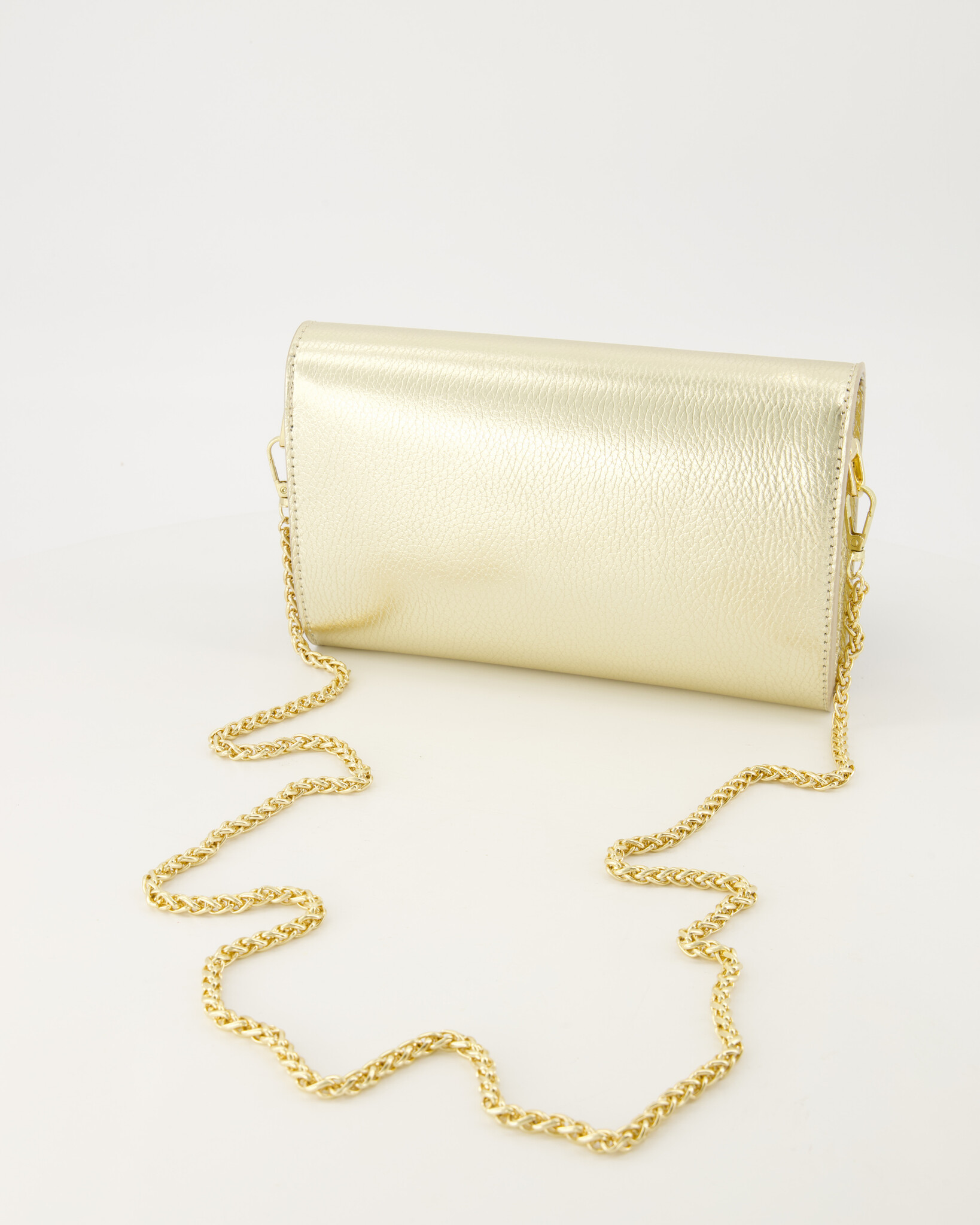 Valencia is a grain leather evening bag made of genuine leather. This evening bag is ideal for a gala, night out or a party. The Valencia bag can be worn as a clutch and as a crossbody bag. The bag has 3 inner compartments, the middle compartment is closed with a zipper. The evening bag has a removable gold-colored chain handle.