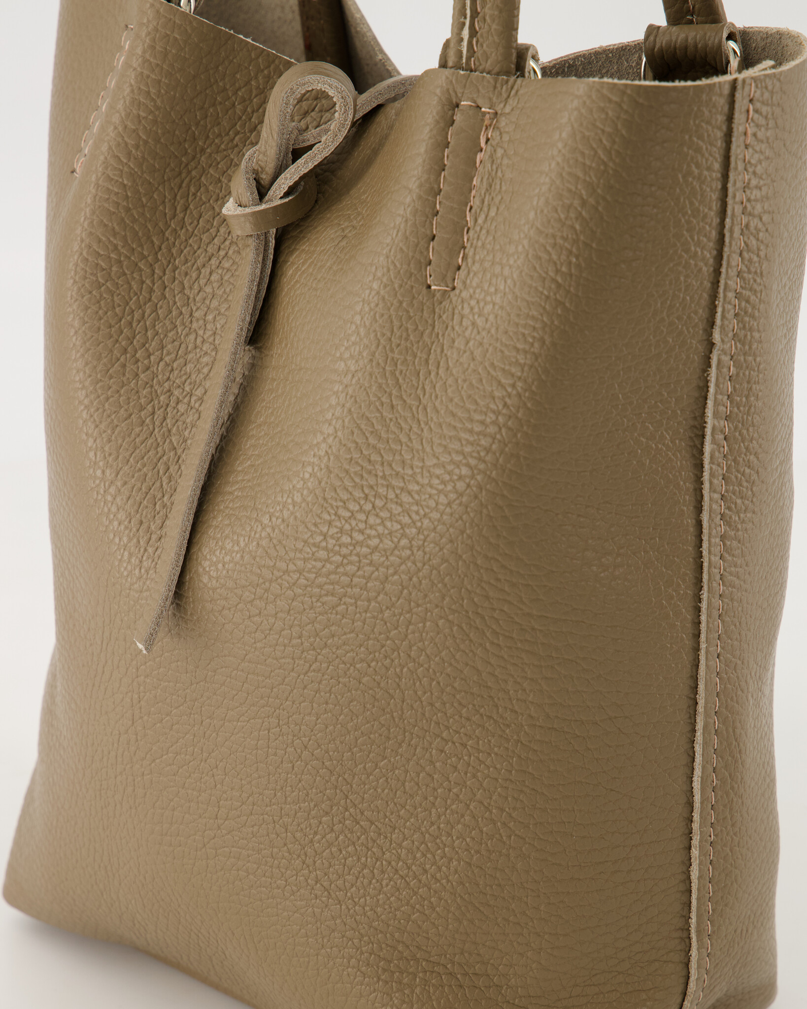 This leather mini shopper has a rope closure and comes with a removable and adjustable long handle so you can also wear it as a crossbody bag.