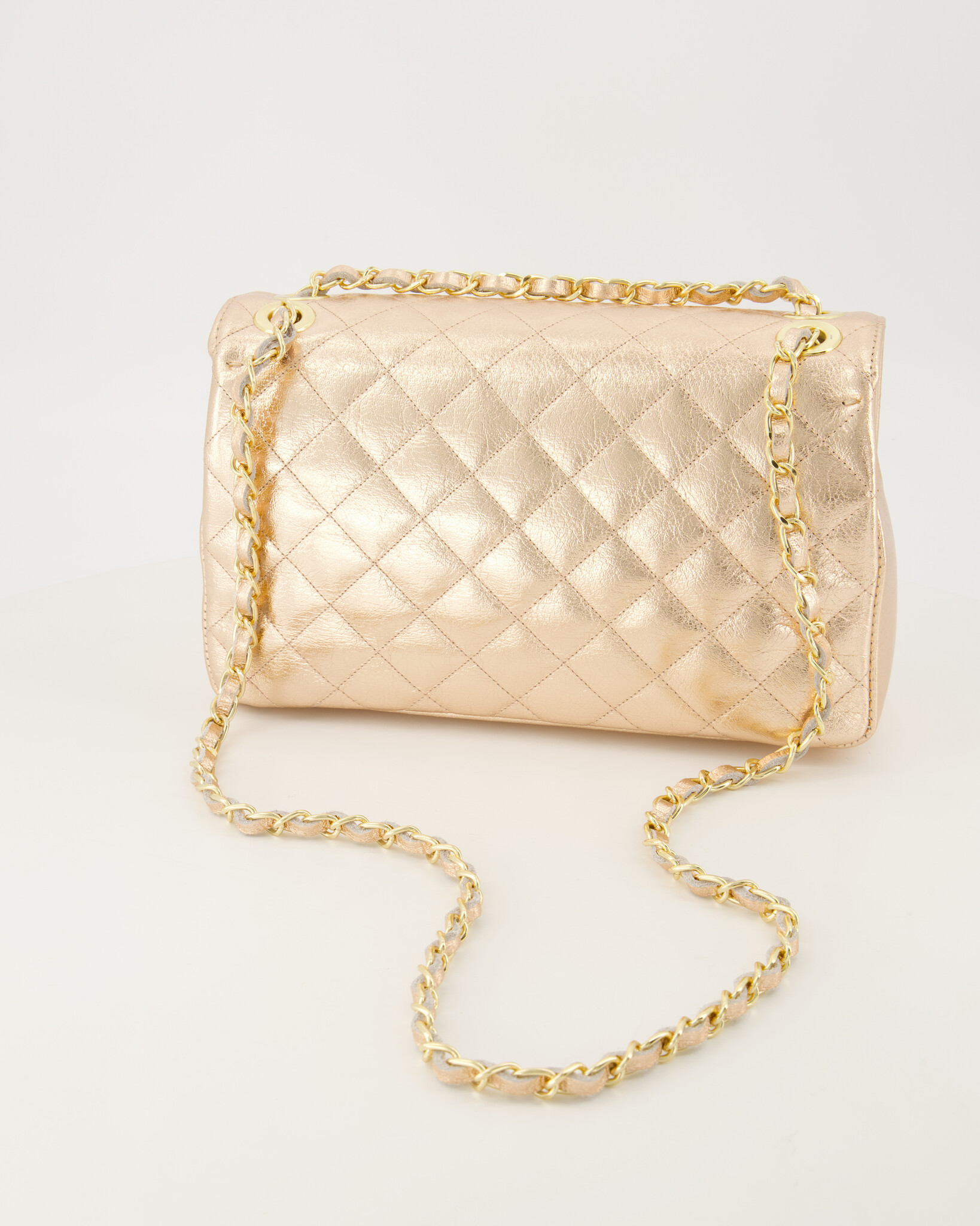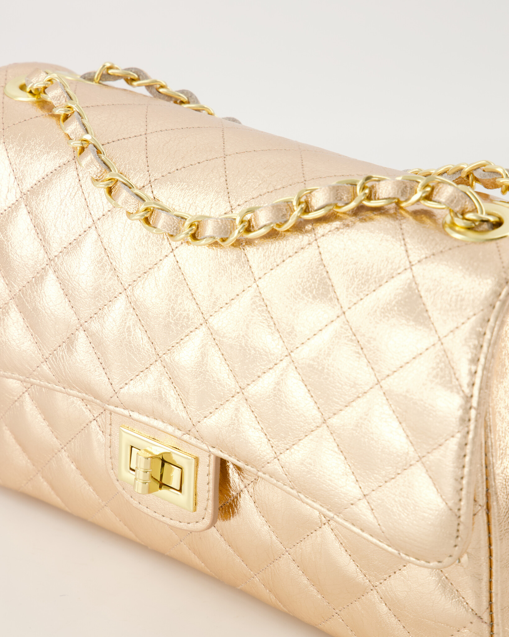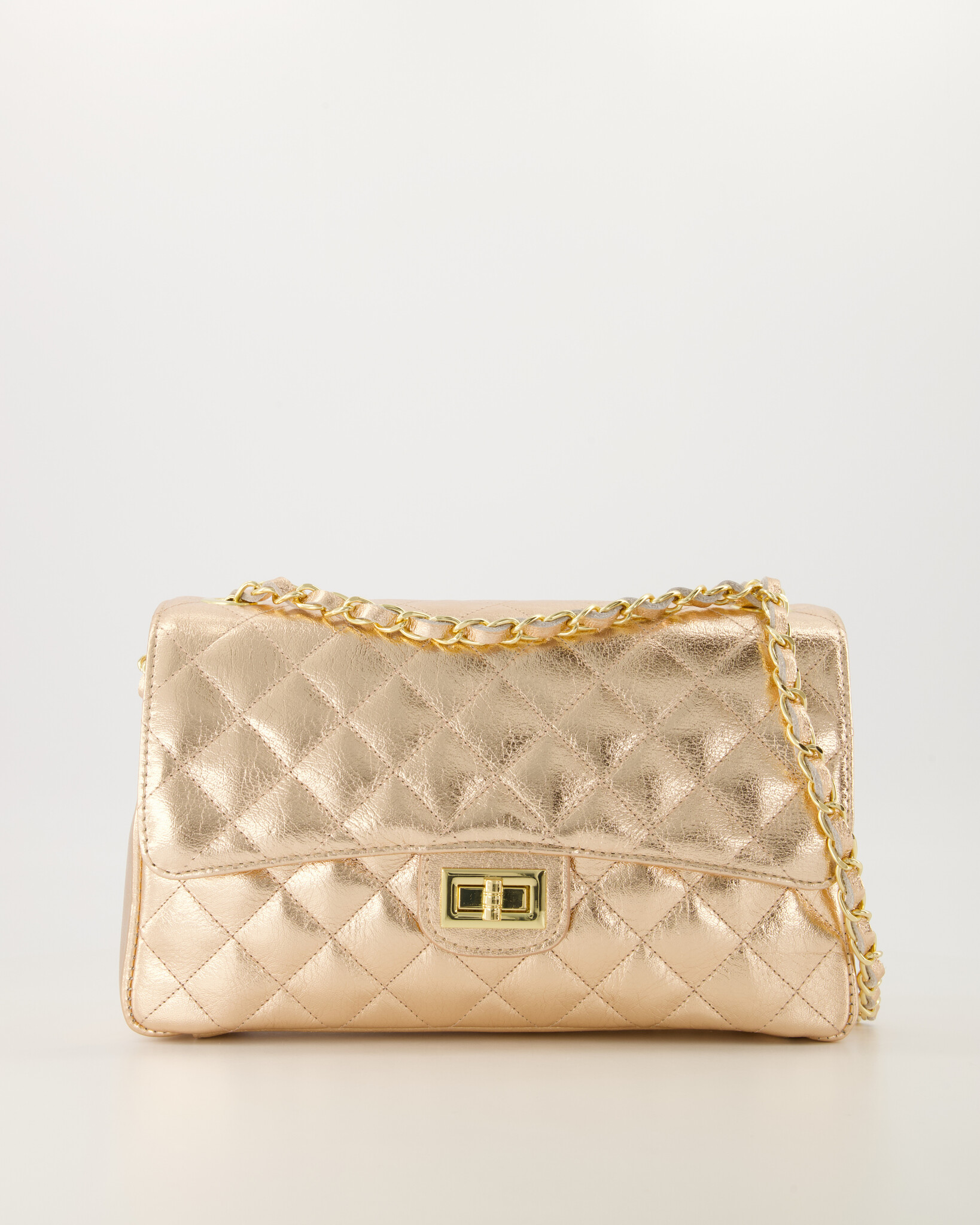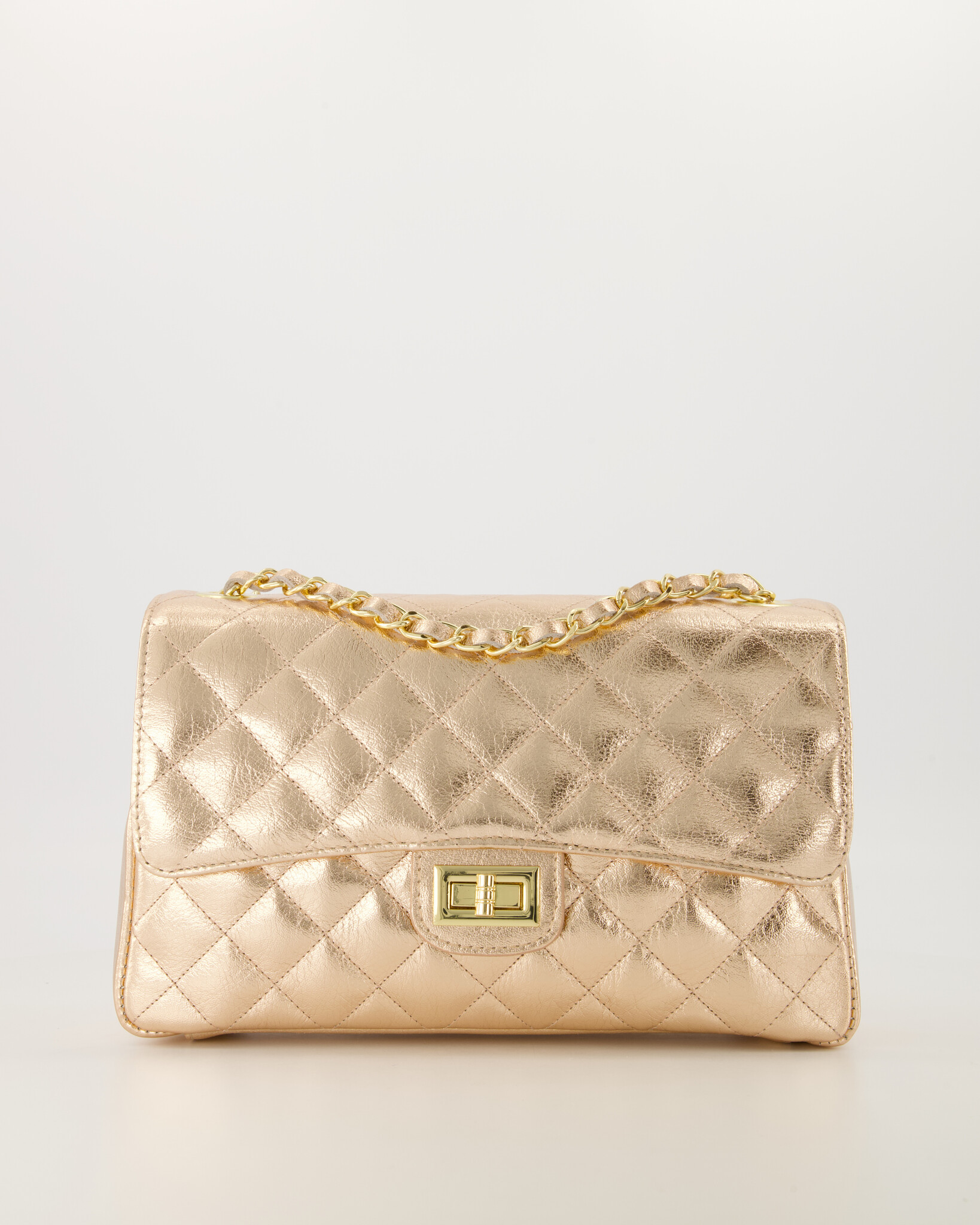 The Audrey Medium crossbody bag in a sauvage version has a gold-colored chain handle. The bag has two large inner compartments and a lockable inner compartment.