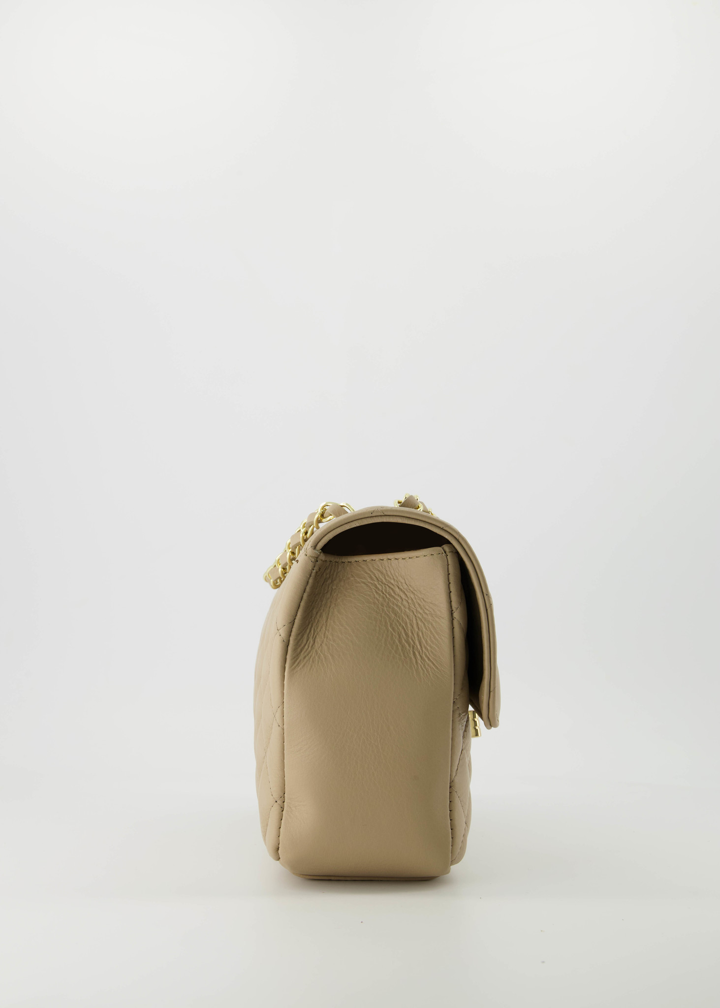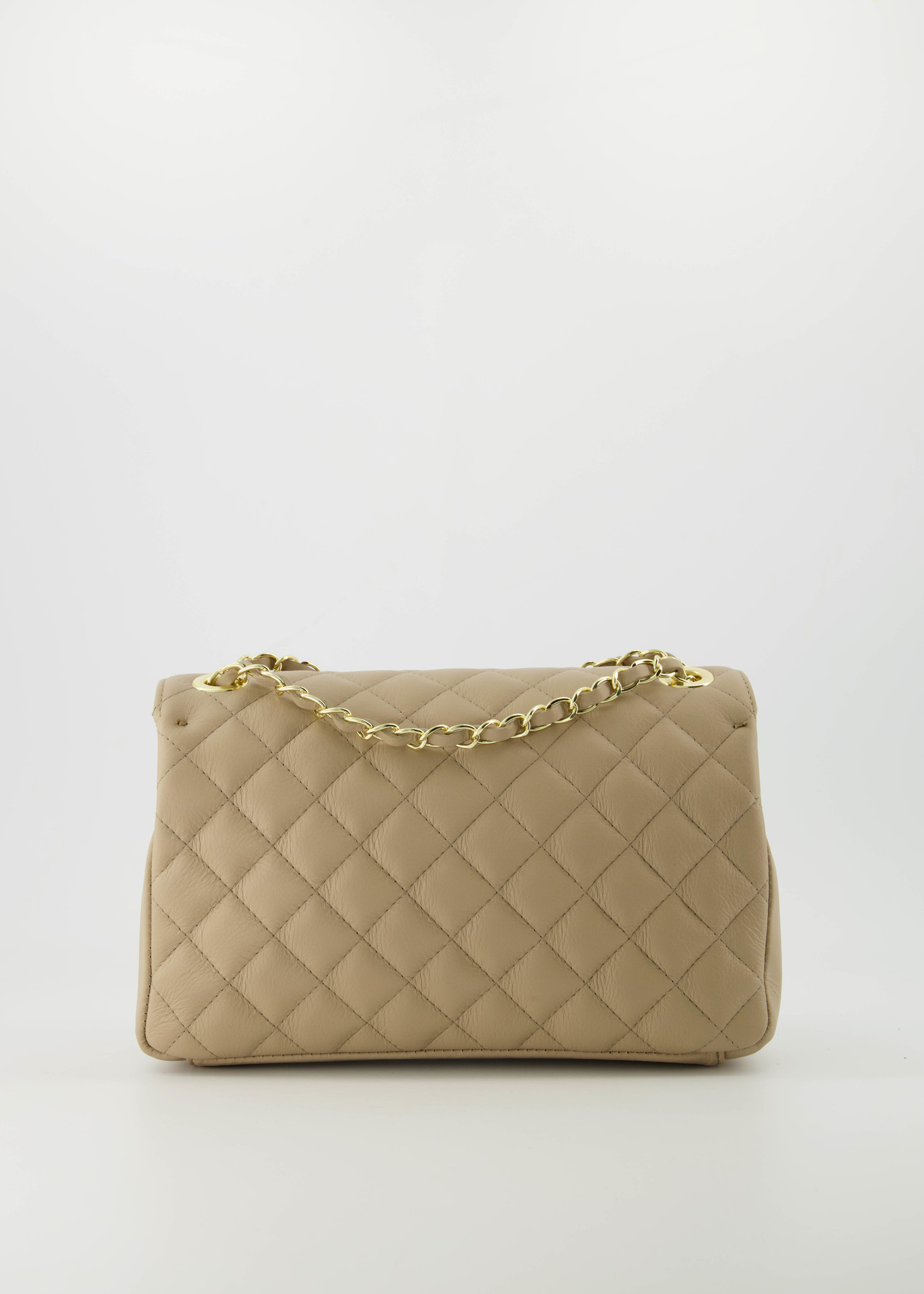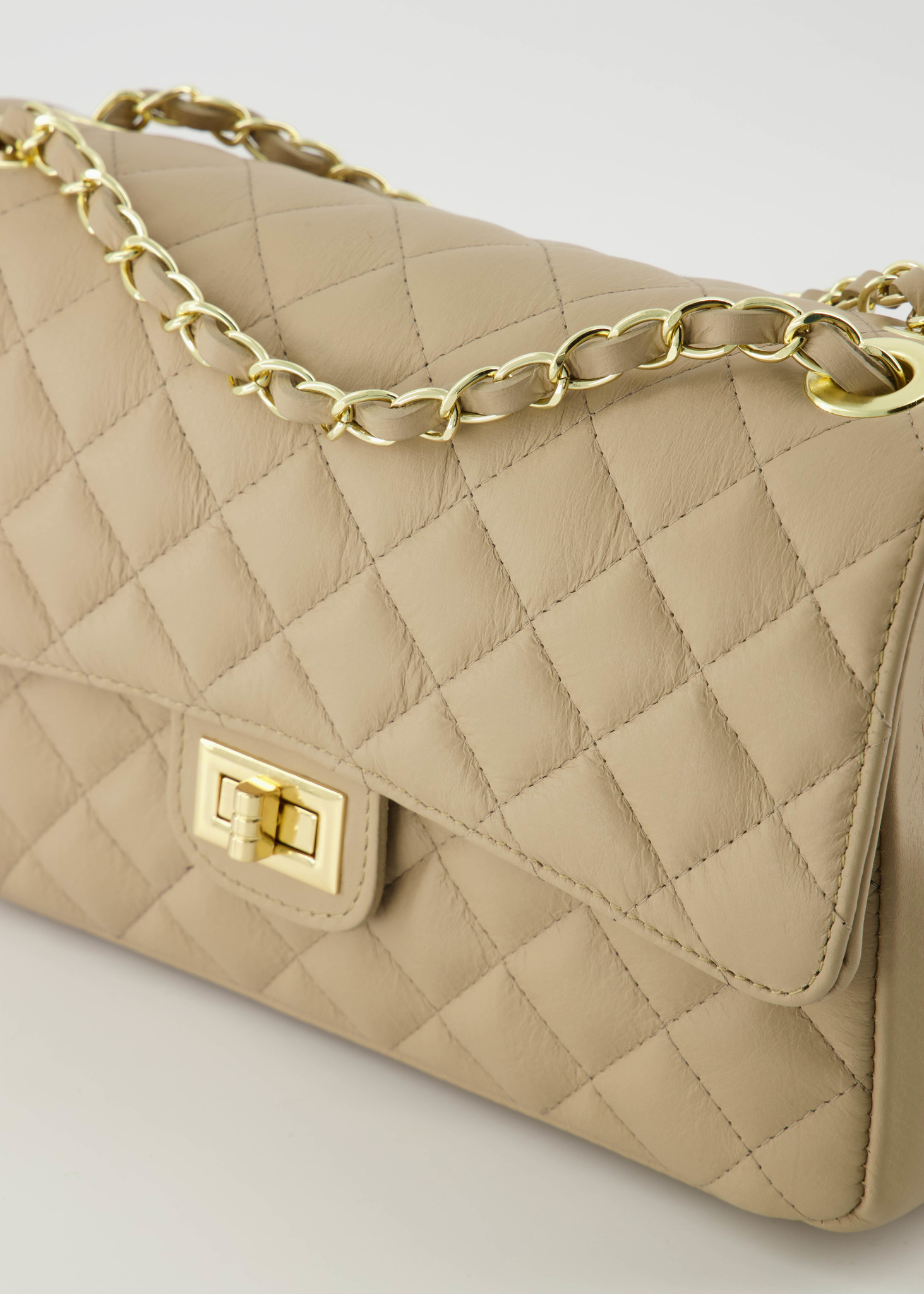 The Audrey bag in a medium size in the color Taupe is made of Italian Sauvage leather. The leather crossbody bag has a gold metal chain handle. The Audrey crossbody bag has two large inner compartments and a lockable slip pocket.