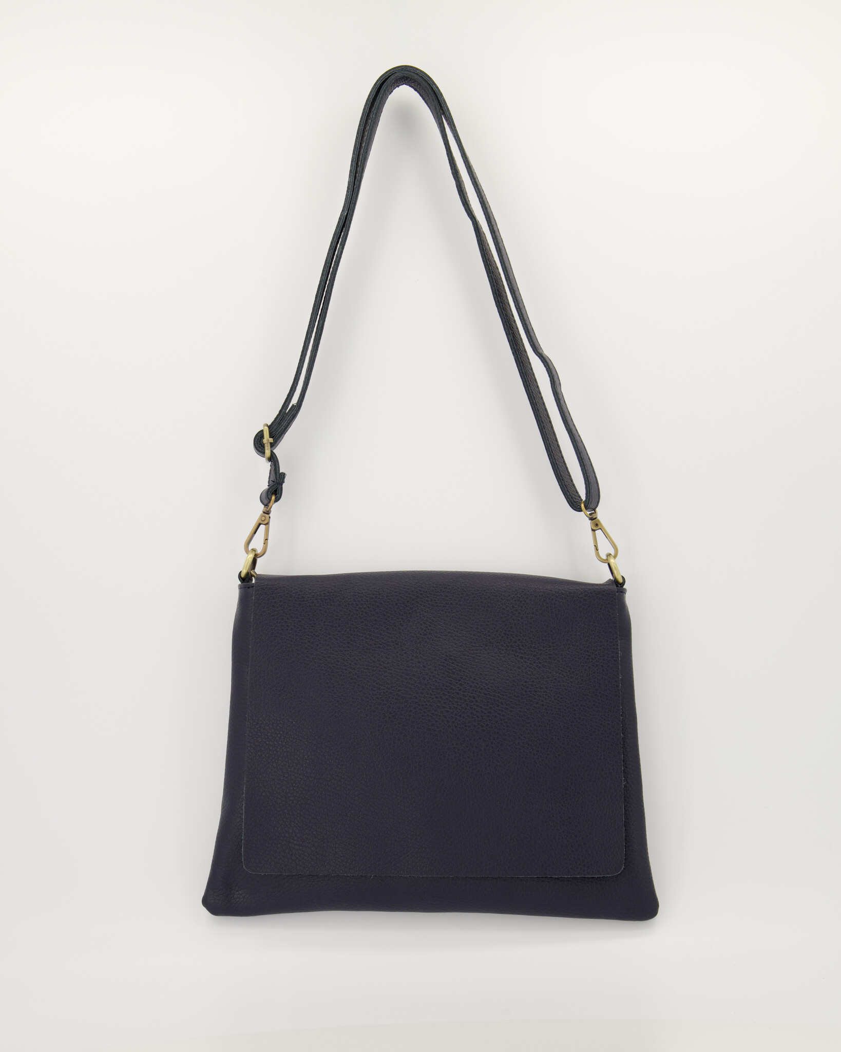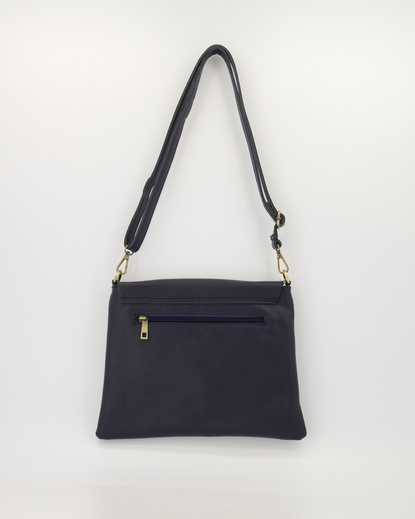 The crossbody bag Baby Yaslin is made of genuine leather. Yaslin has a main compartment with a zipper pocket and a slip pocket on the inside. The bag is closed by a zipper and a flap. On the back of the crossbody bag there is a zippered pocket. The bag has a removable and adjustable handle with bronze-colored hardware. This bag combines functionality with fashion and provides secure storage for a tablet or small 10-inch laptop.