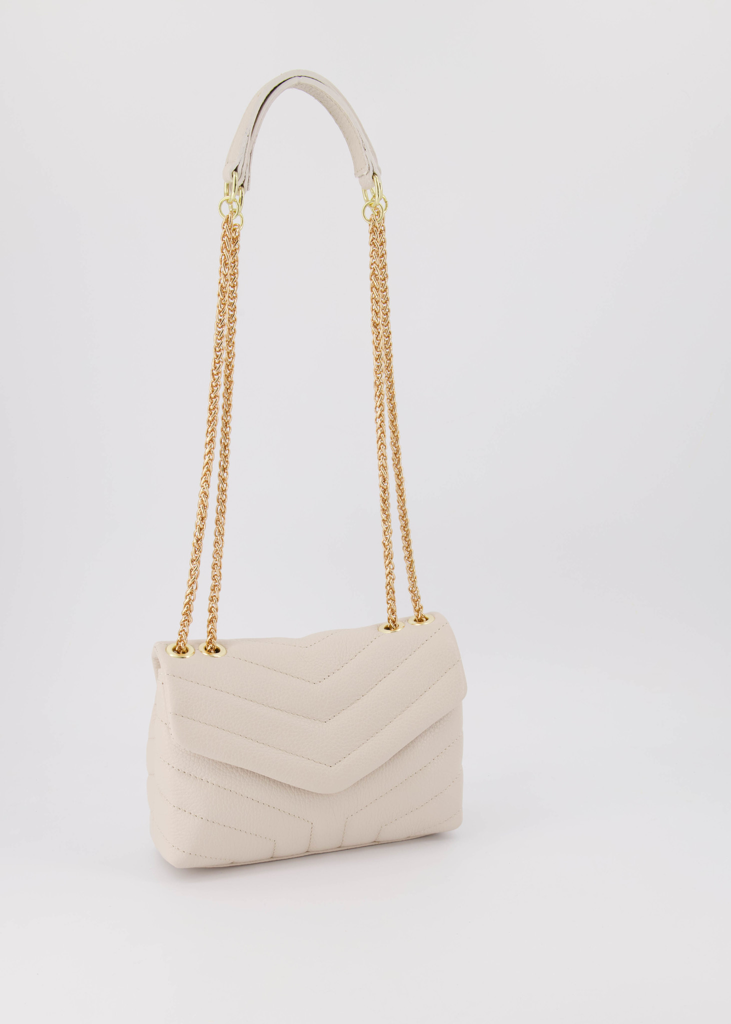 The Celine bag is made of Italian genuine leather. The crossbody bag has a front flap with a magnetic closure. The bag has a main compartment and a zipper pocket. The bag has a double chain handle with gold finish and a leather strap. The Celine crossbody bag can be worn both casual and party chic.