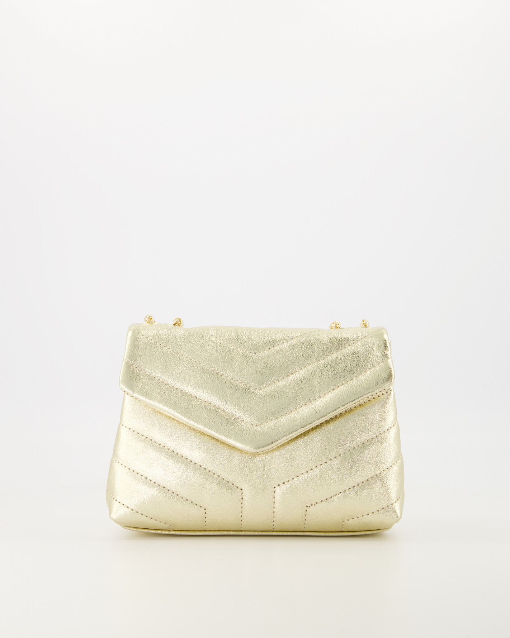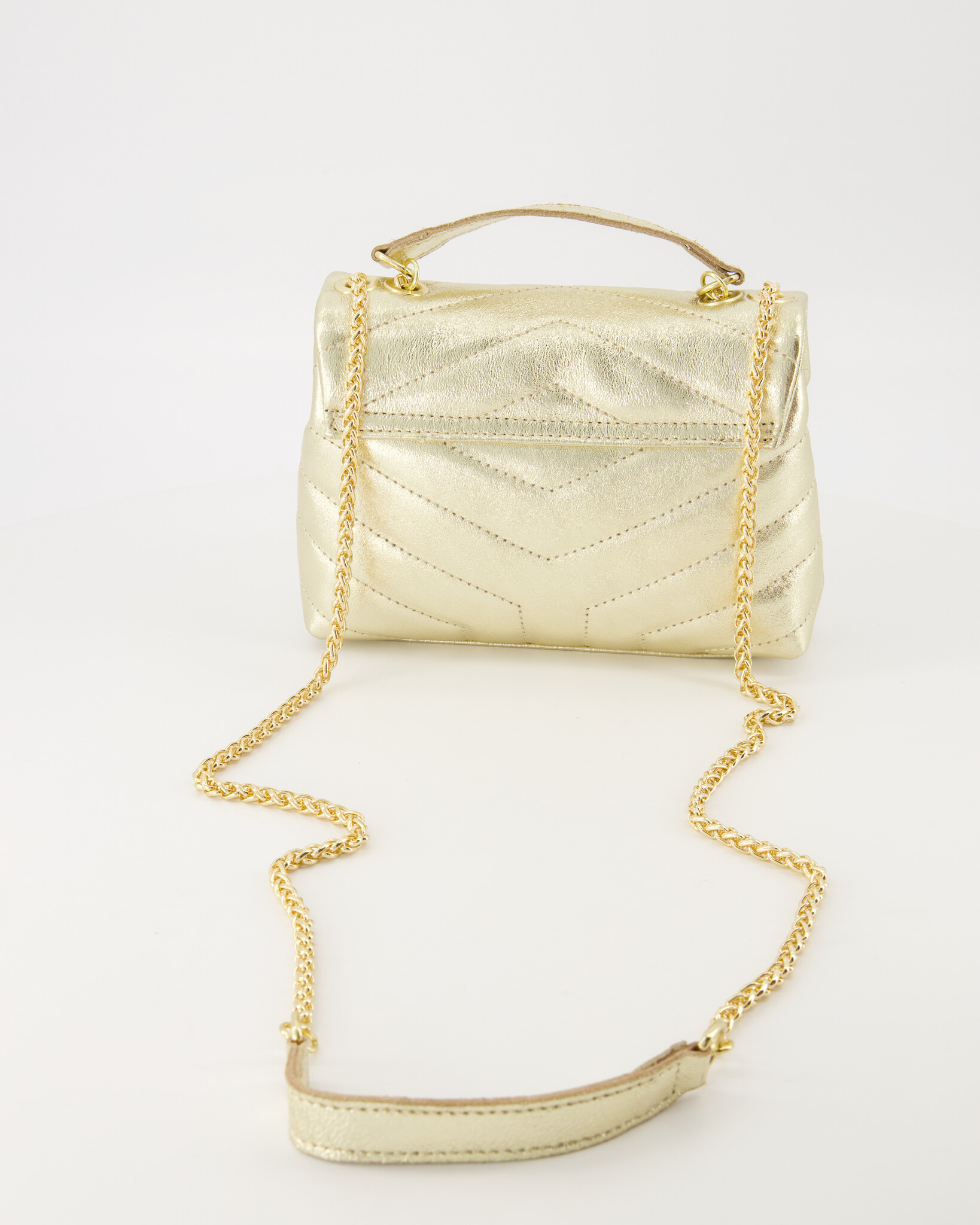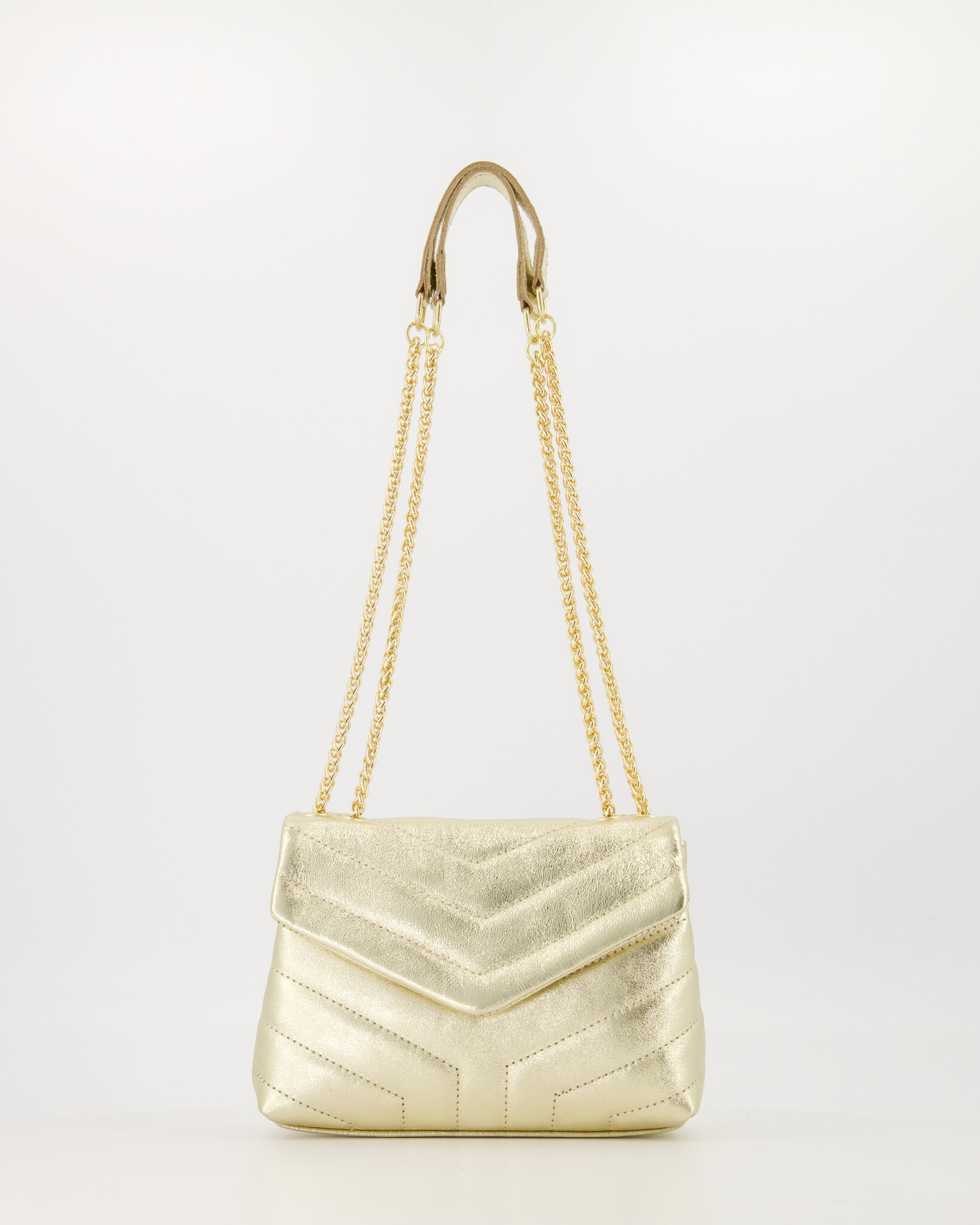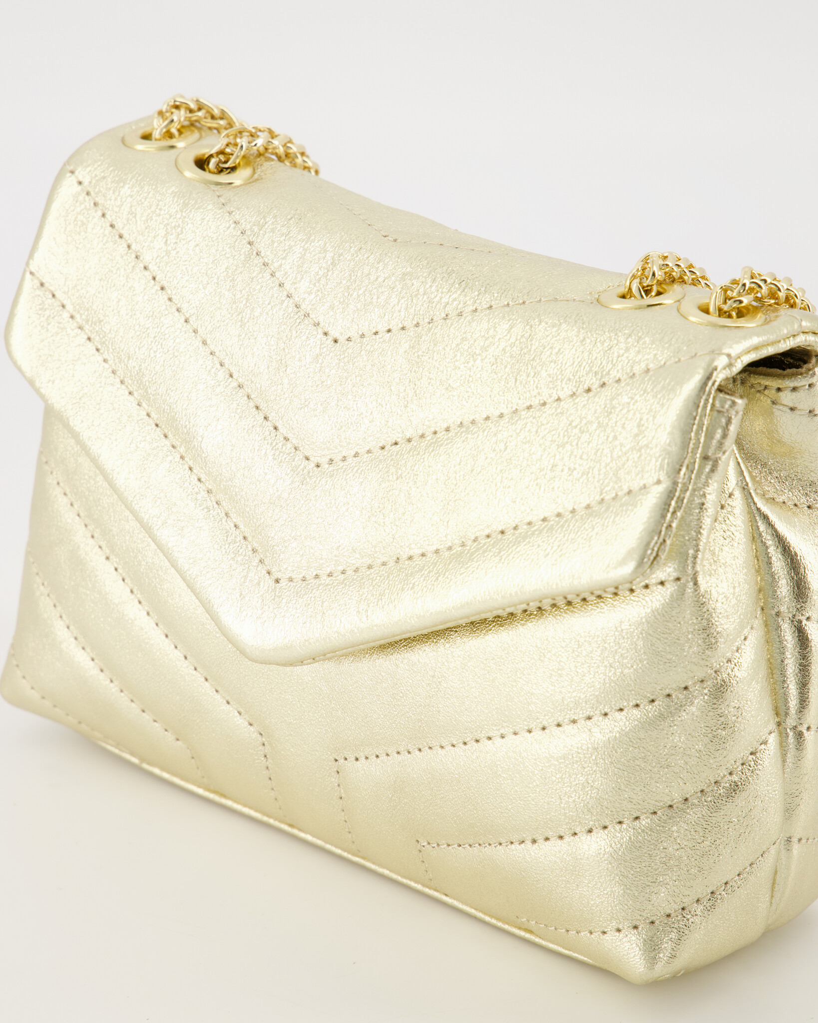 The Celine bag in a metallic version is made of Italian leather. The crossbody bag has a front flap with a magnetic closure. The bag has a main compartment and a zippered pocket. The bag has a double chain handle with a gold finish and a leather strap. The Celine crossbody bag can be worn both casual and party chic.