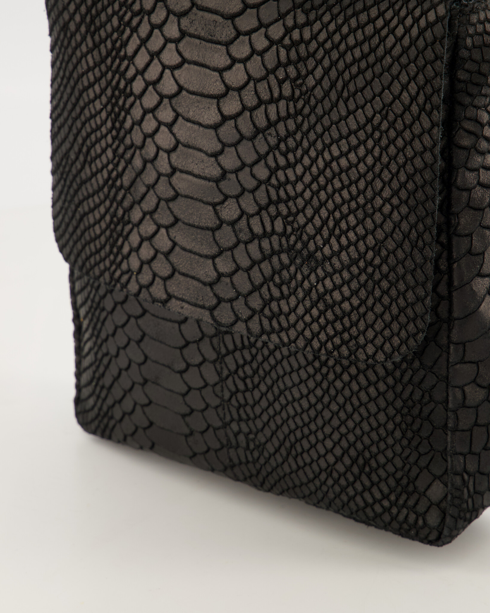 This leather crossbody with matte snake motif has a wide strap, which makes Glenn cool. There are several compartments inside the bag, including for the telephone.