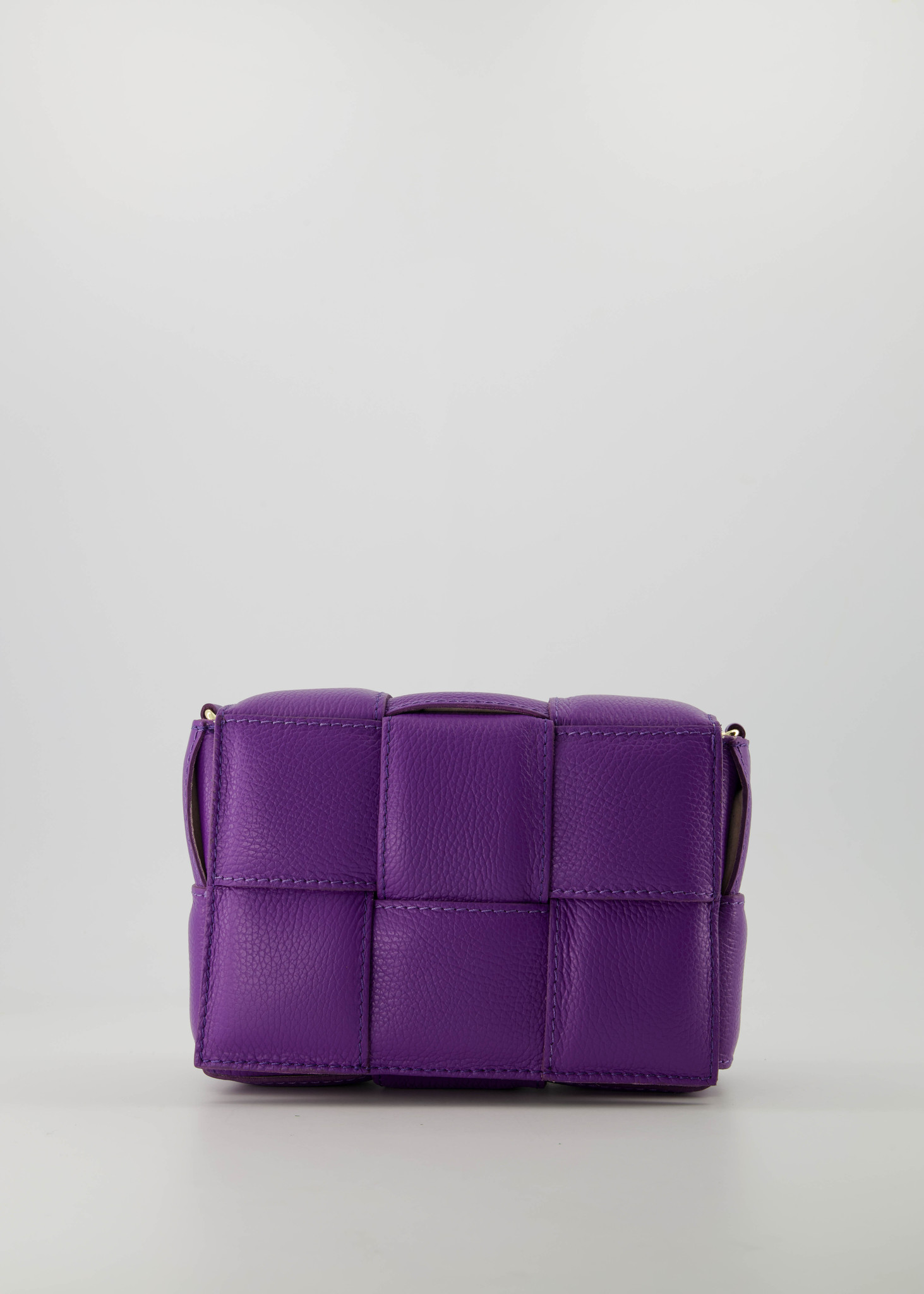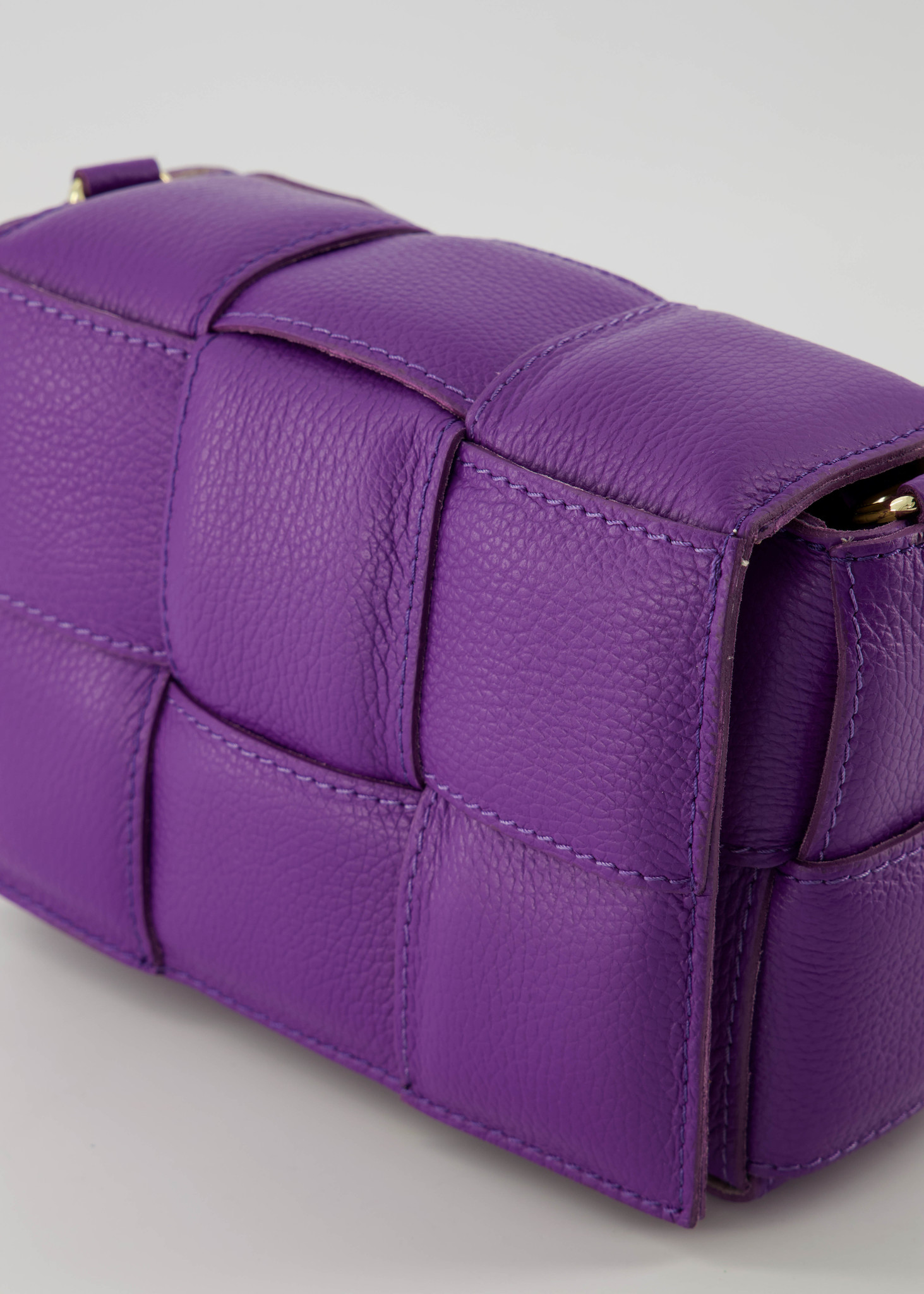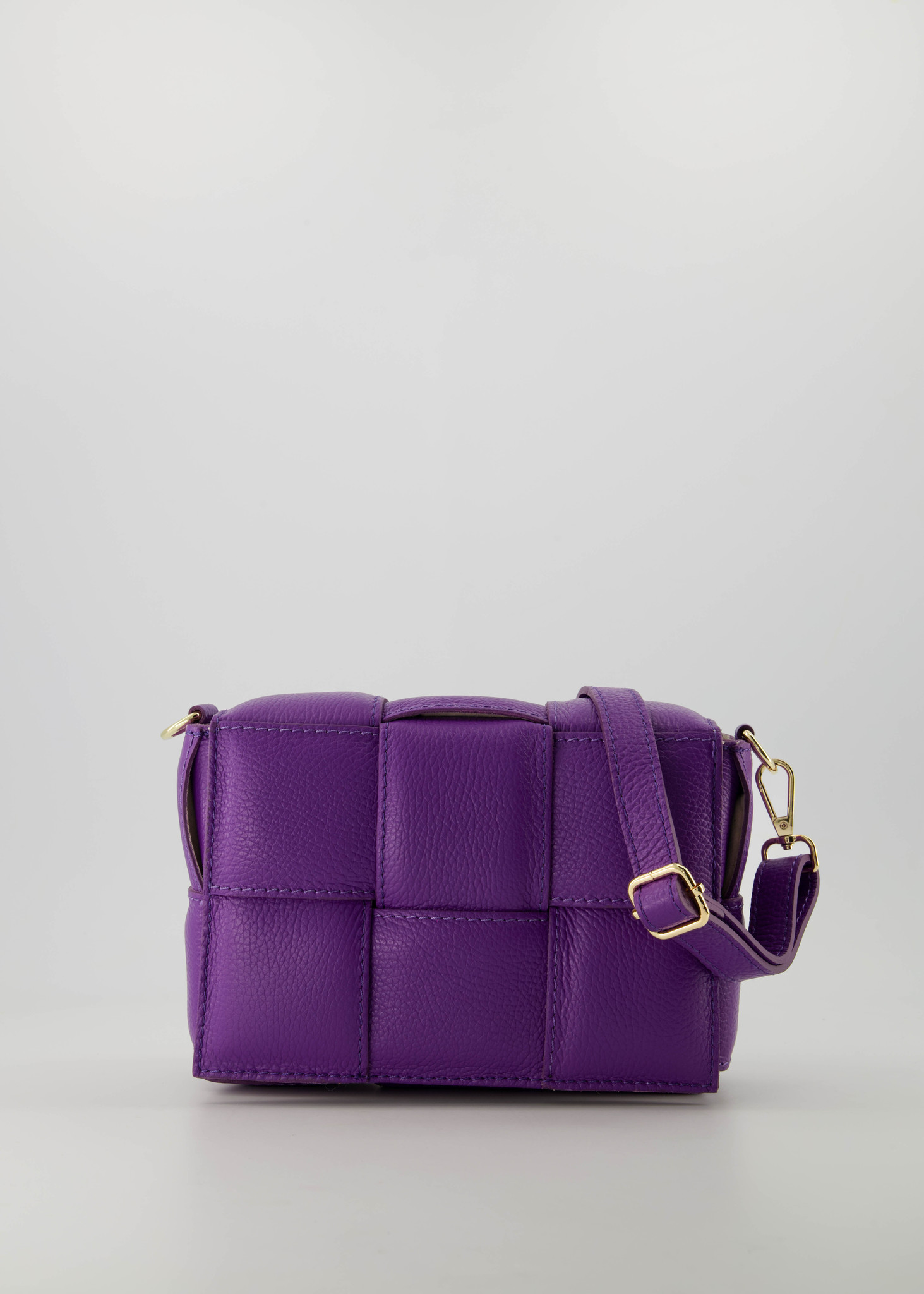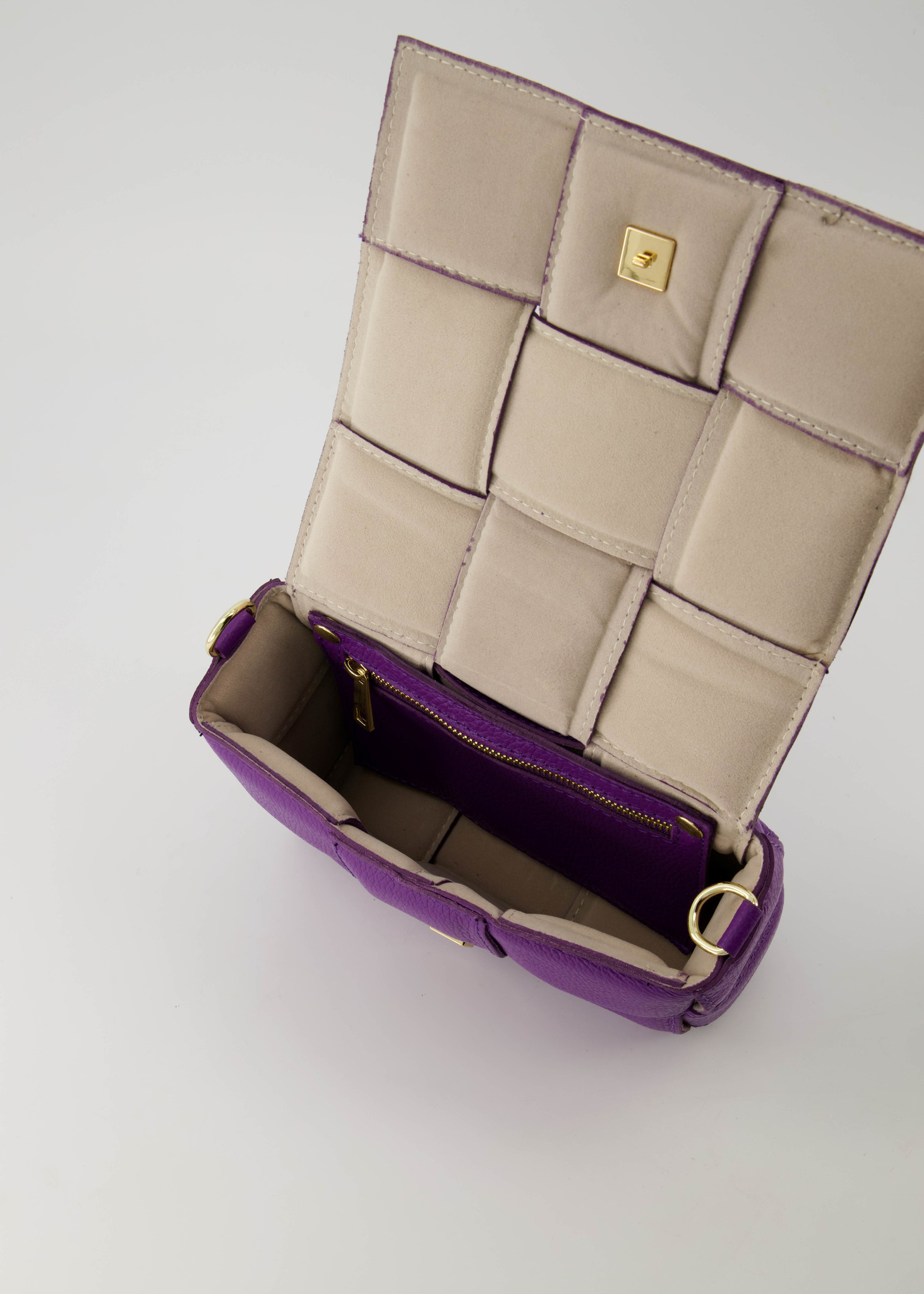 The Jess bag is made of genuine leather with a padded woven pattern. The crossbody bag has a removable and adjustable strap. The Jess closes with a click closure and has an inner compartment with a zipper pocket.