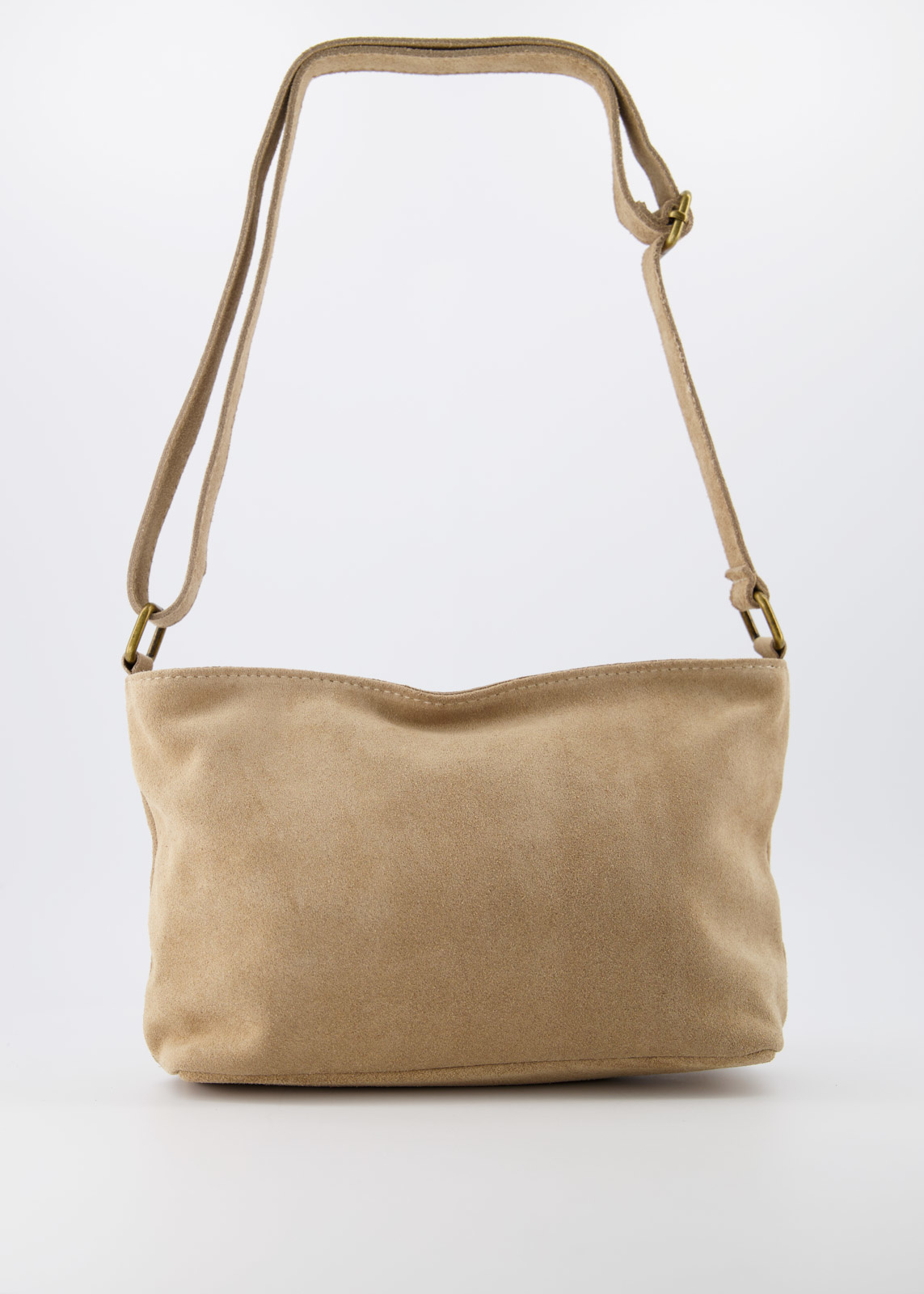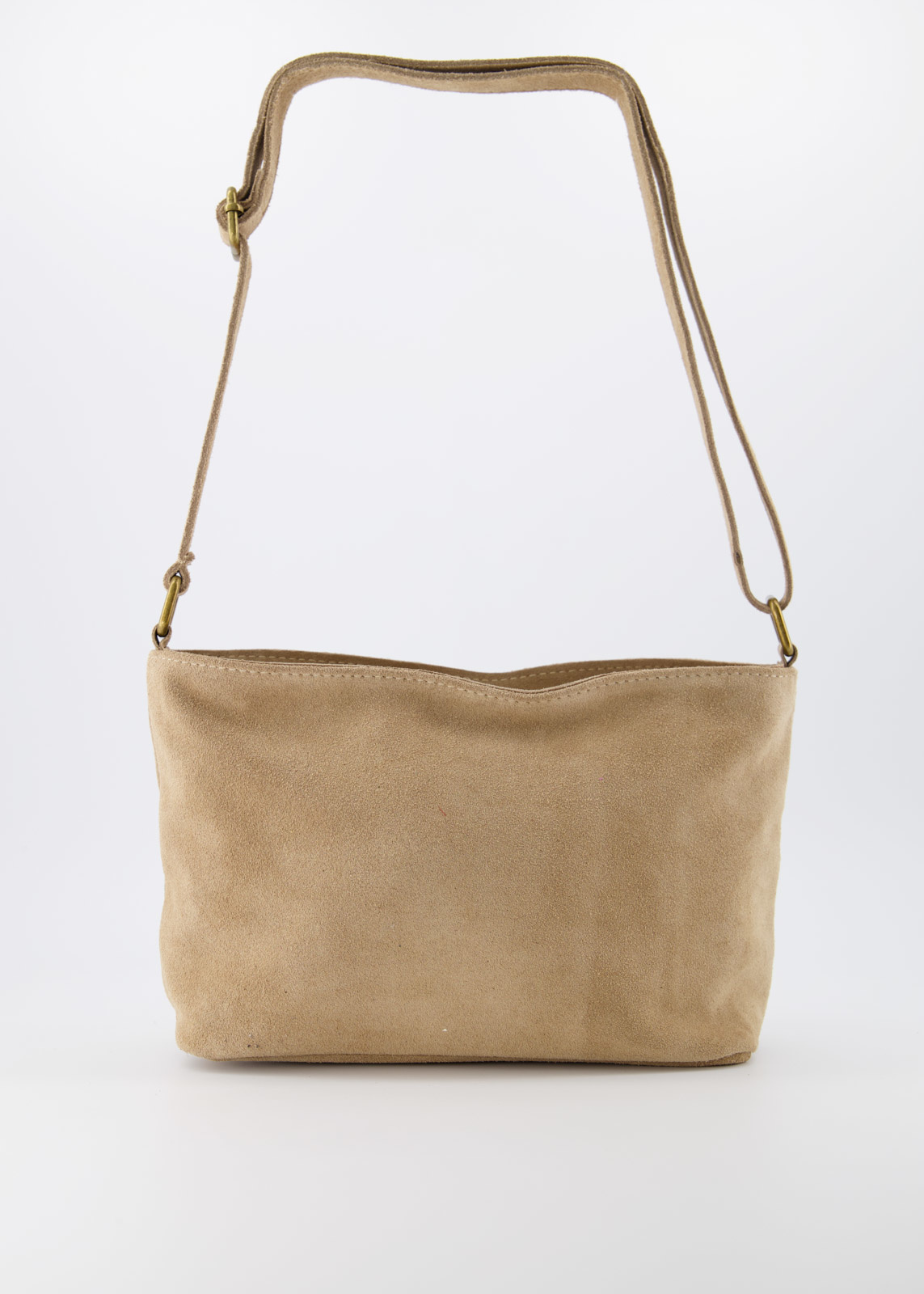 Karin is an everyday crossbody bag made of suede leather. The bag has bronze-toned hardware, which gives it a cool look. The main compartment has a zipper and on the inside is a small zipper pocket. The crossbody bag Karin has a wide, adjustable strap that is comfortable to wear over the shoulder.