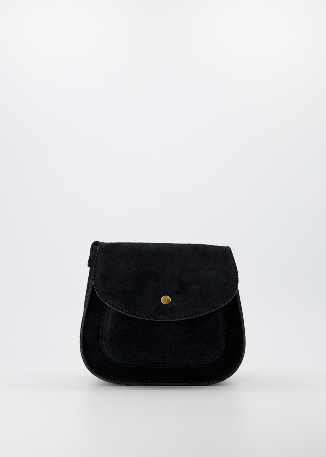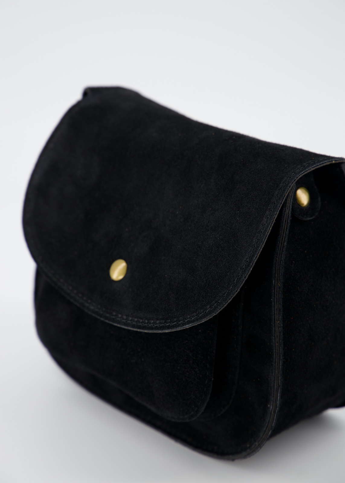 Leather suede crossbody bag with a flap and a pocket on the front. There is a zipper on the inside. The bag has an adjustable long handle.
