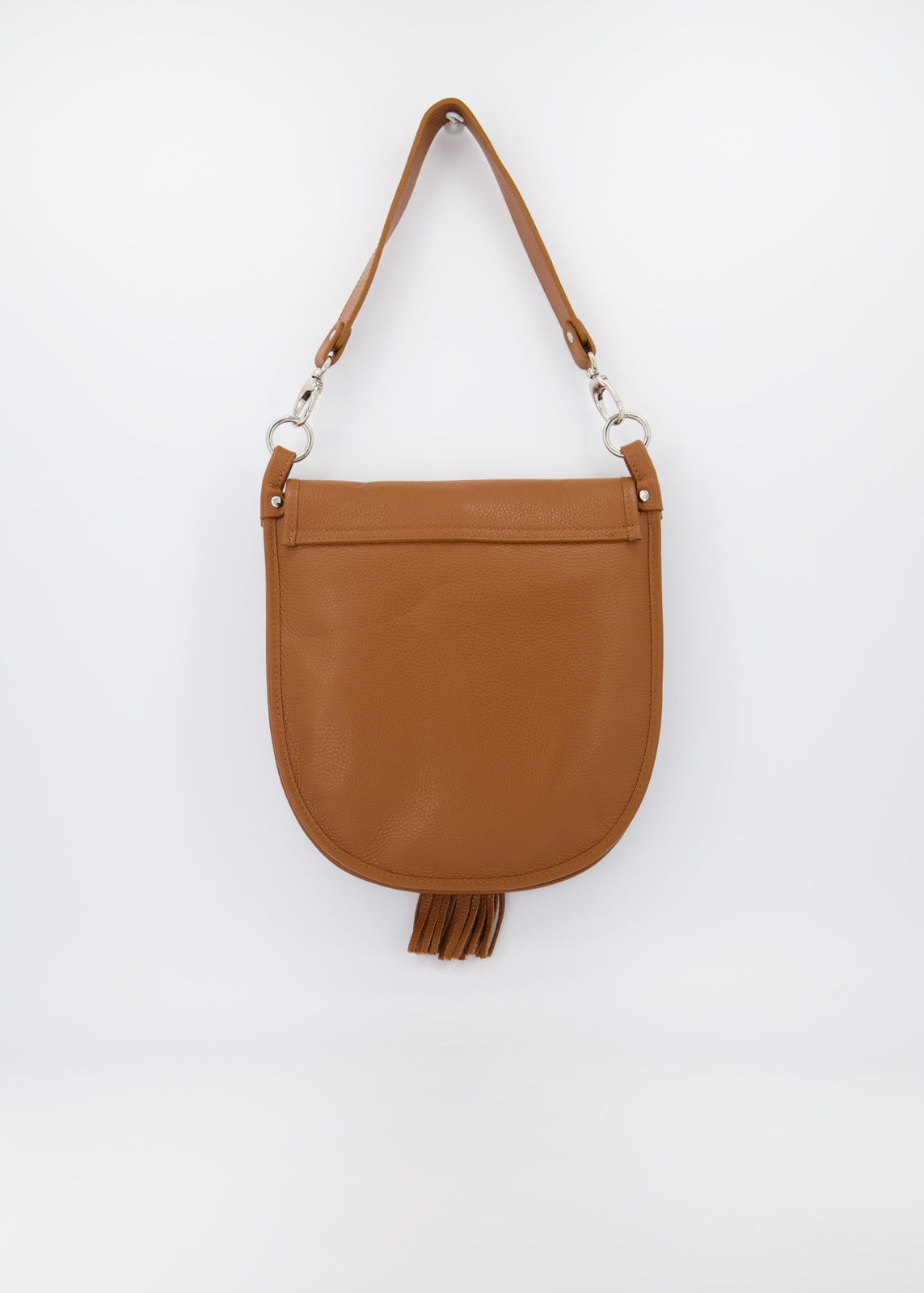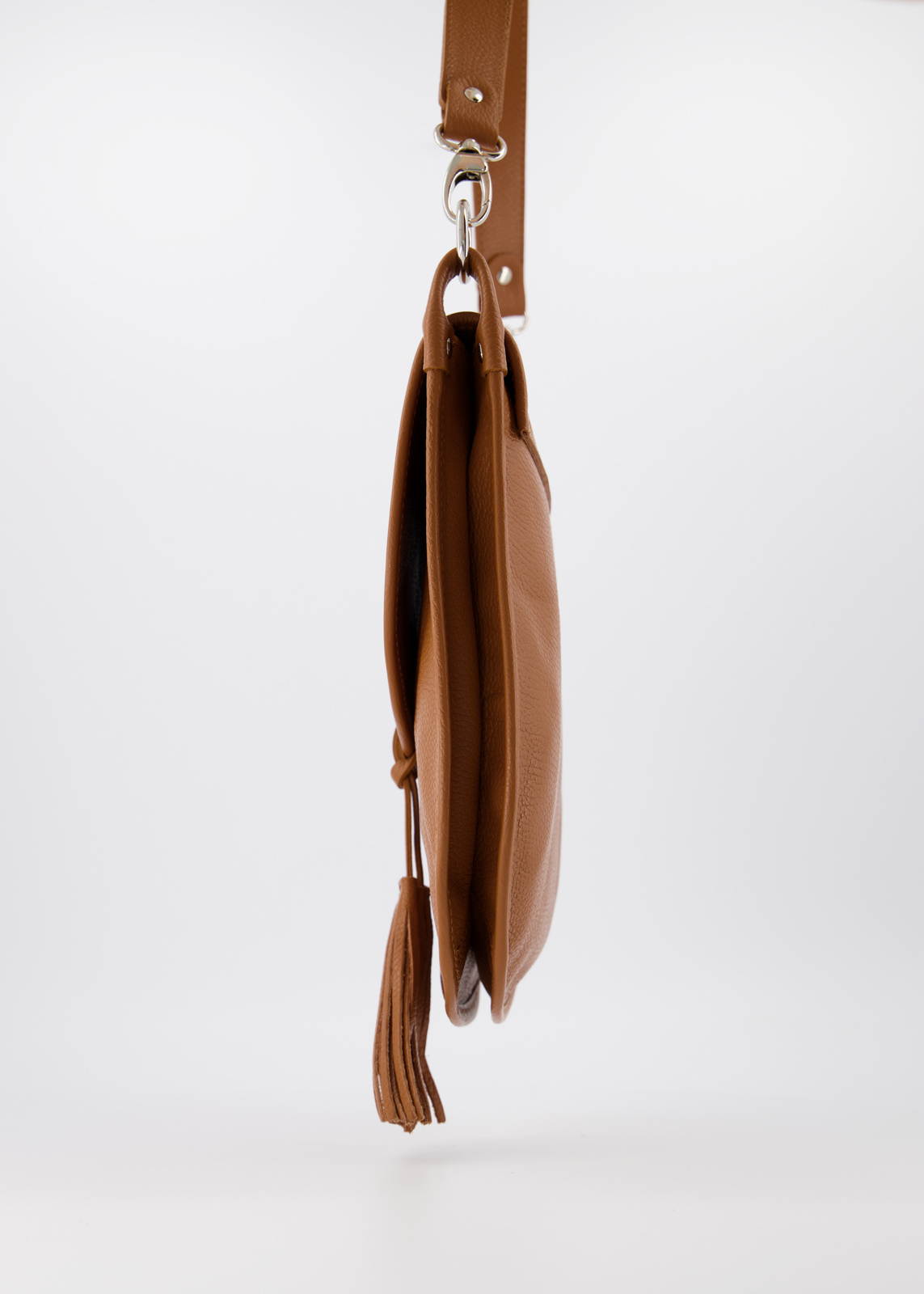 Leather crossbody bag that comes with two strap: a shorter one to wear as schoulder bag and a longer adjustable one from cotton. The bag consists of two pockets, inside these pockets there are smaller pockets.