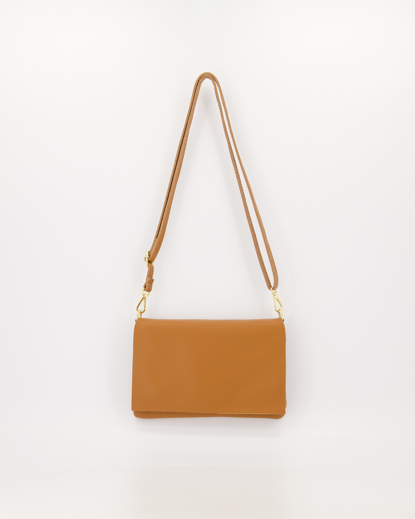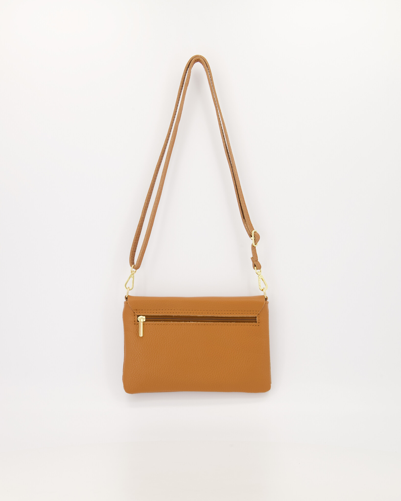 Myra is a leather crossbody bag with a large inner compartment and a pocket at the back with a zipper. The bag has a removable and adjustable handle.