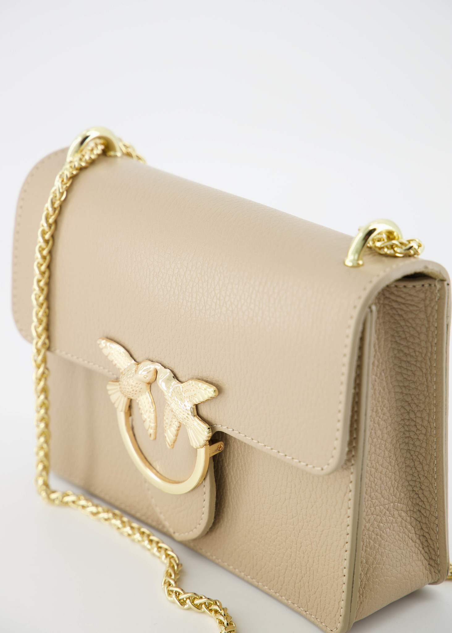 Leather crossbody bag with a bird buckle and magnetic closure. The bag has an inner pocket and a small inner pocket. The Paisley bag has a long chain handle.