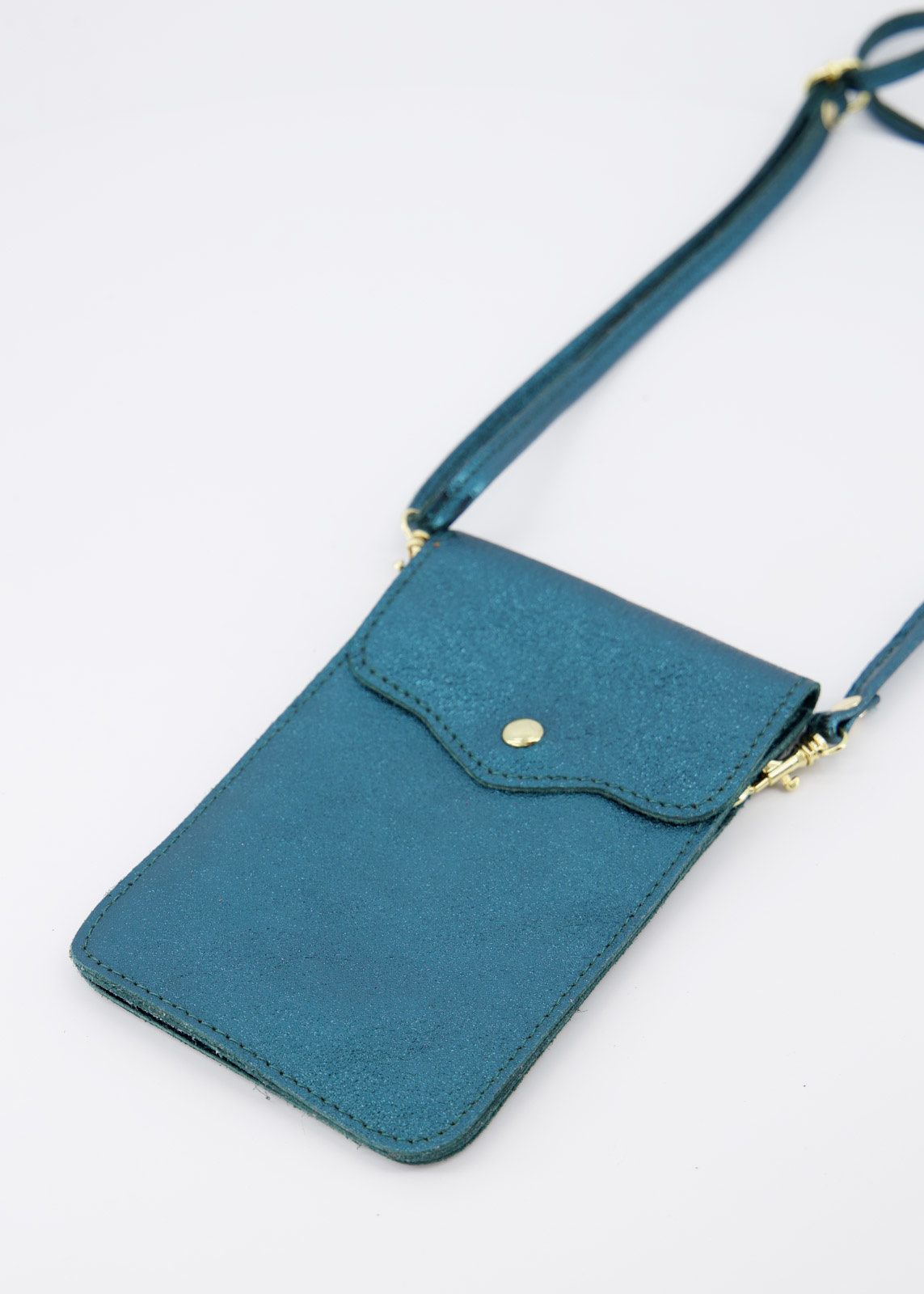 Leather phone bag with two pockets on the inside. It fits a passport. The bag has a long strap.