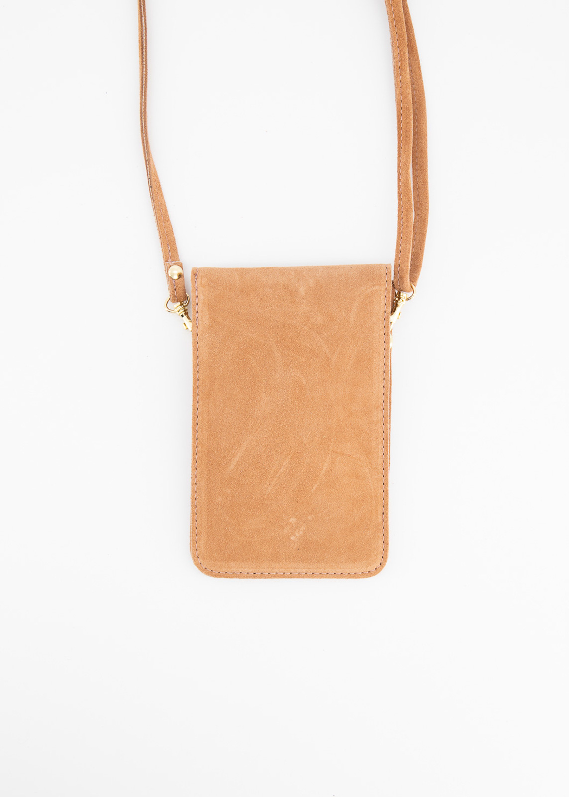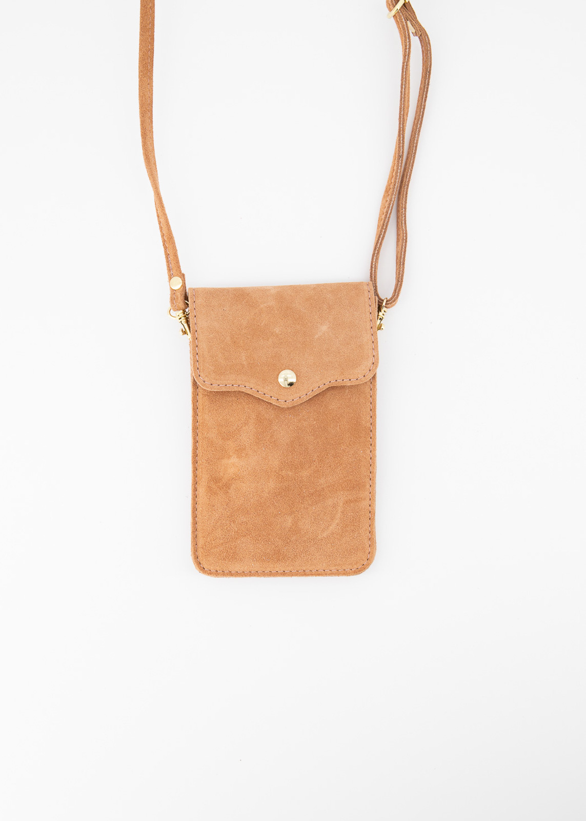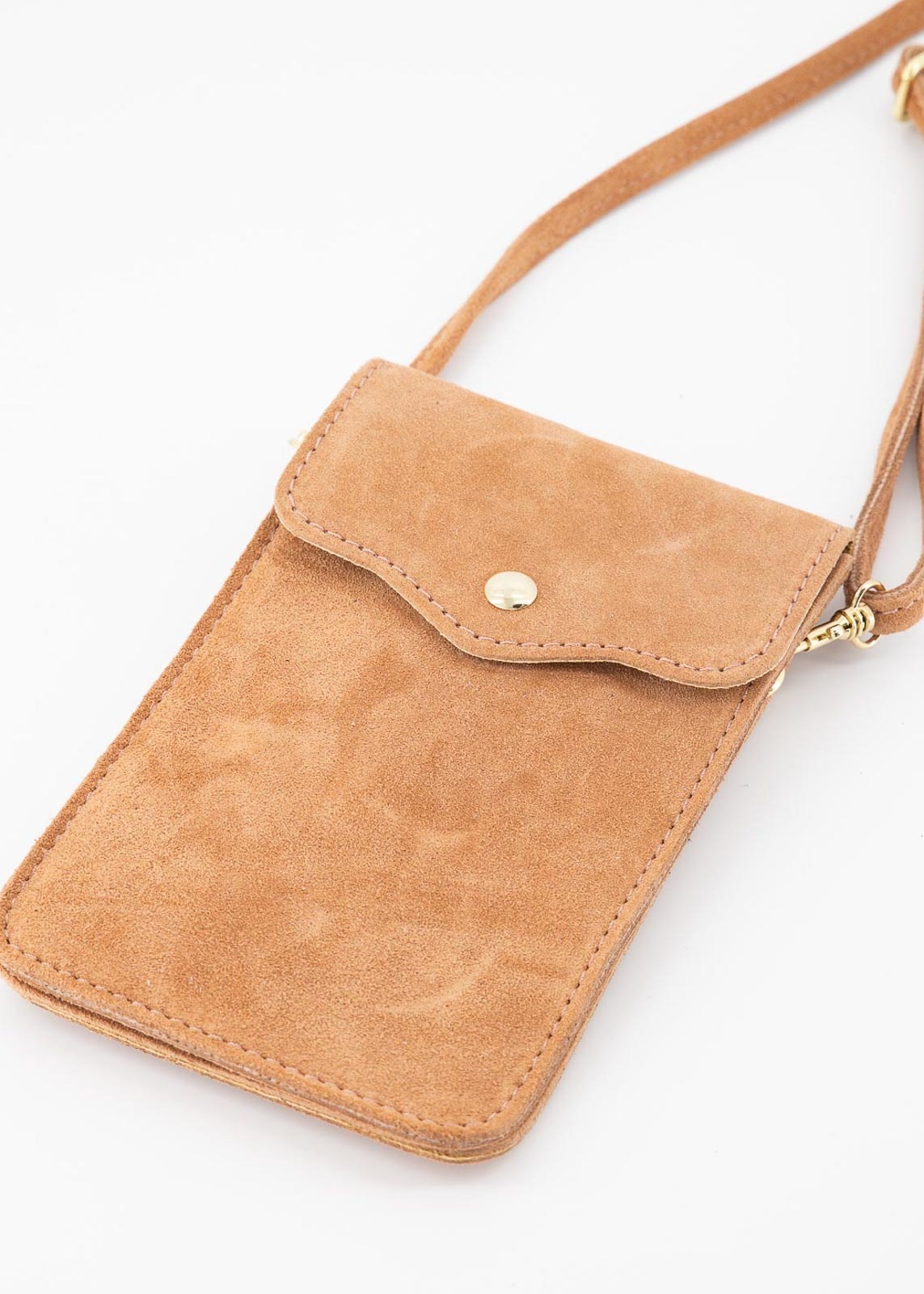 Leather phone bag with two pockets on the inside. It fits a passport. The bag has a long strap.