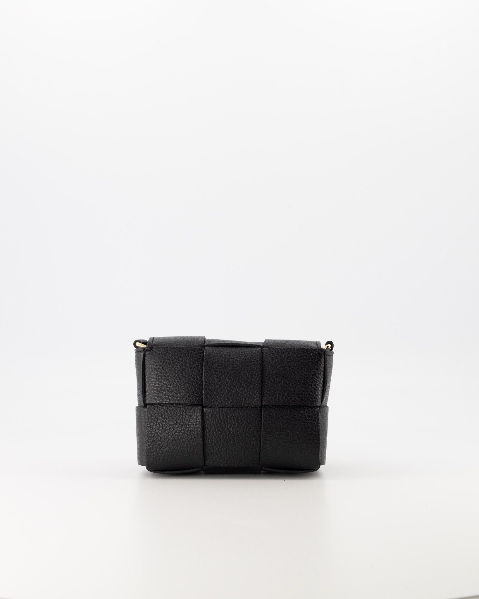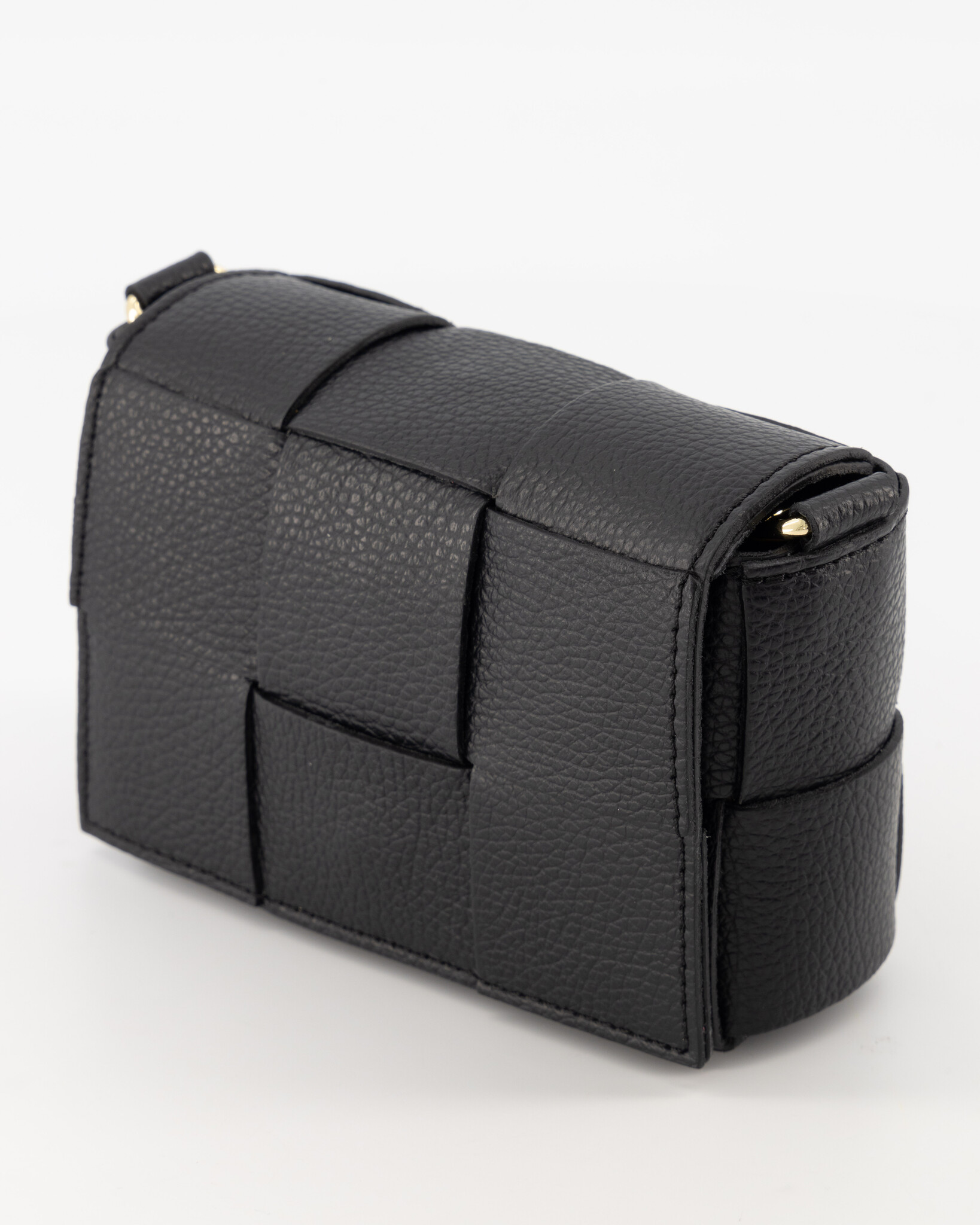 The Steef bag is made of genuine leather with a padded woven pattern. The crossbody bag has a removable and adjustable strap. The Steef closes with a click closure and has an inner compartment with a zipper pocket.