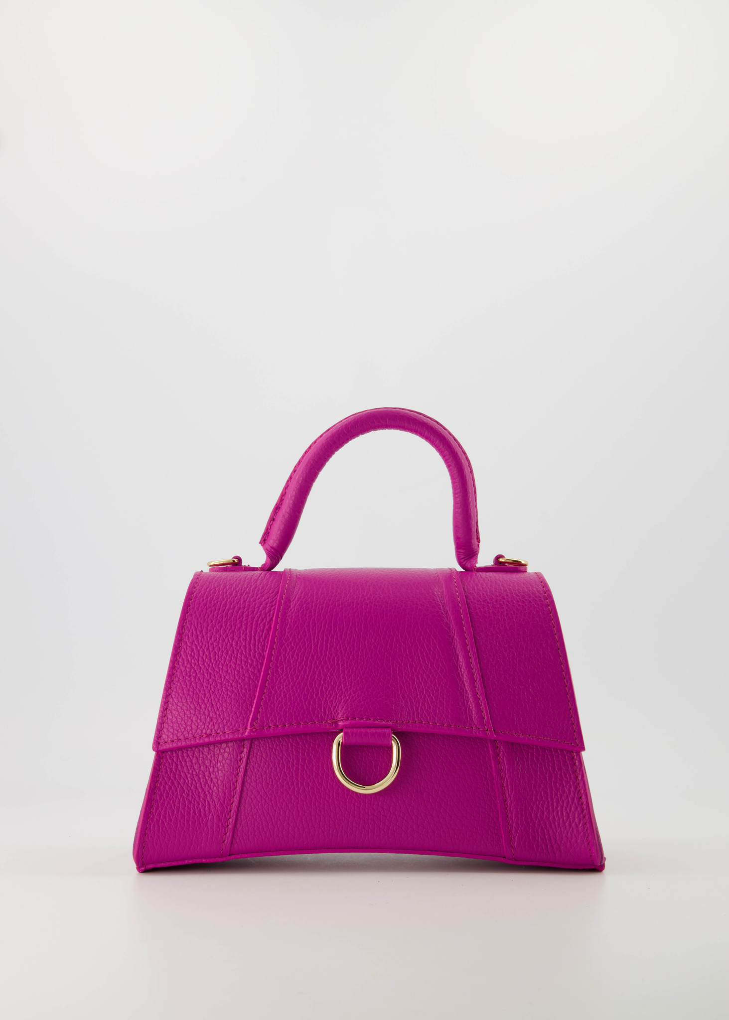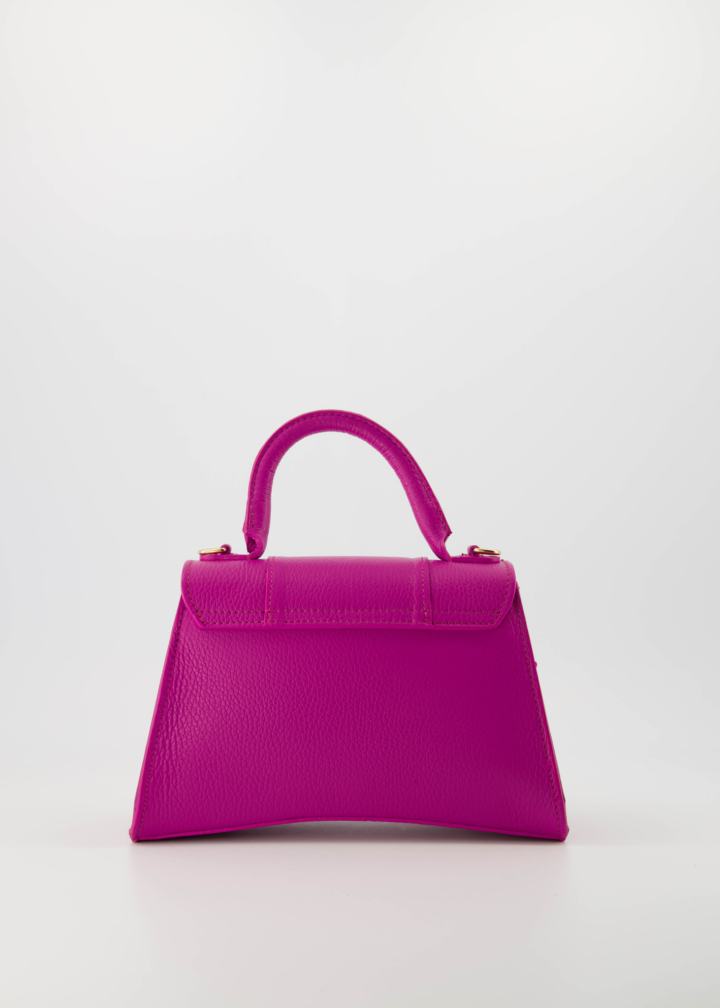 Leather handbag in an hourglass shape with handle at the top. Can also be worn as a crossbody bag. Available in various colours.