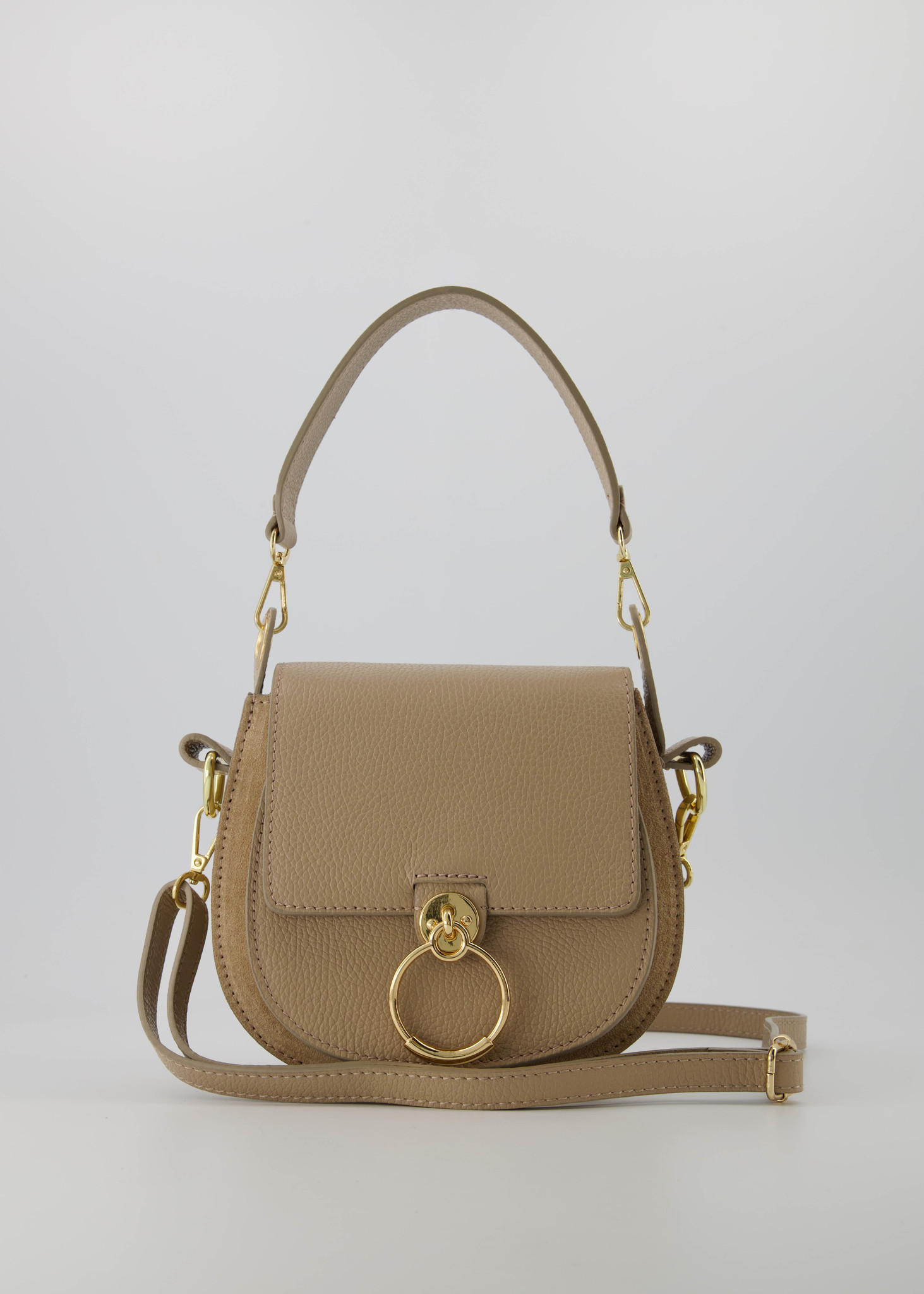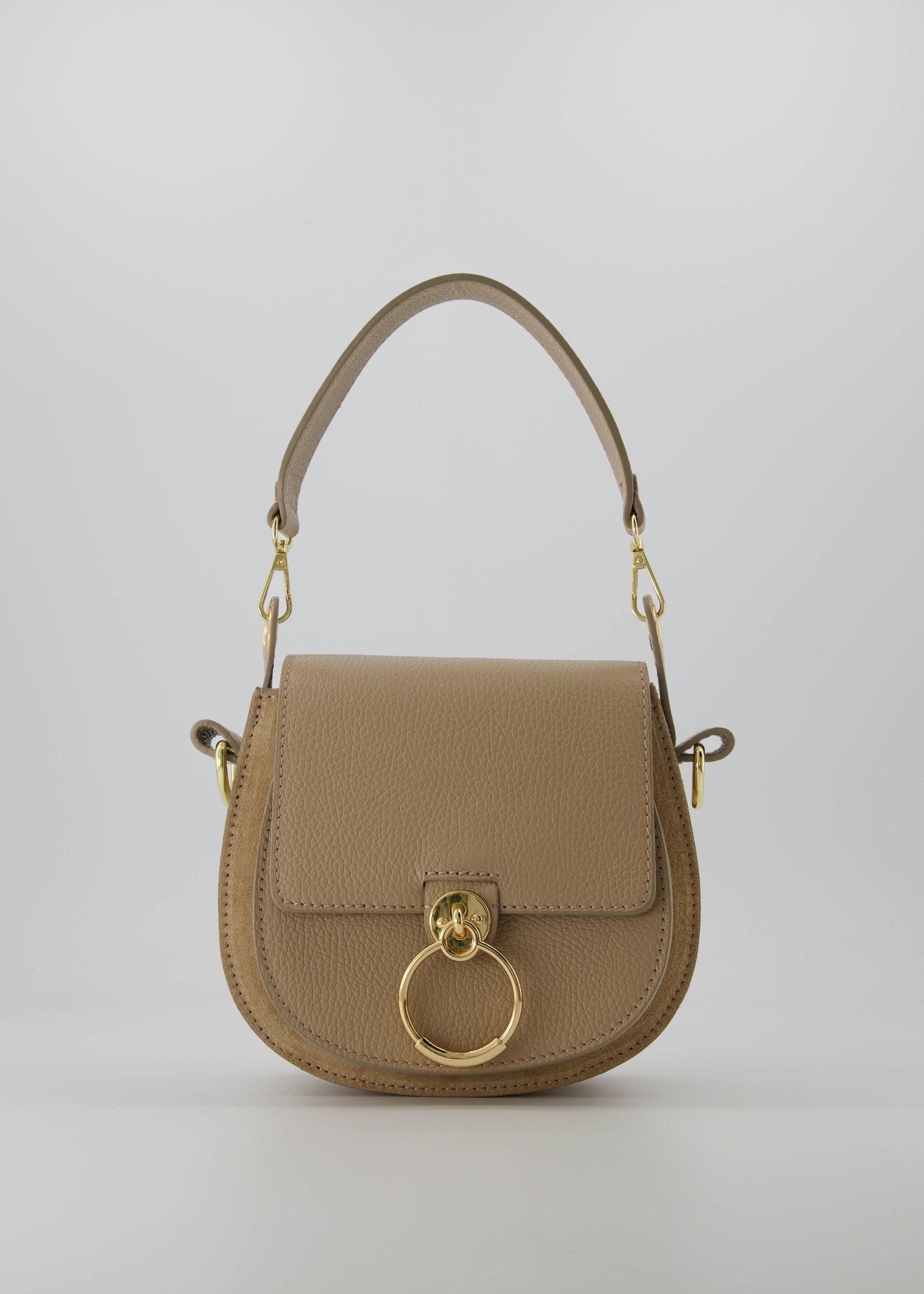 Gianna is a leather handbag that can also be worn as a crossbody bag. The bag comes with 2 handles, a wider short and a longer detachable and adjustable handle. The bag is made of genuine leather with suede details. The Gianna handbag in the colour taupe is closed by a magnetic closure.