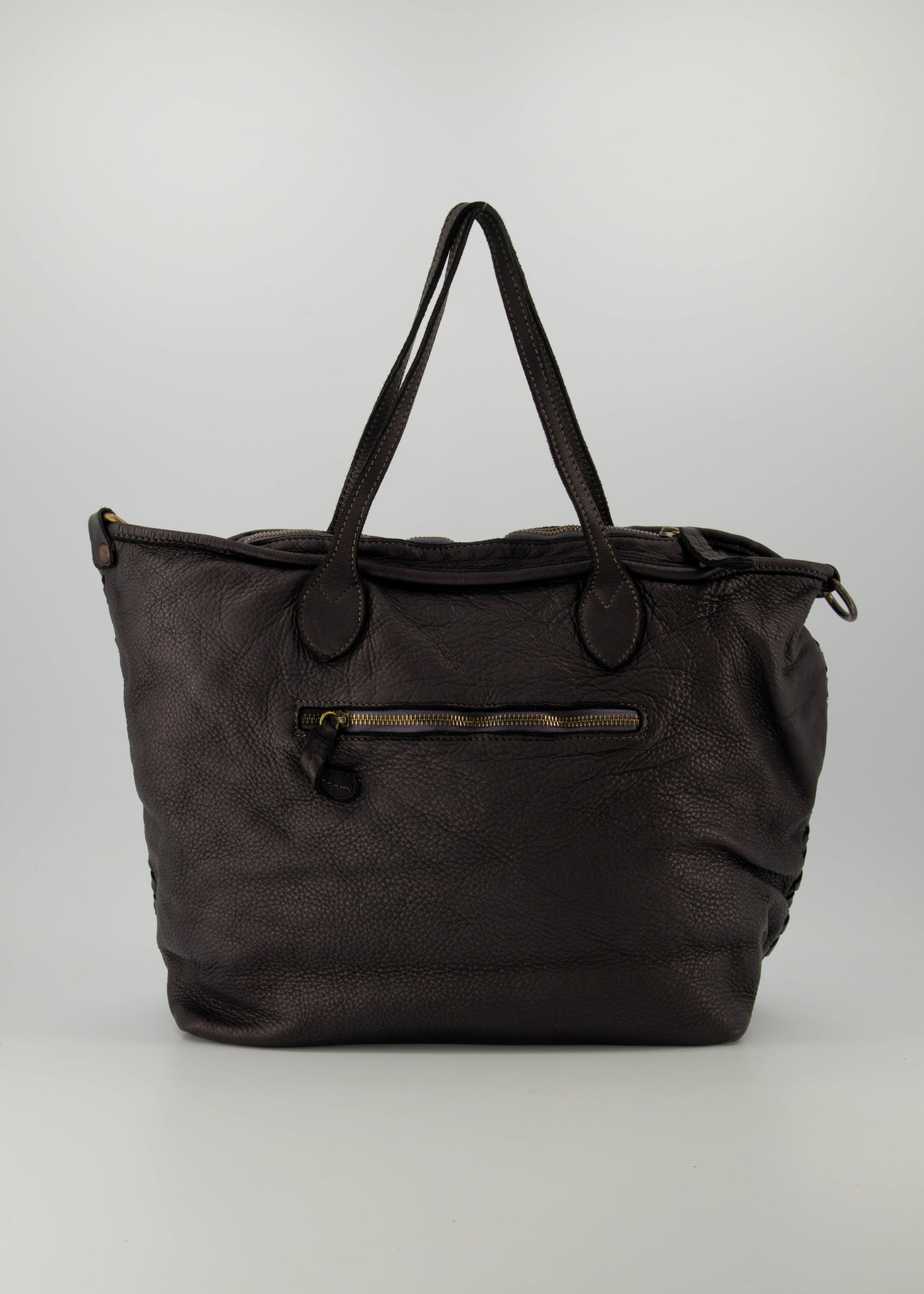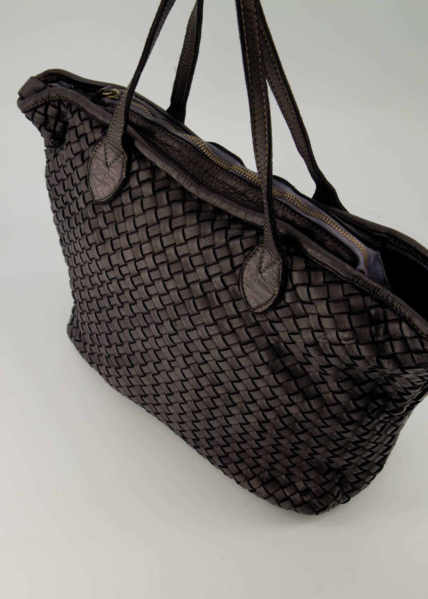 Jenna is a washed leather handbag with a zipper that can also be worn as a crossbody bag and shoulder bag. The bag has a braided pattern on the front and a zipper pocket on the back. The handbag comes with a detachable and adjustable leather strap. The Jenna bag has a large main compartment with a lockable slip pocket and 2 slip pockets.