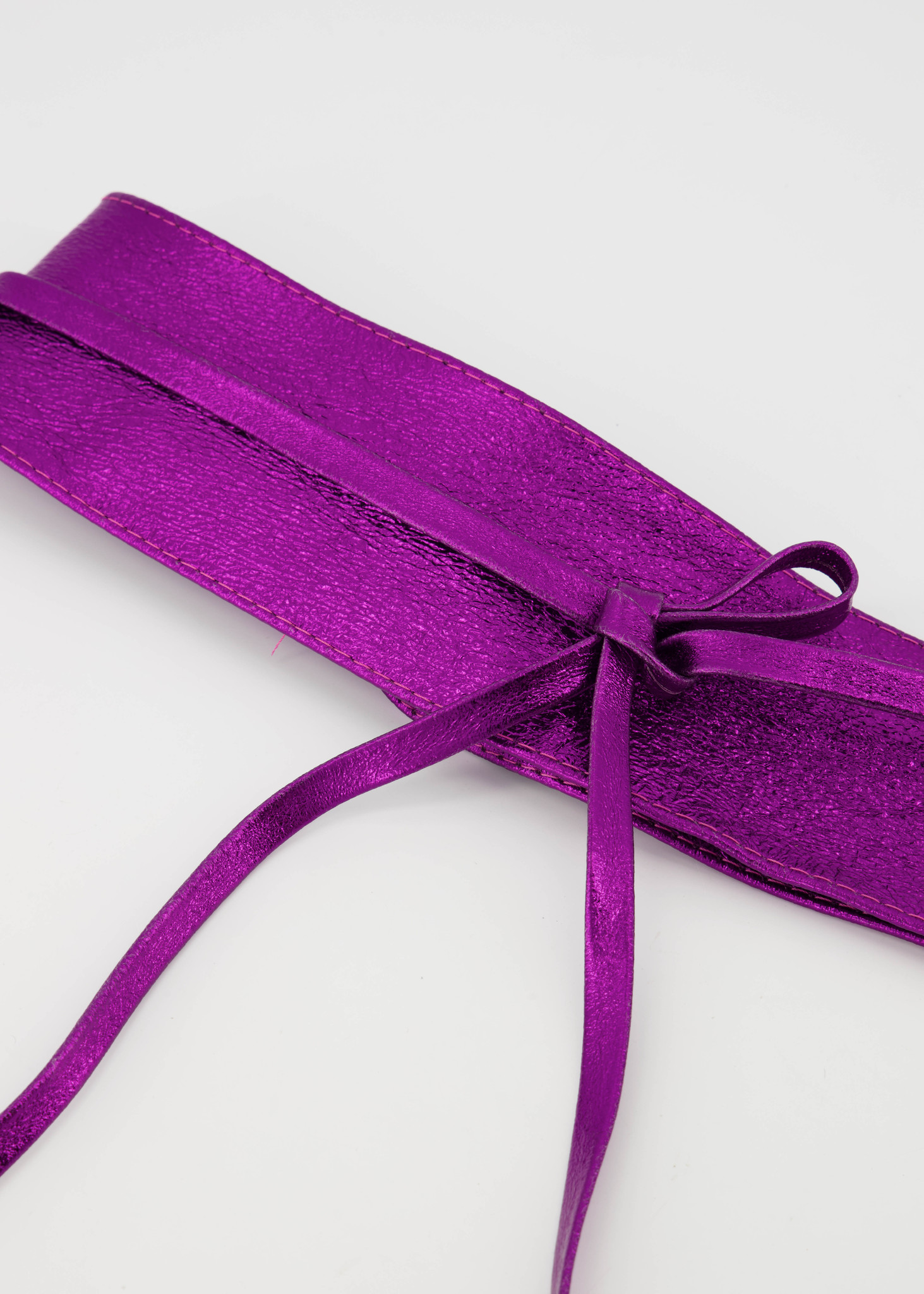 Lily is a leather wrap belt in a metallic finish. The belt is 8 cm wide and the waist part is 85 cm long. With the strings, the belt can be tied around the waist in a playful way. The wrap belt is available in one size.