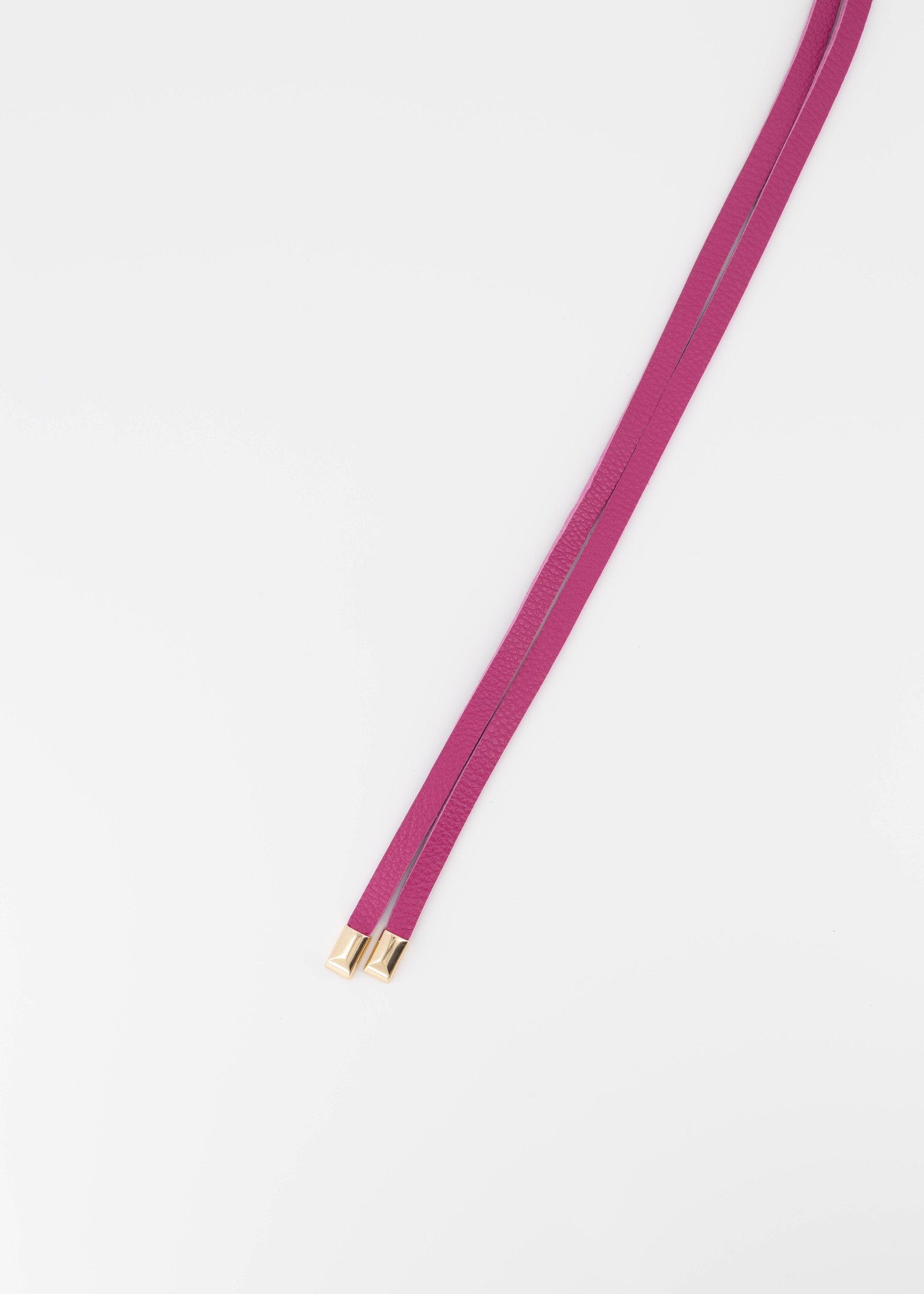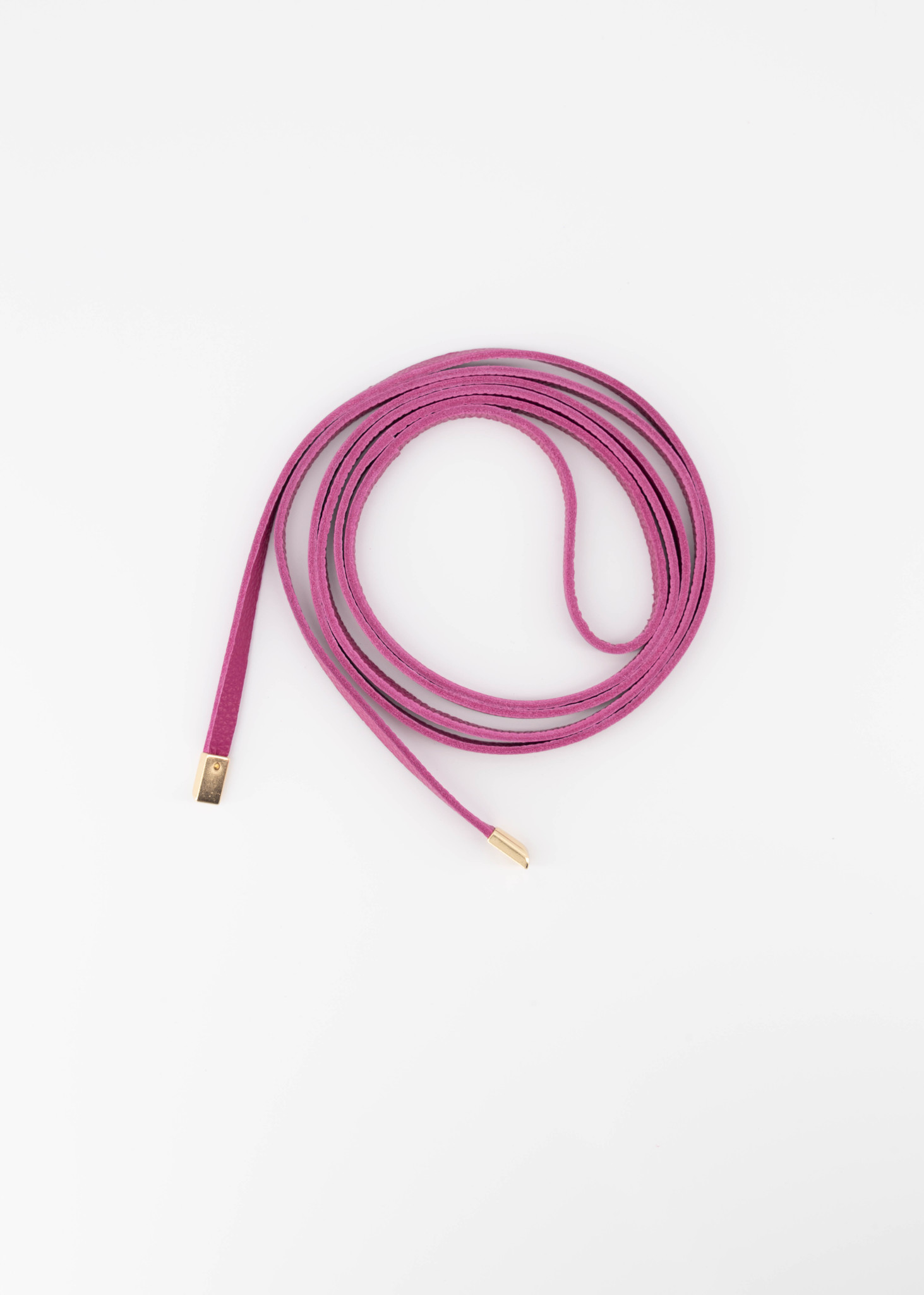 The Lucia wrap belt in the color pink is made of genuine leather. The wrap belt with rope closure can be tied in different ways. Lucia is available in one size: + - 248 cm long and 1 cm wide.