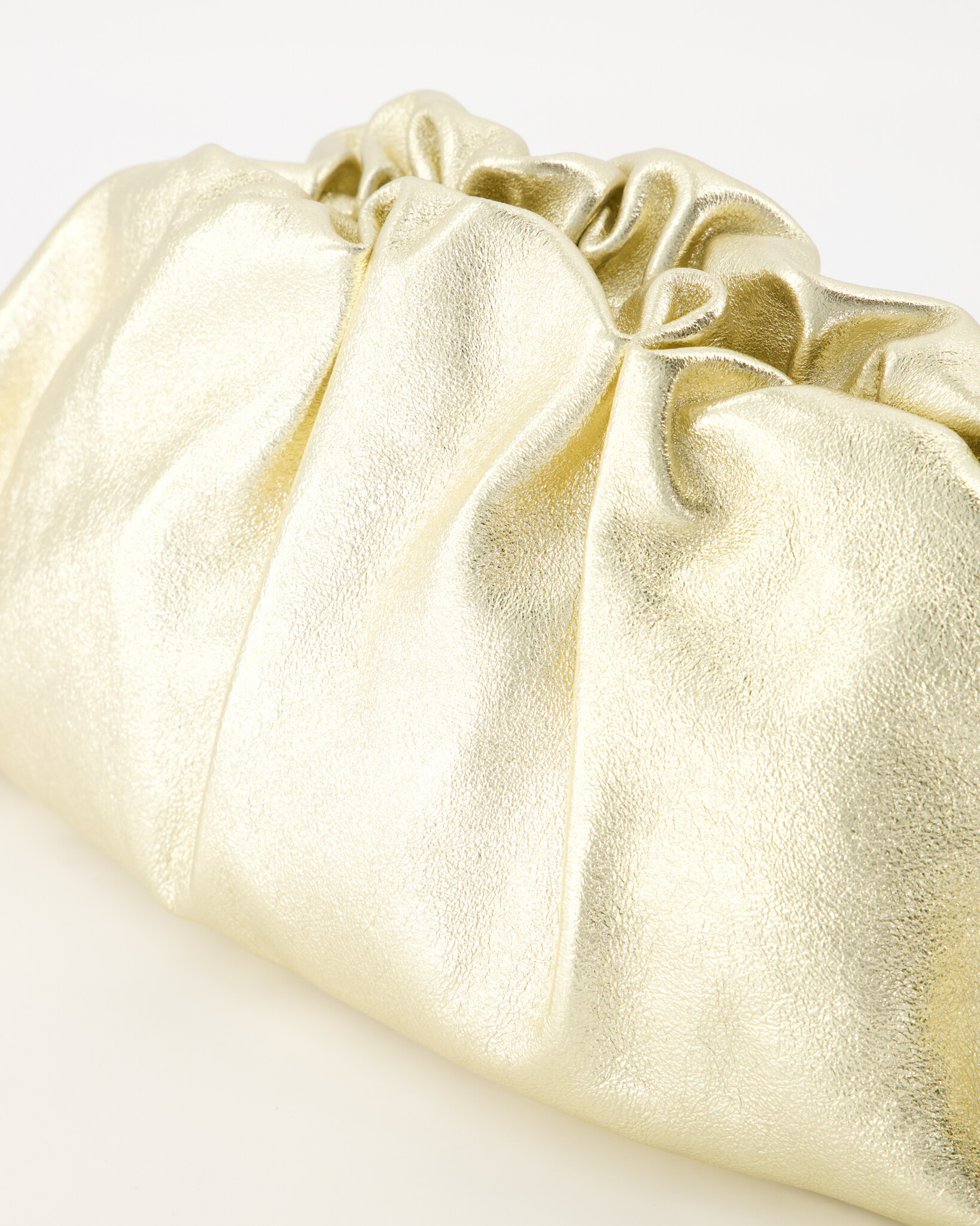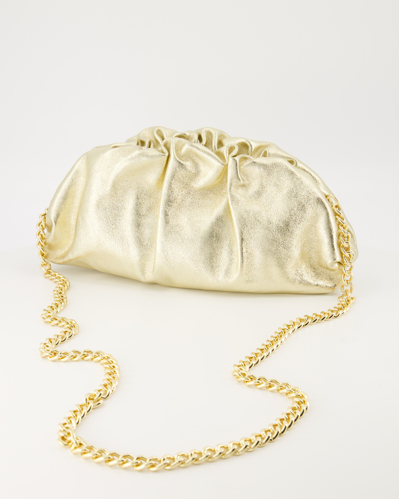 Maxime is een metallic leren clutch gemaakt van genuine leer. Deze clutch is ideaal voor een gala of avondje uit. De Maxime tas kan ook gedragen worden als crossbody tas en heeft een afneembaar ketting hengsel afgewerkt met goudkleurige hardware. De tas heeft een binnenvak die gesloten wordt door een beugelsluiting met aan de binnenzijde een ritsvakje.