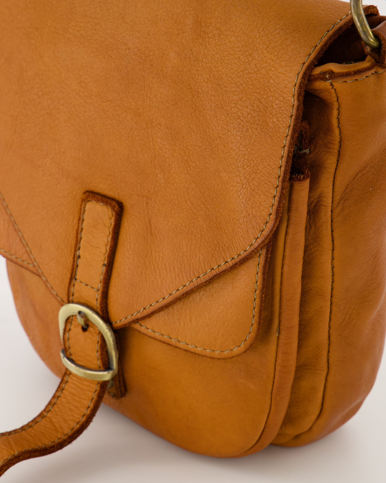 Washed leren crossbodytas met een magneetsluiting en een lang verstelbaar hengsel.