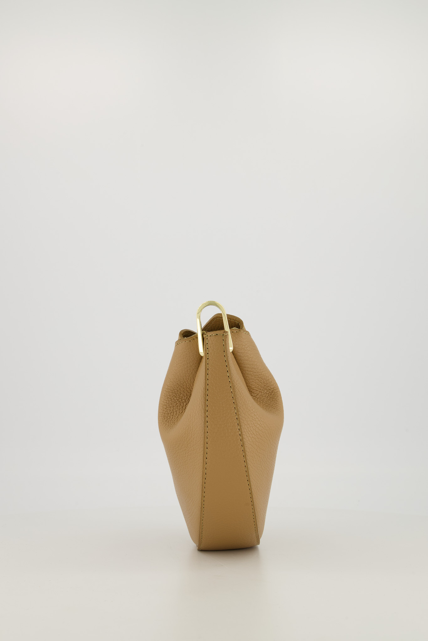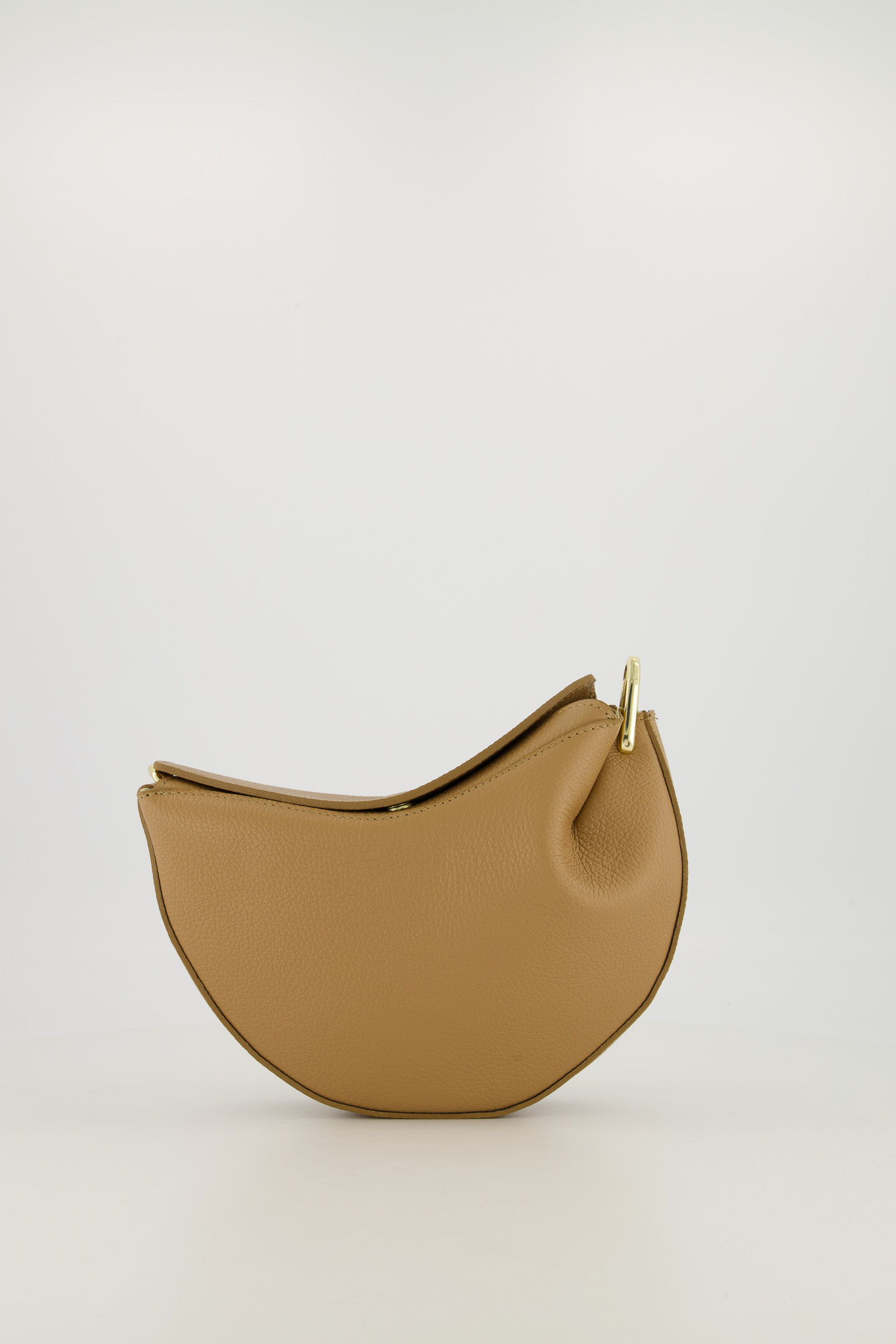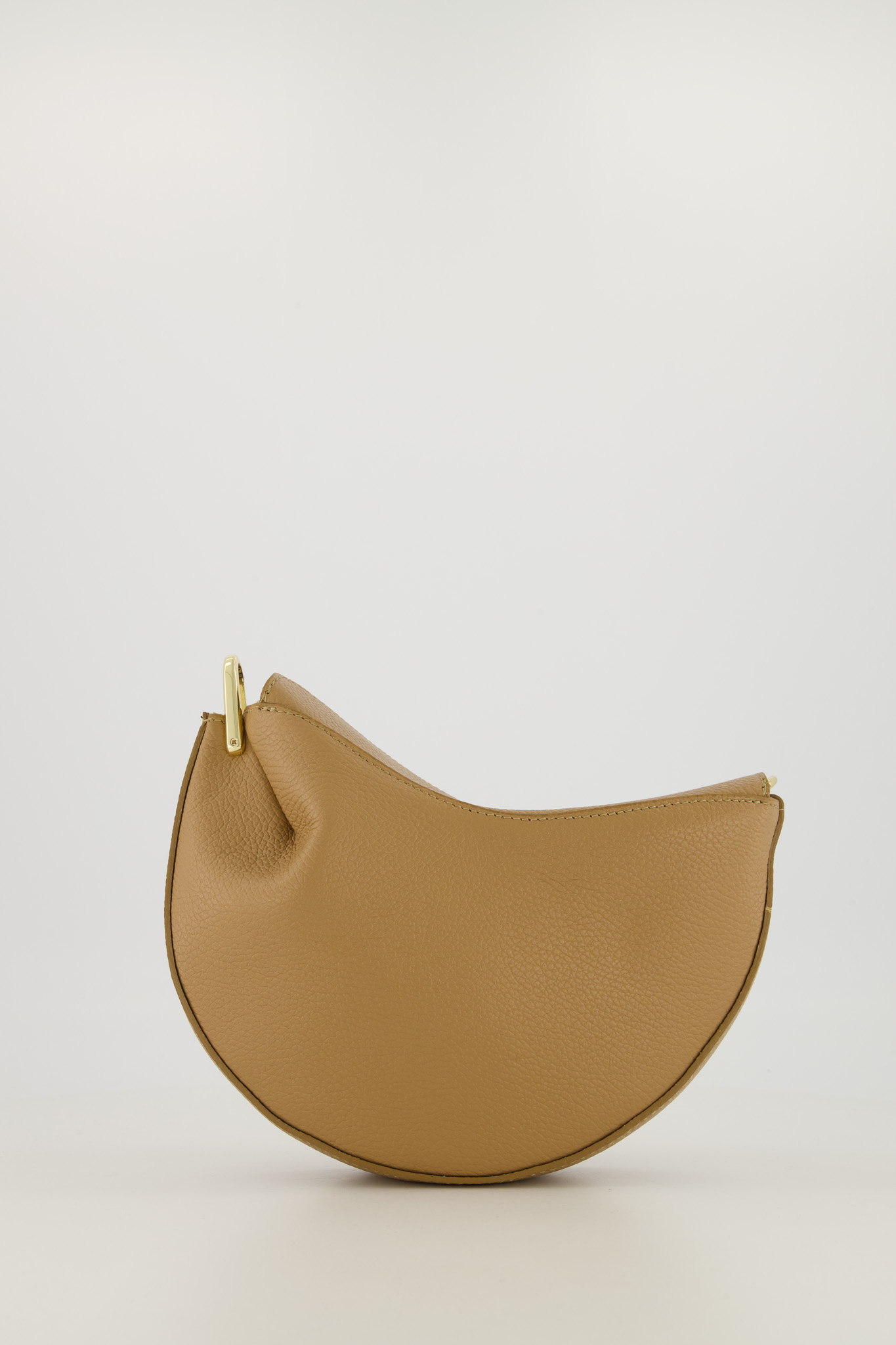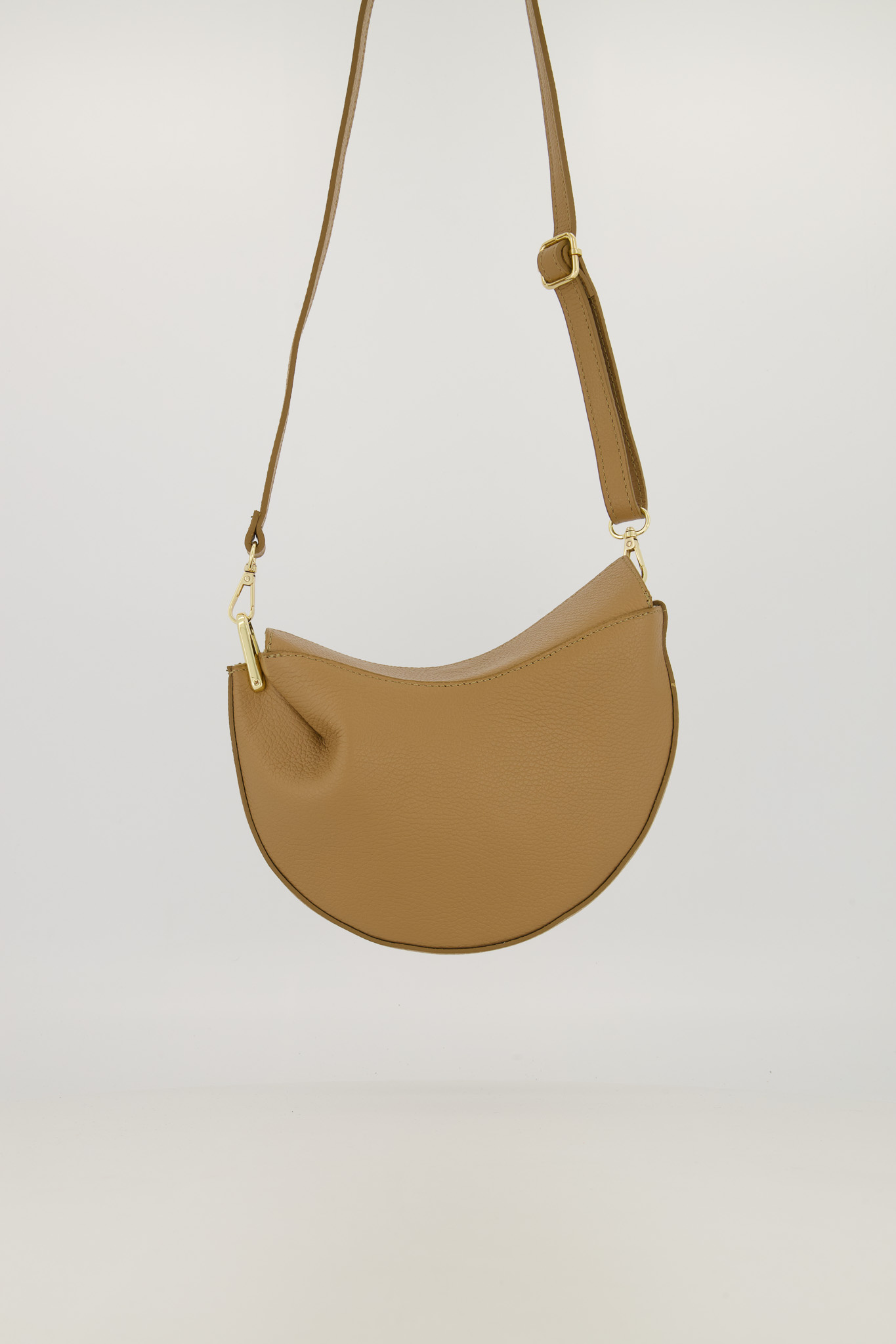 De Cookie Bag is een trendy halfronde tas van Italiaans leer met goudkleurige details. Voorzien van een verstelbare leren schouderriem en een ruim hoofdvak met ritsvakje aan de binnenkant. Sluit met een magneetsluiting voor een stijlvolle en praktische look