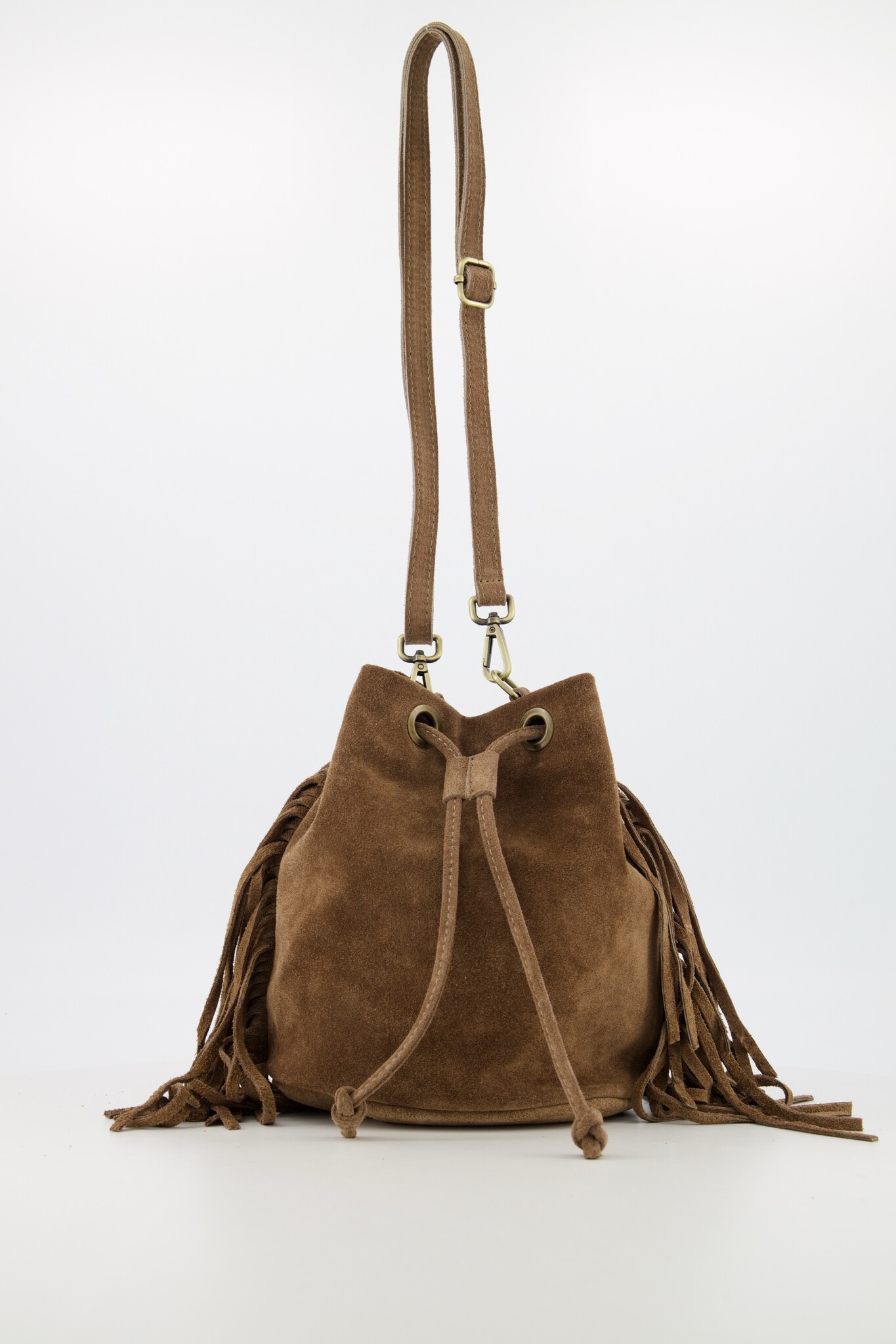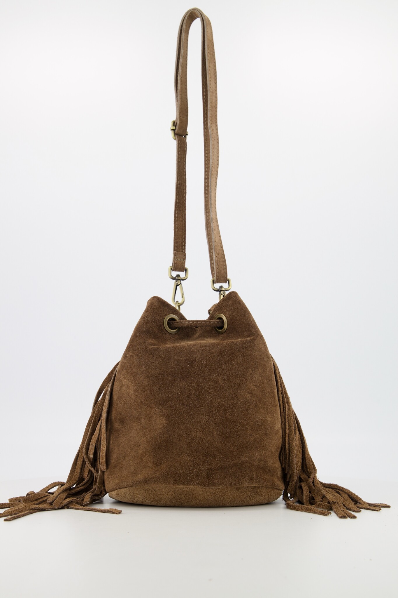 De Hazel is een stijlvolle tas van zacht suède leer voorzien van een afneembaar en verstelbaar hengsel, geschikt om crossbody of over de schouder te dragen. Het hoofdvak sluit met een magneetsluiting en een trekkoord en heeft binnenin een handig ritsvakje. De franjes aan de zijkanten geven de tas een trendy touch. Ideaal voor modewinkels en boetieks die op zoek zijn naar tijdloze, hoogwaardige accessoires.