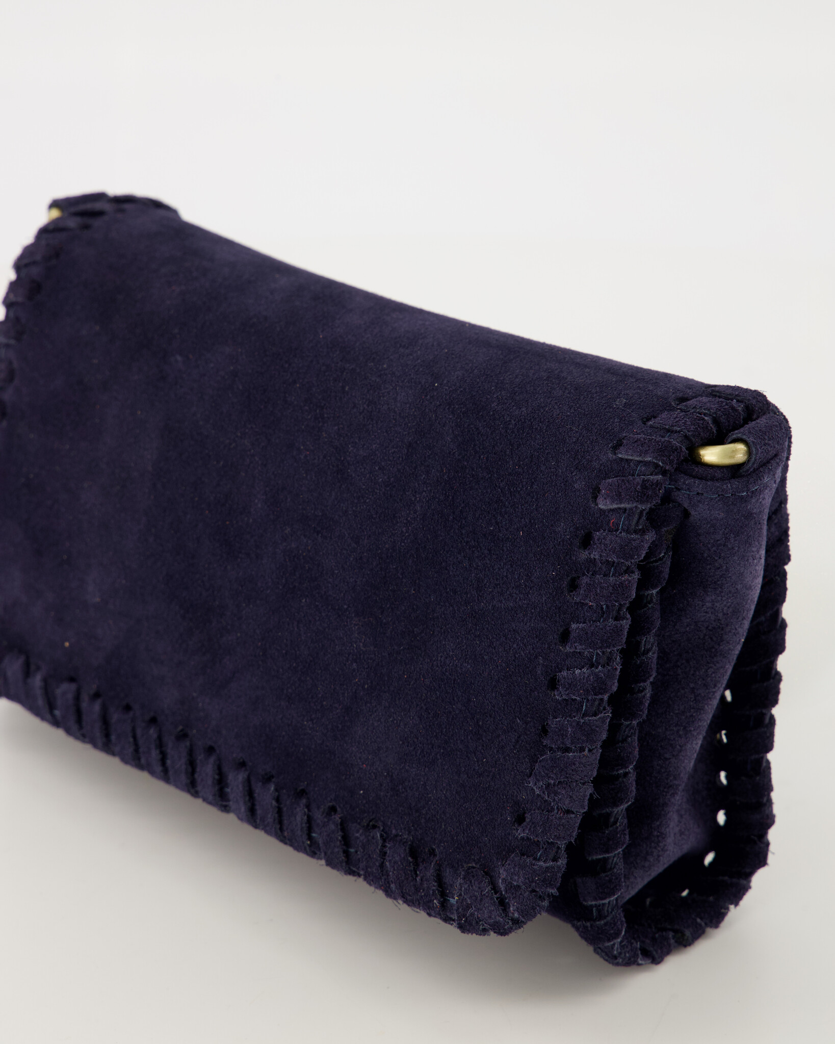 Romee is een suede leren crossbody tas voorzien gevlochten details rondom de tas. De tas heeft een afneembaar en verstelbaar hengsel.