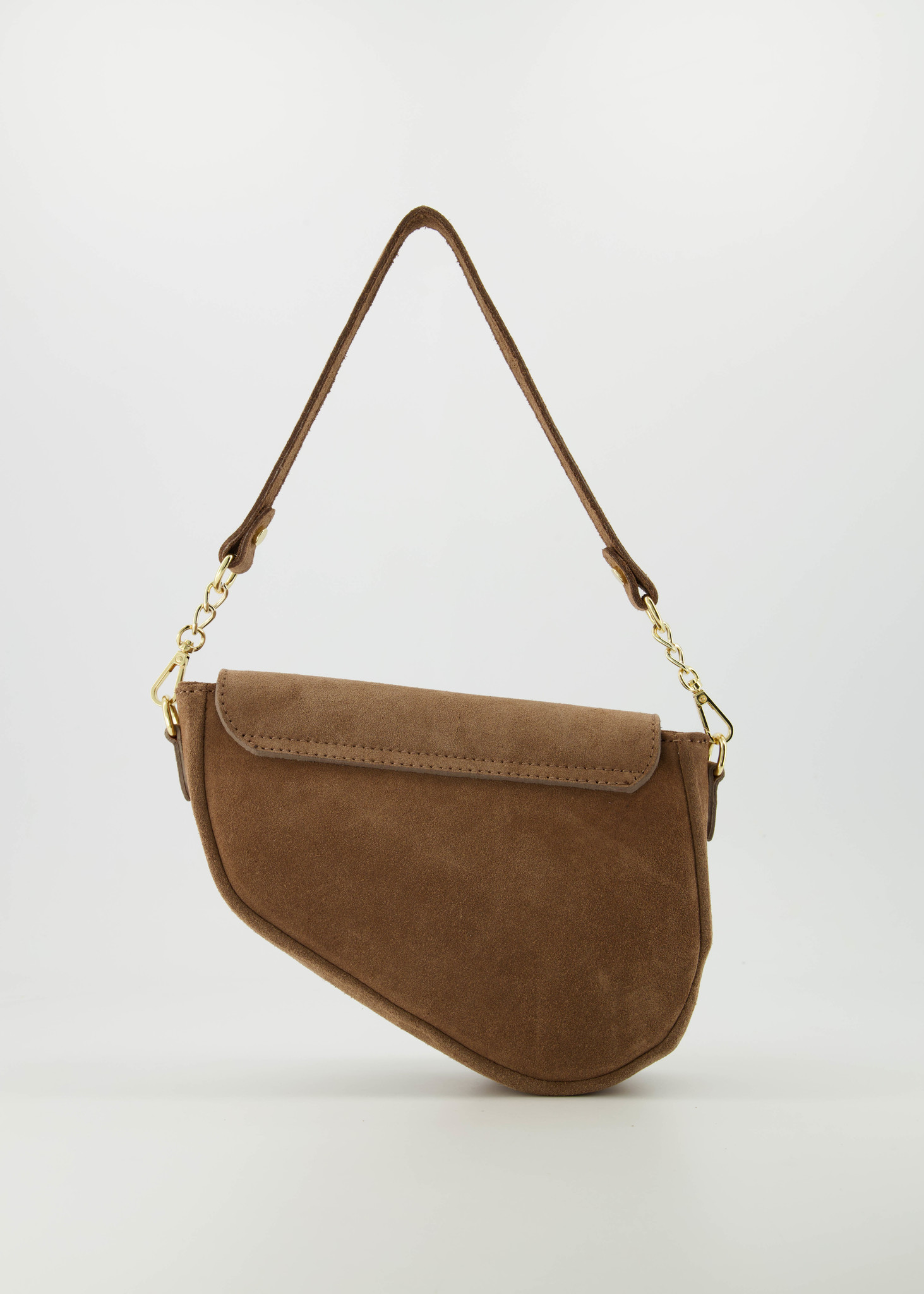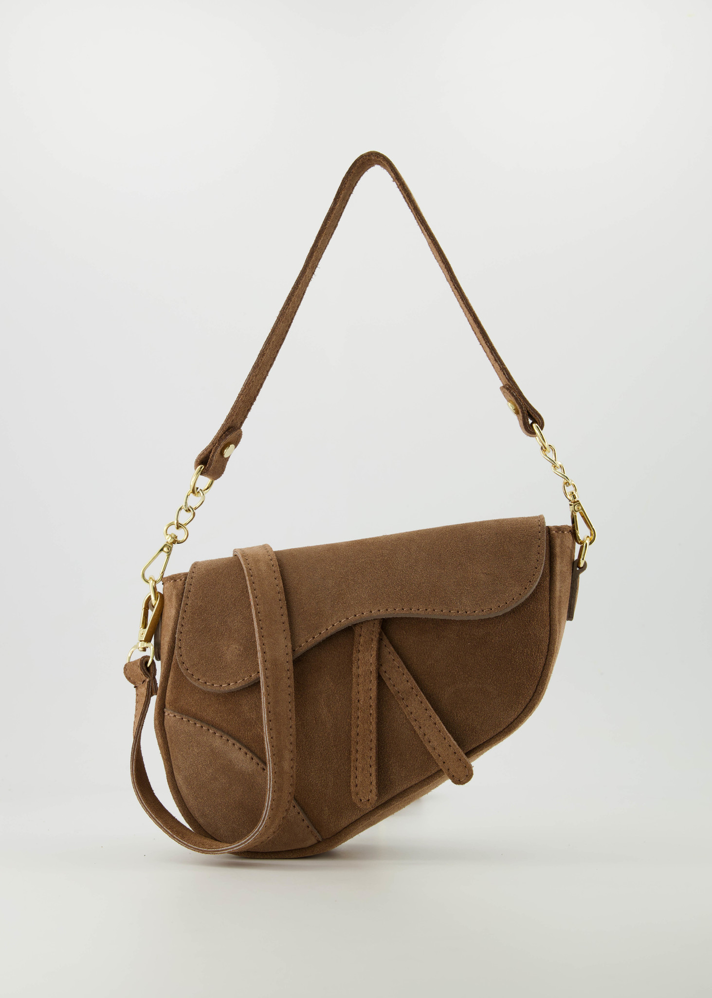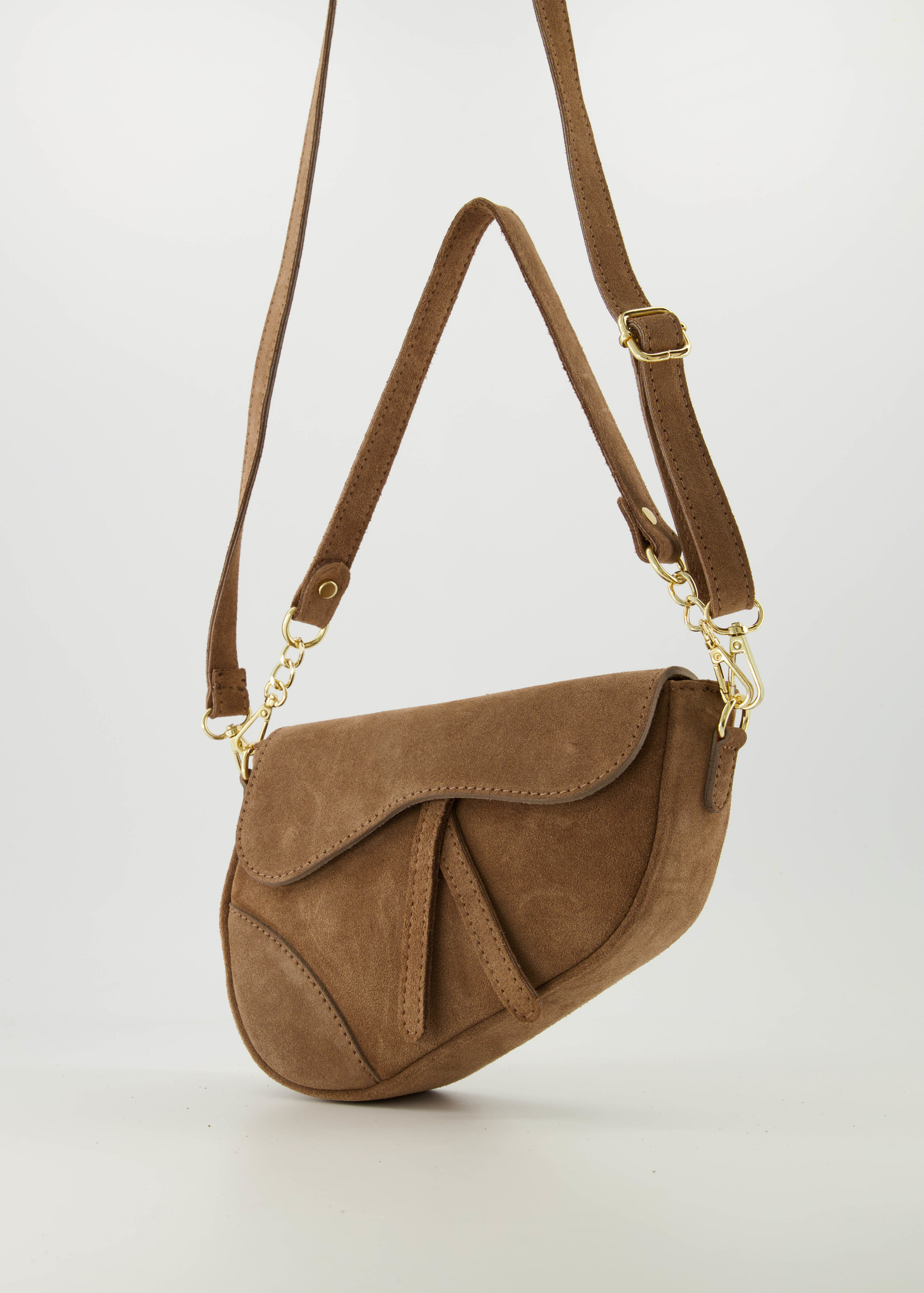 Gigi is een zadelvormige tas gemaakt van suede leer. De tas heeft twee hengsels, een kortere om als handtas te dragen en een langer verstelbaar hengsel om als crossbodytas te dragen. De crossbody tas heeft goudkleurige hardware en wordt gesloten met magneetsluitingen. Aan de binnenzijde zit een vakje met een ritssluiting.