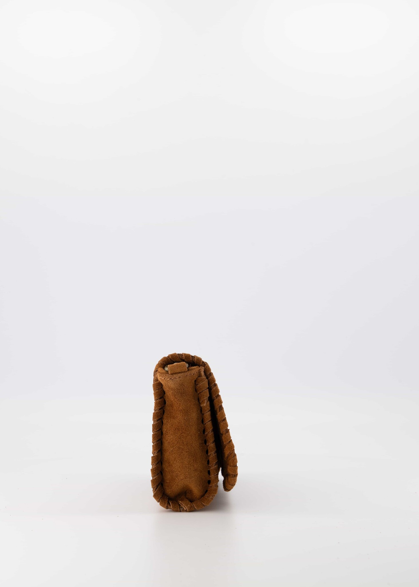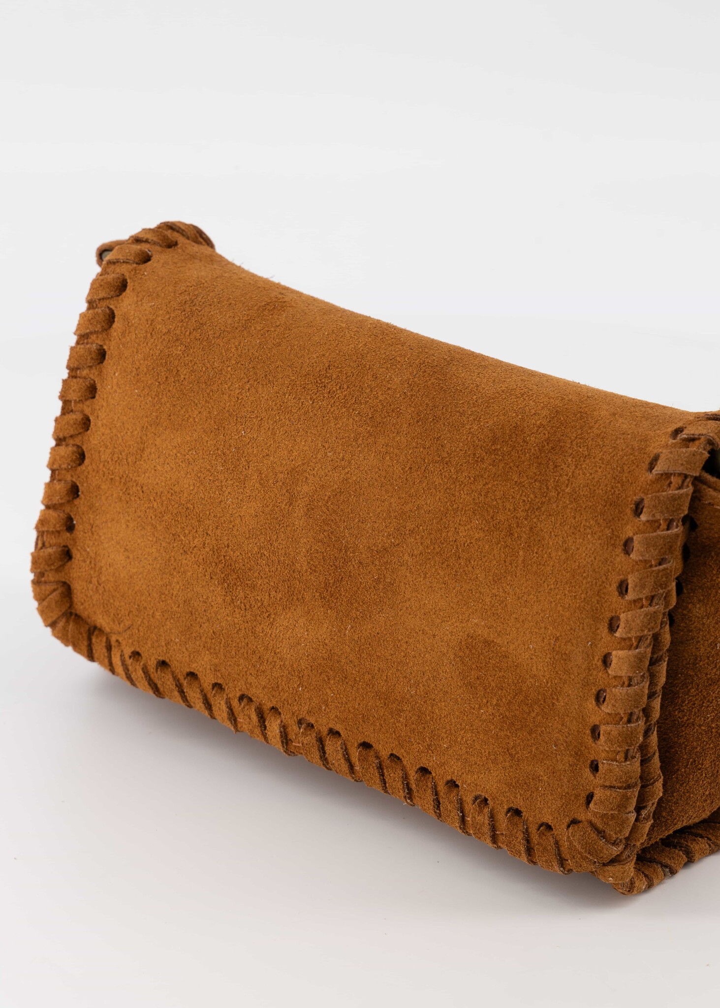 Romee is een suede leren crossbody tas voorzien gevlochten details rondom de tas. De tas heeft een afneembaar en verstelbaar hengsel.
