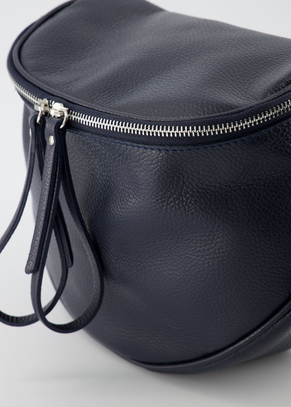 De Romsa tas in de kleur Donkerblauw is gemaakt van Italiaans leer. De tas bestaat uit een hoofdvak en is te sluiten door middel van een rits. In het hoofdvak zit een afsluitbaar steekvak. De tas heeft een afneembaar en verstelbaar hengsel van leer. De tas kan als crossbody tas gedragen worden, maar ook als heuptas.