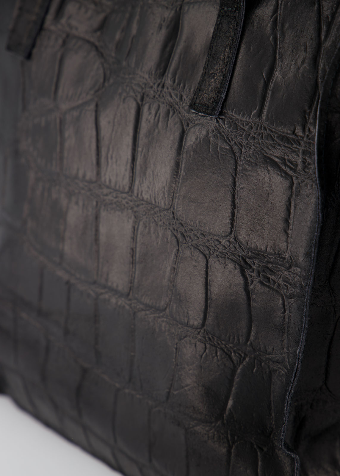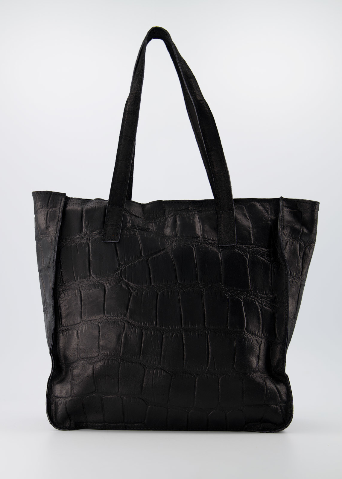 Leren handtas vervaadigd van suede in croco uitvoering die ook te dragen is als crossbodytas. De tas heeft een groot binnenvak en een afsluitbaar vakje aan de binnenzijde.