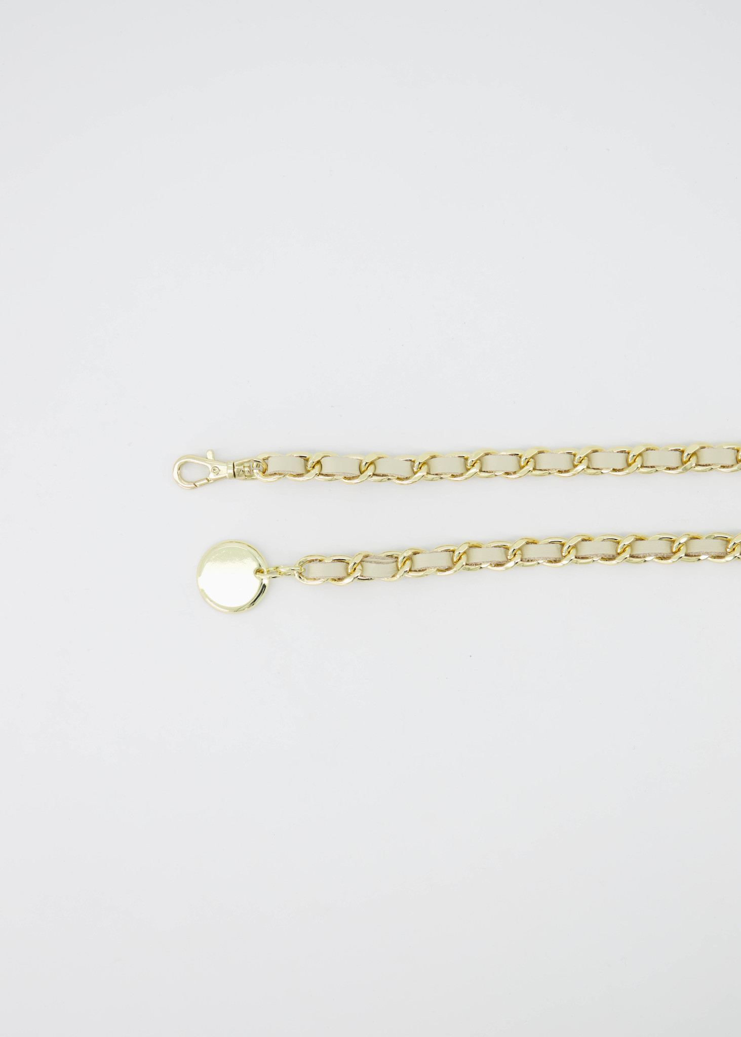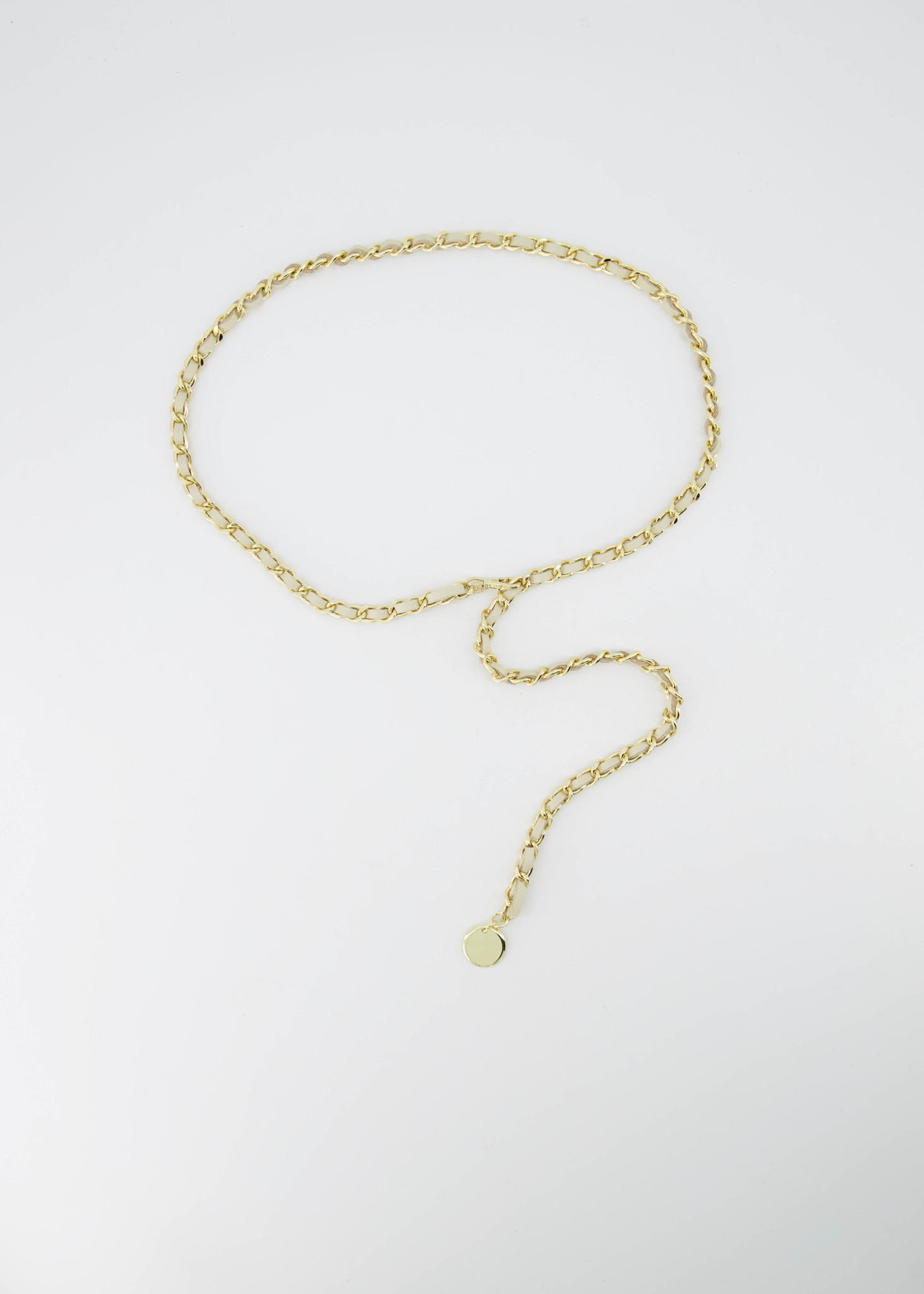 Josh is een lange ketting riem met leer erin geweven. De Josh riem kan gedragen worden om de taille bij een jurkje of als broekriem. De ketting riem heeft een haaksluiting en een muntje als detail.