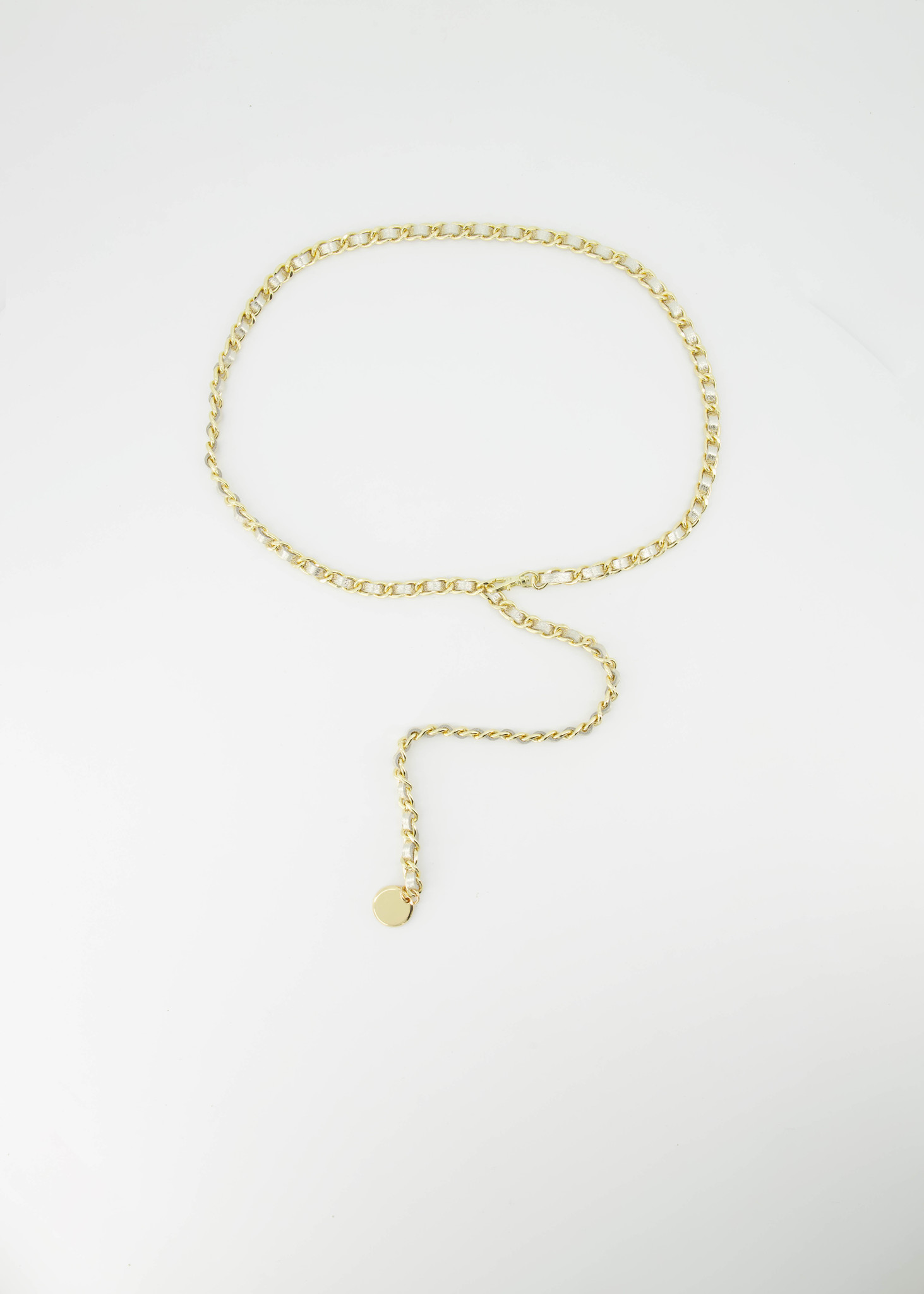 Josh is een lange ketting riem met leer erin geweven. De Josh riem kan gedragen worden om de taille bij een jurkje of als broekriem. De ketting riem heeft een haaksluiting en een muntje als detail.
