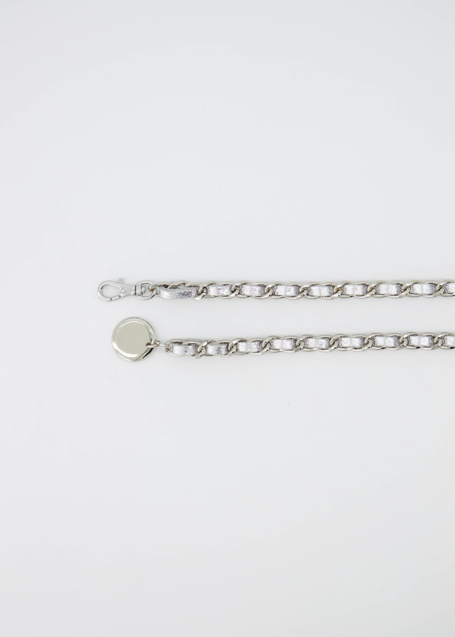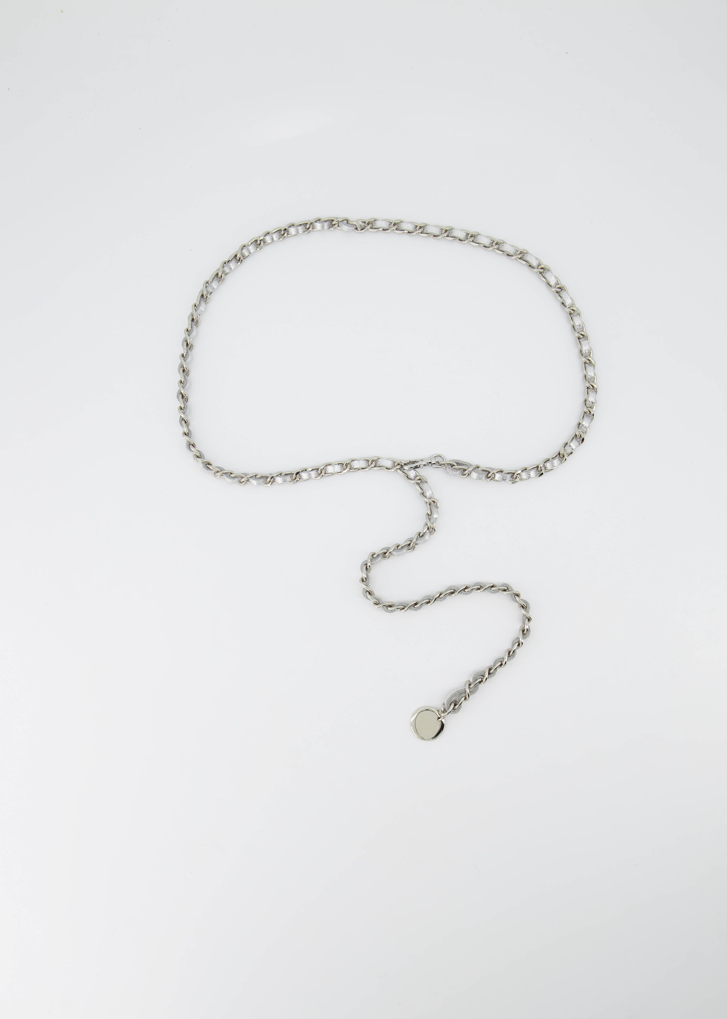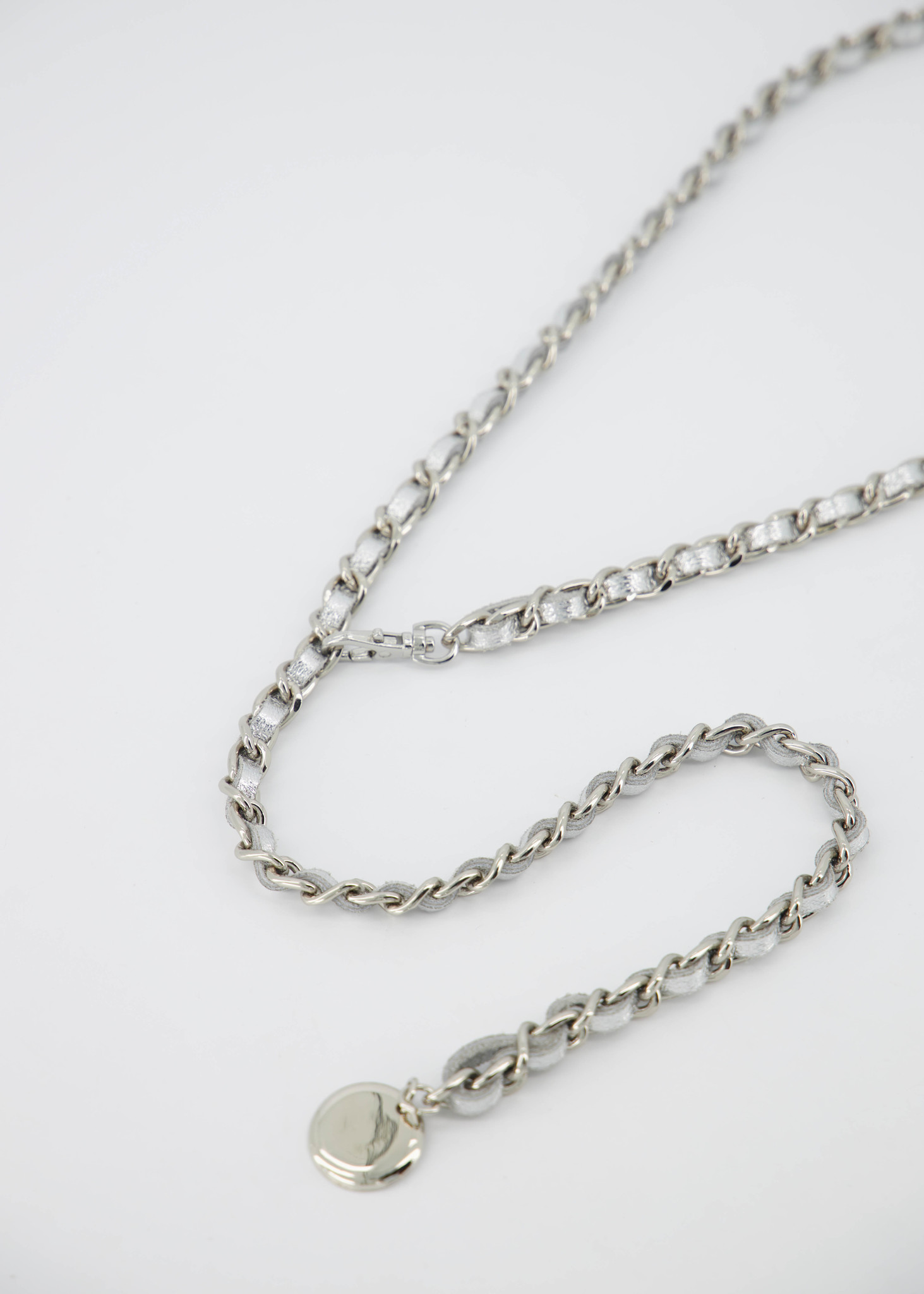 Josh is een lange ketting riem met leer erin geweven. De Josh riem kan gedragen worden om de taille bij een jurkje of als broekriem. De ketting riem heeft een haaksluiting en een muntje als detail.