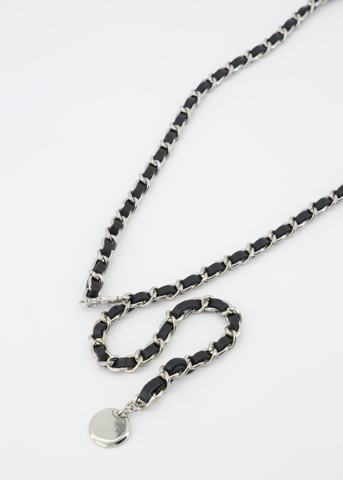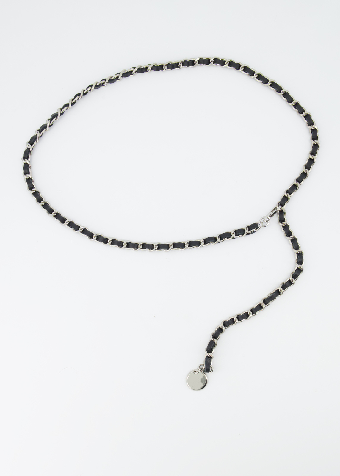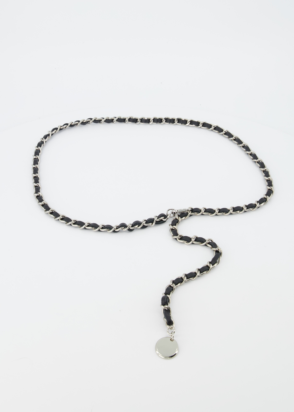 Josh is een lange ketting riem met leer erin geweven. De Josh riem kan gedragen worden om de taille bij een jurkje of als broekriem. De ketting riem heeft een haaksluiting en een muntje als detail.
