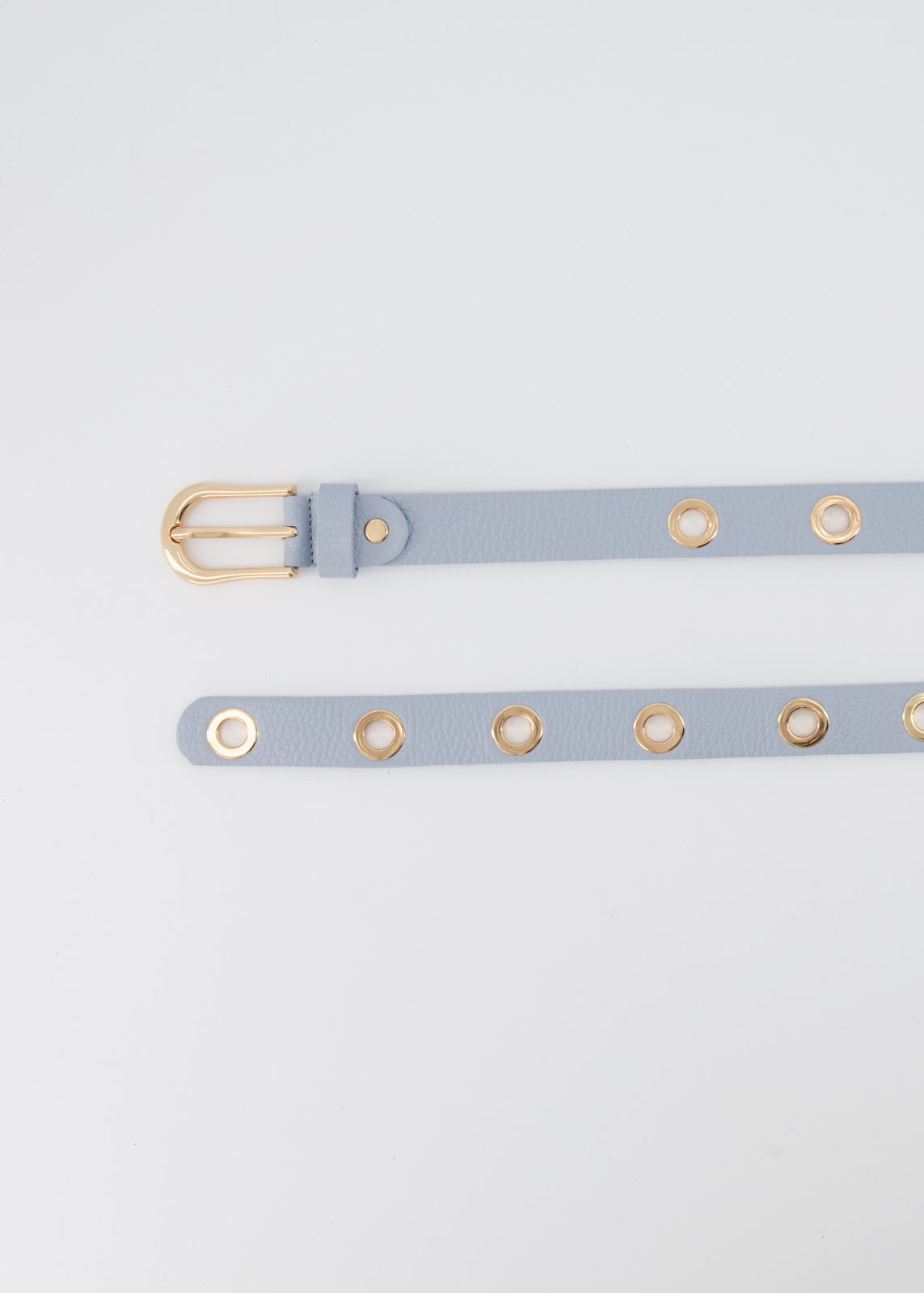 Leren riem met gaatjes en een schroef op de kop waarmee de riem korter gemaakt kan worden. De Avery riem kan ook als tailleriem gedragen worden.
