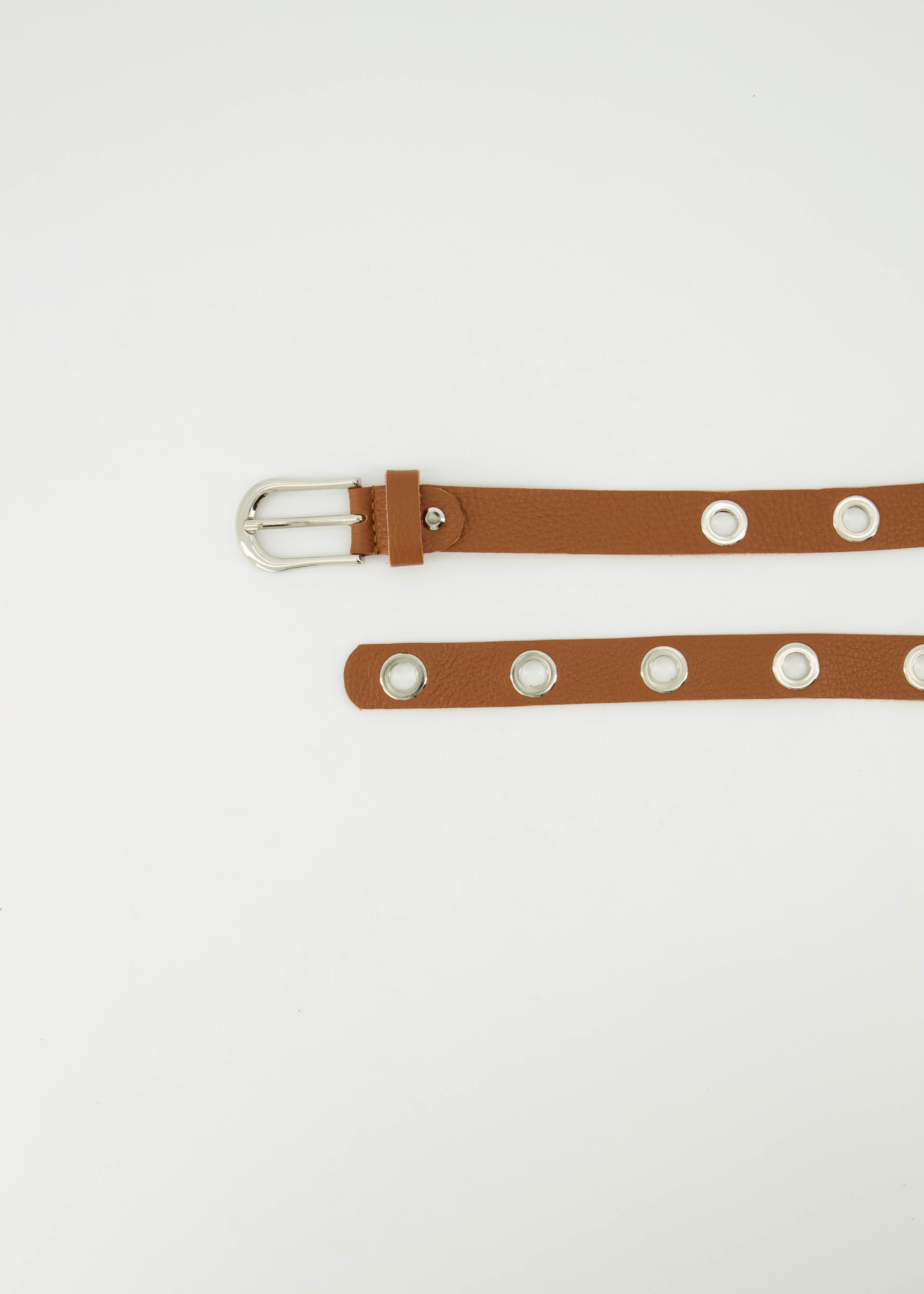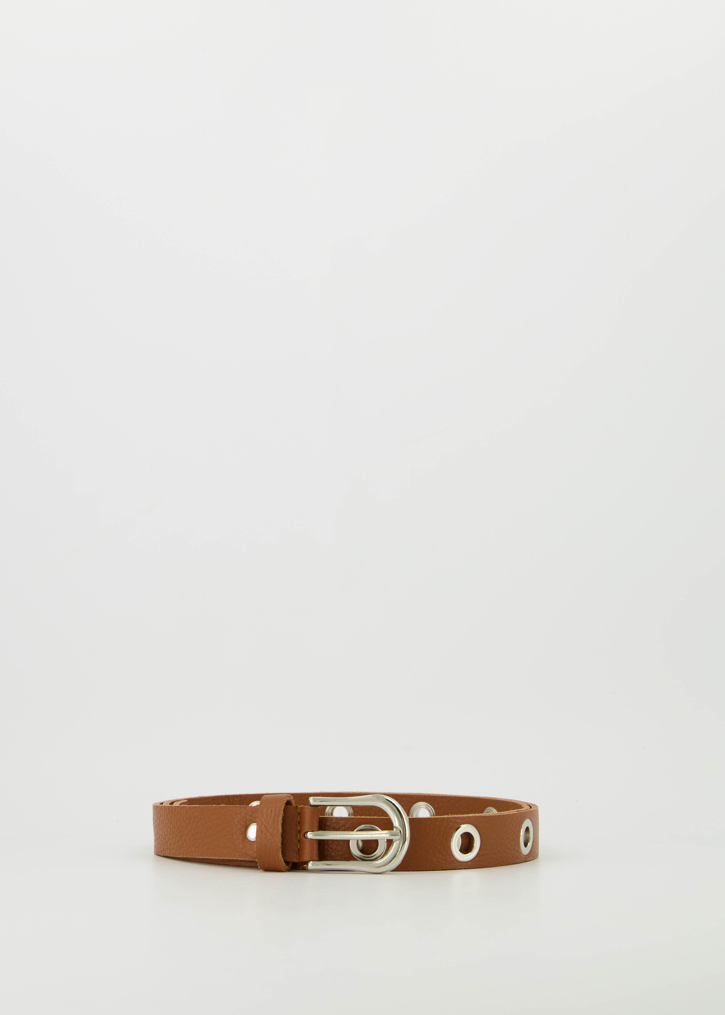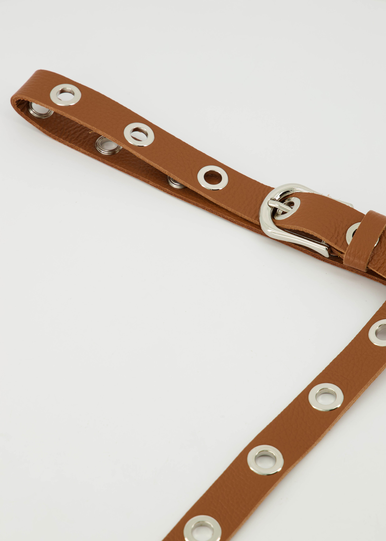 De Avery riem in de kleur cognac is gemaakt van genuine leer. De riem heeft gaatjes en een gesp die zijn afgewerkt met zilverkleurige hardware. Avery is 135 cm lang en is in te korten door middel van een schroef op de kop. De riem Avery kan als broekriem en tailleriem gedragen worden.
