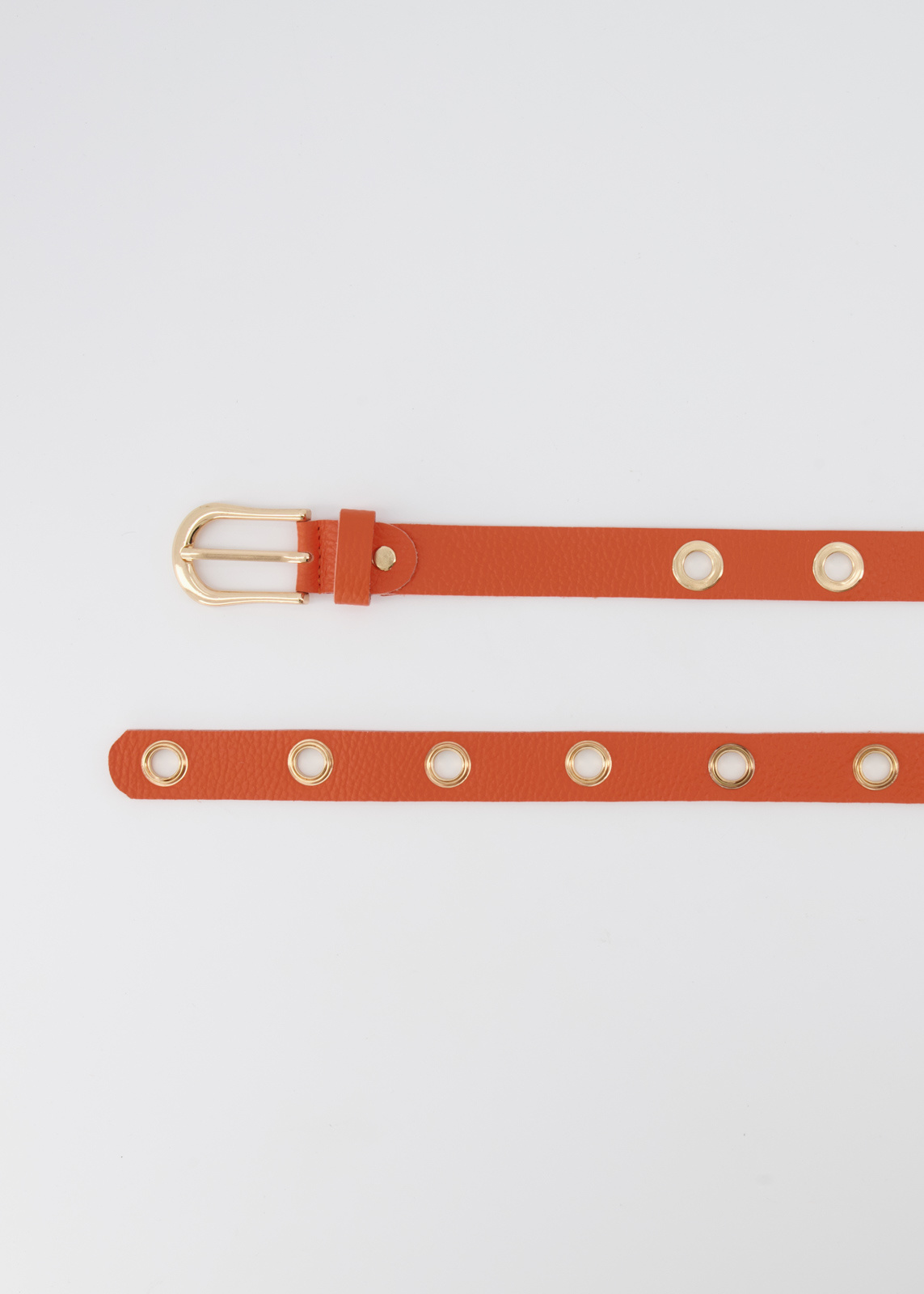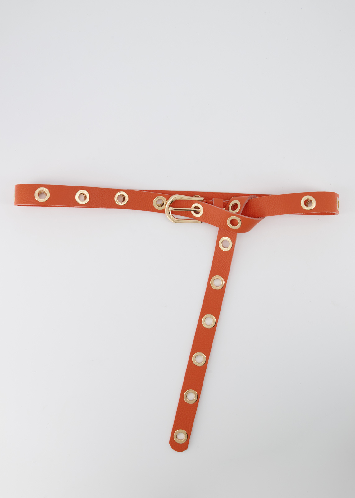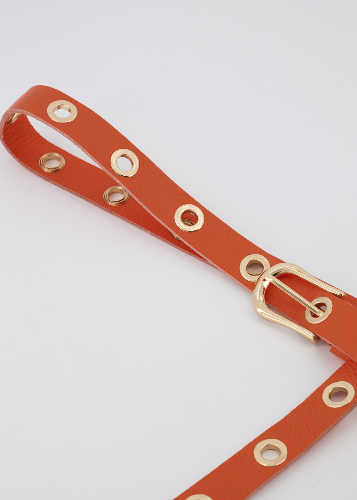 Leren riem met gaatjes en een schroef op de kop waarmee de riem korter gemaakt kan worden. De Avery riem kan ook als tailleriem gedragen worden.