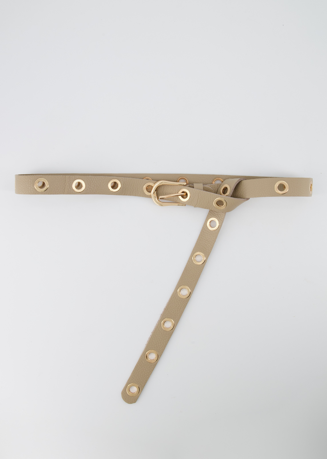 Leren riem met gaatjes en een schroef op de kop waarmee de riem korter gemaakt kan worden. De Avery riem kan ook als tailleriem gedragen worden.