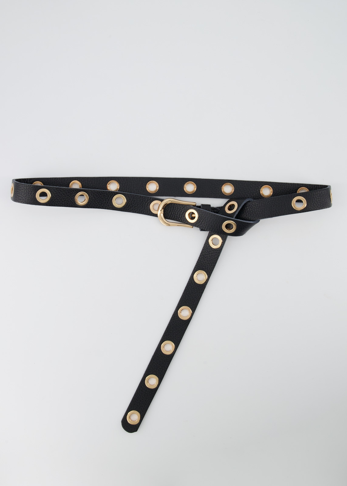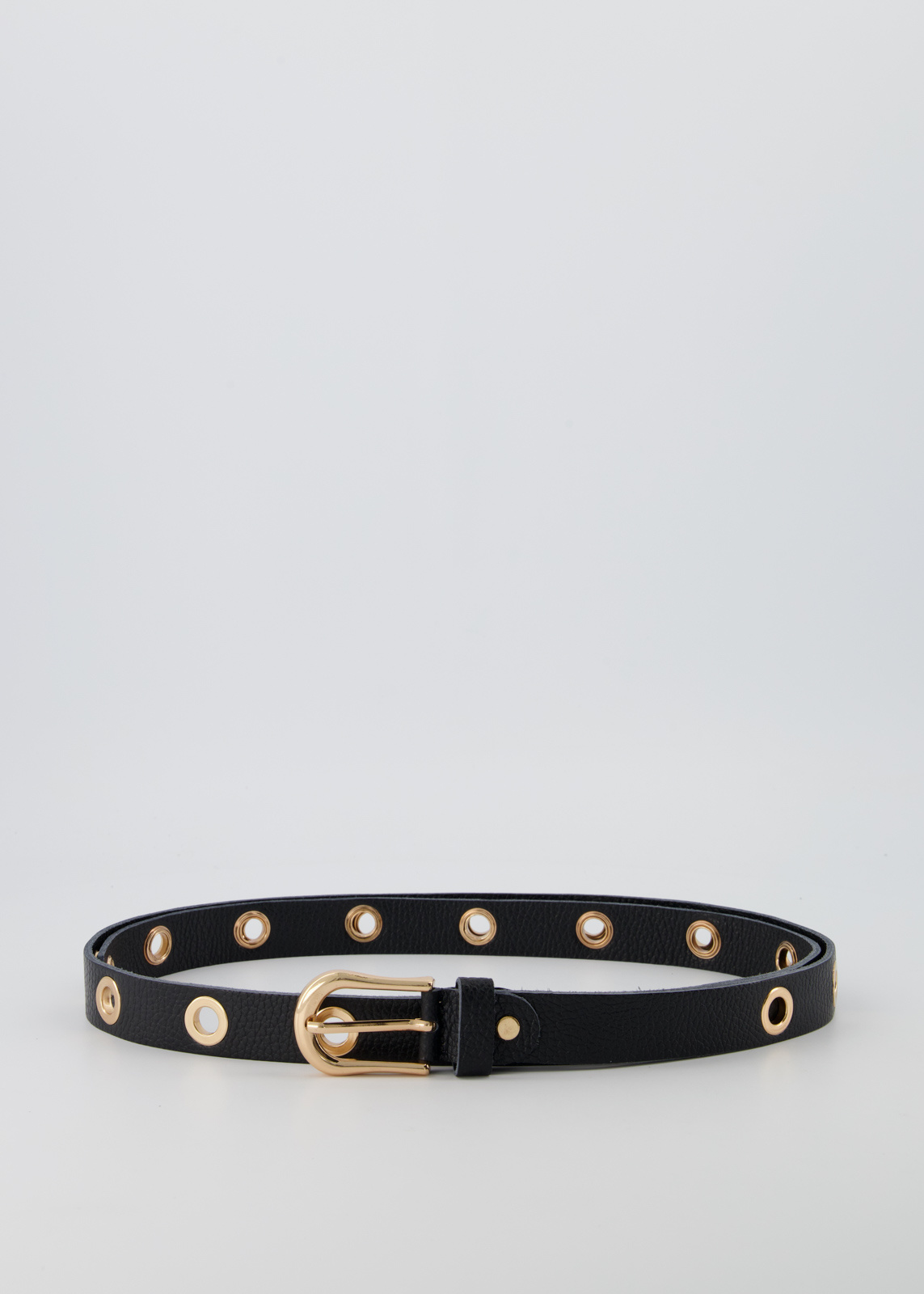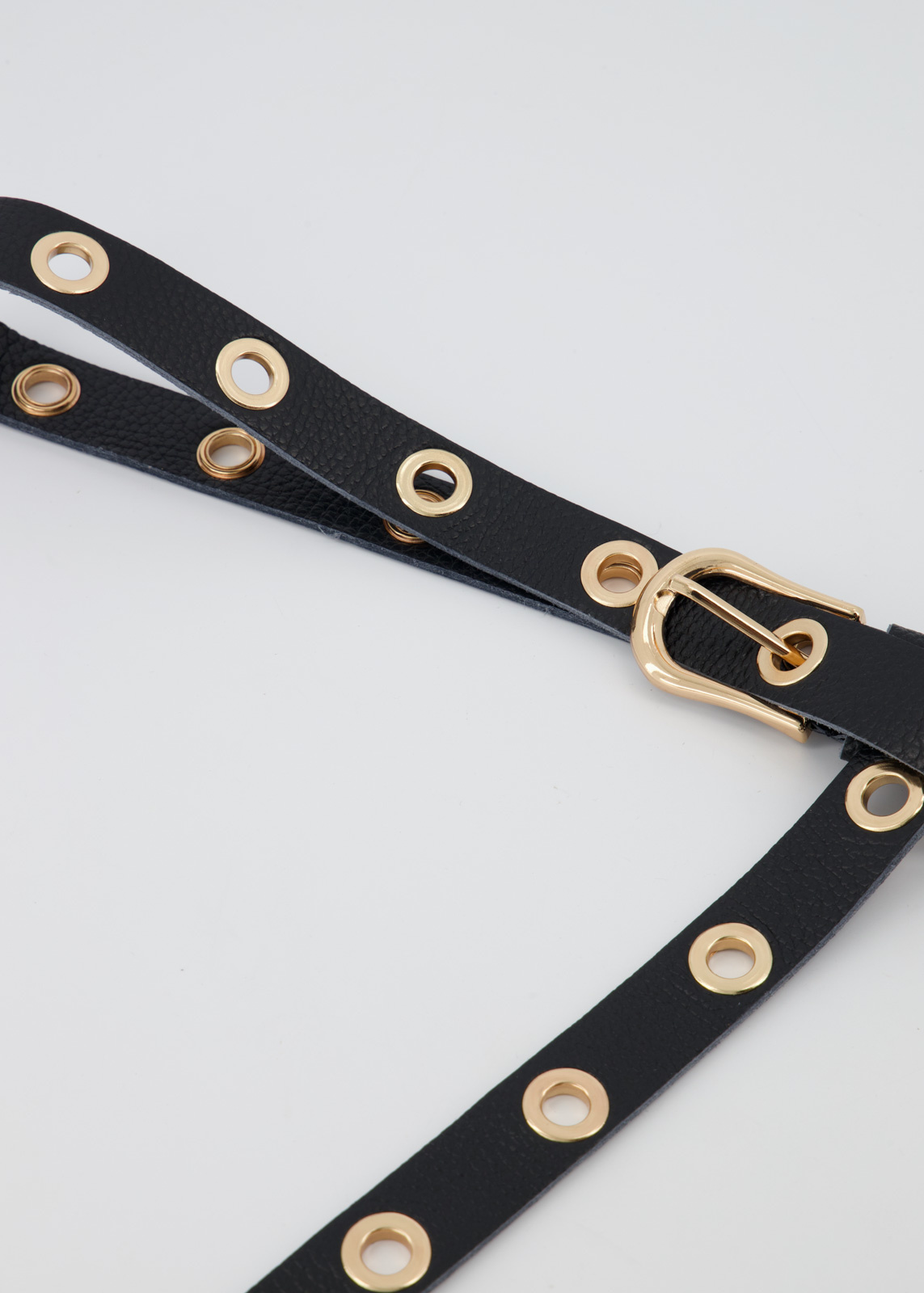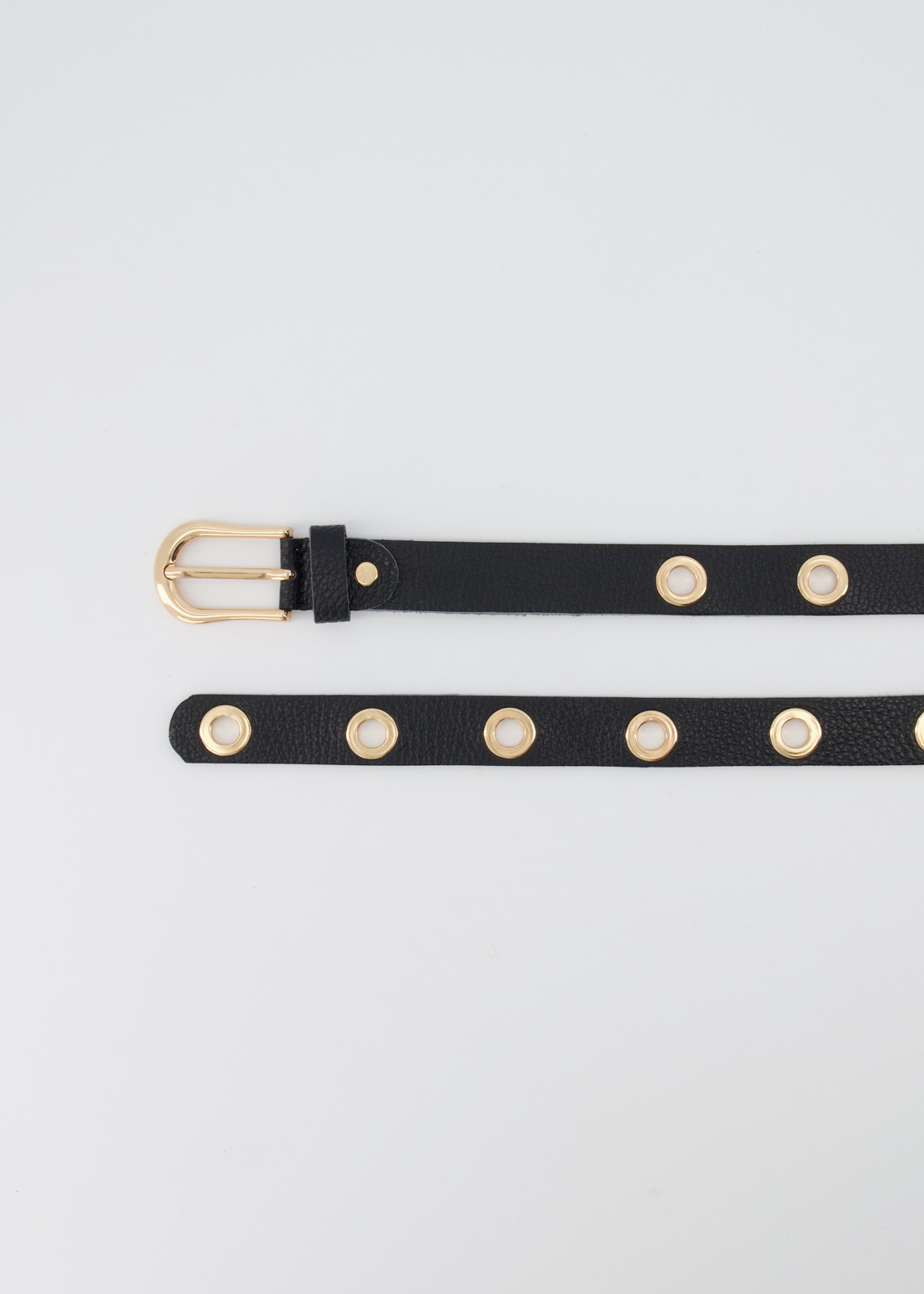 Leren riem met gaatjes en een schroef op de kop waarmee de riem korter gemaakt kan worden. De Avery riem kan ook als tailleriem gedragen worden.