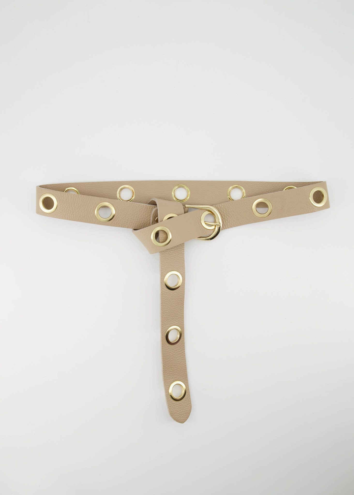 Leren riem met gaatjes en een schroef op de kop waarmee de riem korter gemaakt kan worden. Kan als tailleriem gedragen worden.