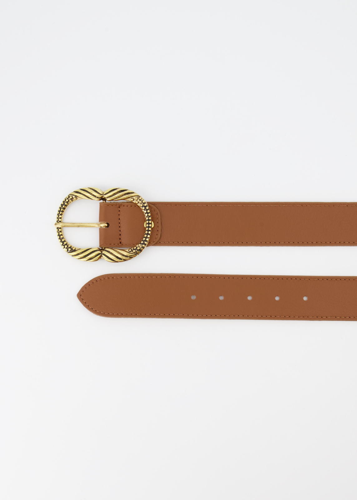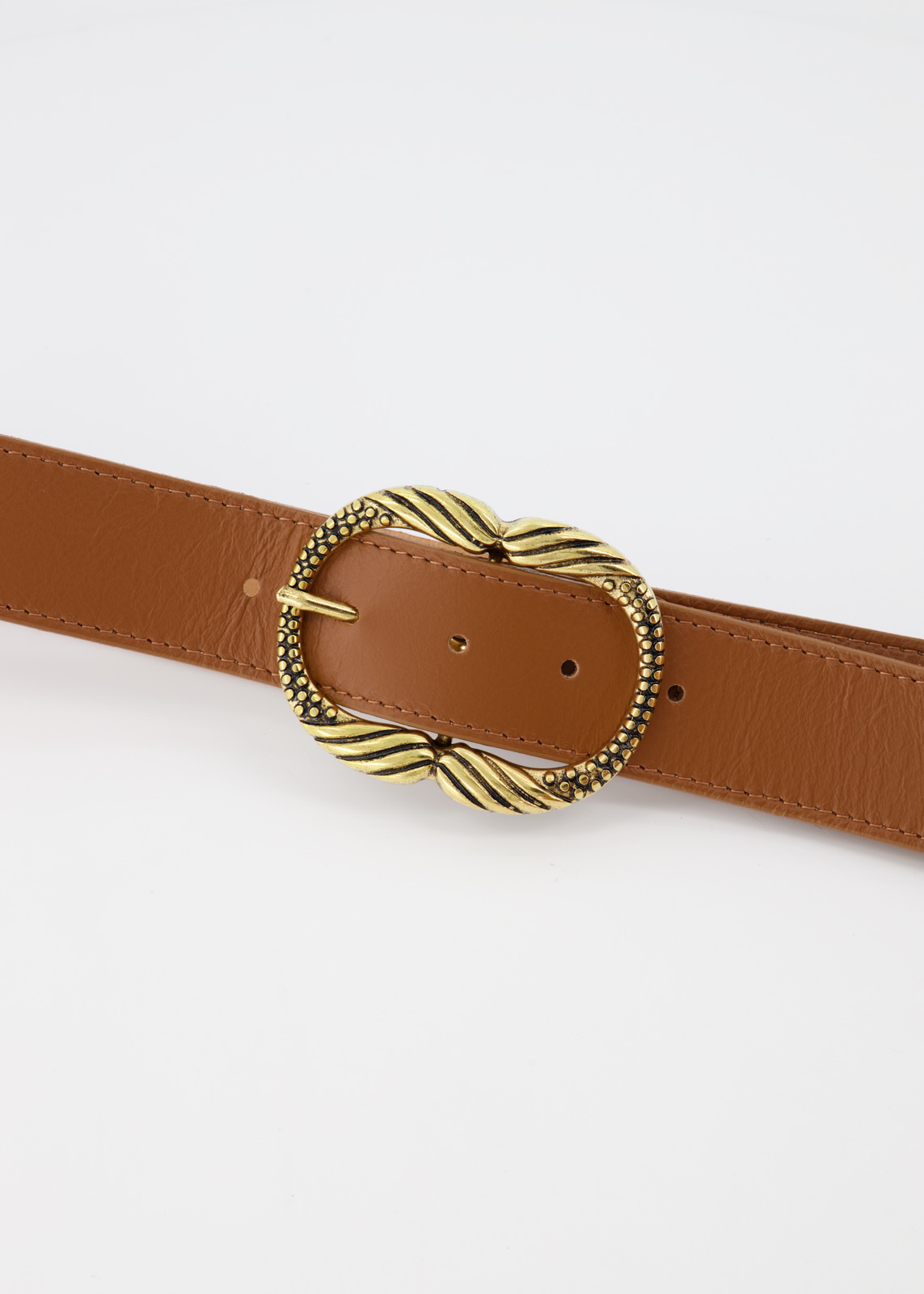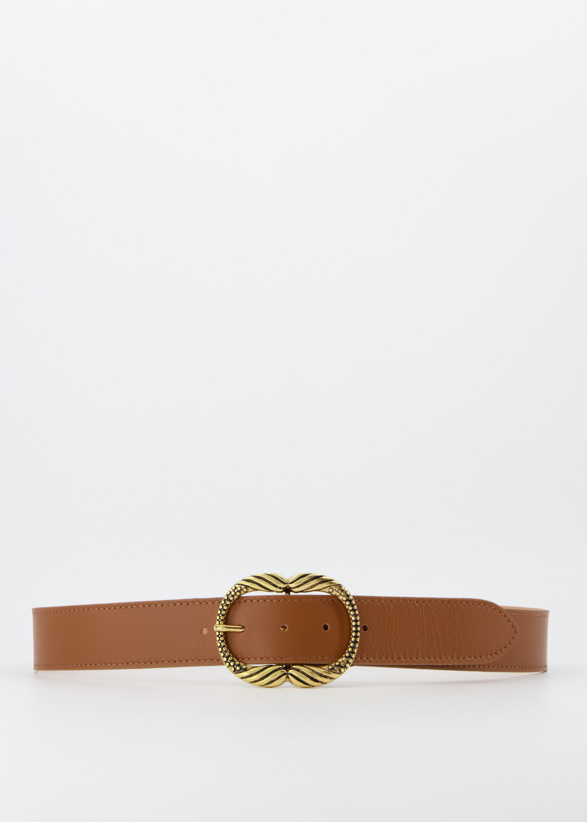 Leren riem met goudkleurige gesp, verkrijgbaar in een maat 85, 95 en 105. De riem is 4 cm breed.