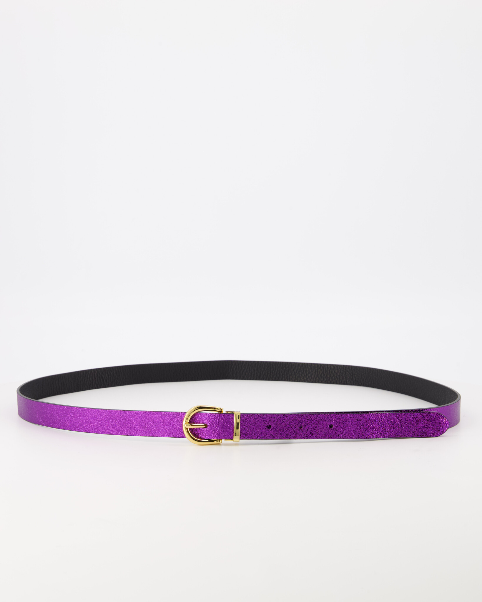 De Meau reversible leren riem, vakkundig gemaakt in Italië. Deze riem biedt twee stijlen in één, met metallic leer aan de ene kant en grain leer aan de andere kant. De verwijderbare goudkleurige gesp maakt aanpassen eenvoudig. 3 cm breed