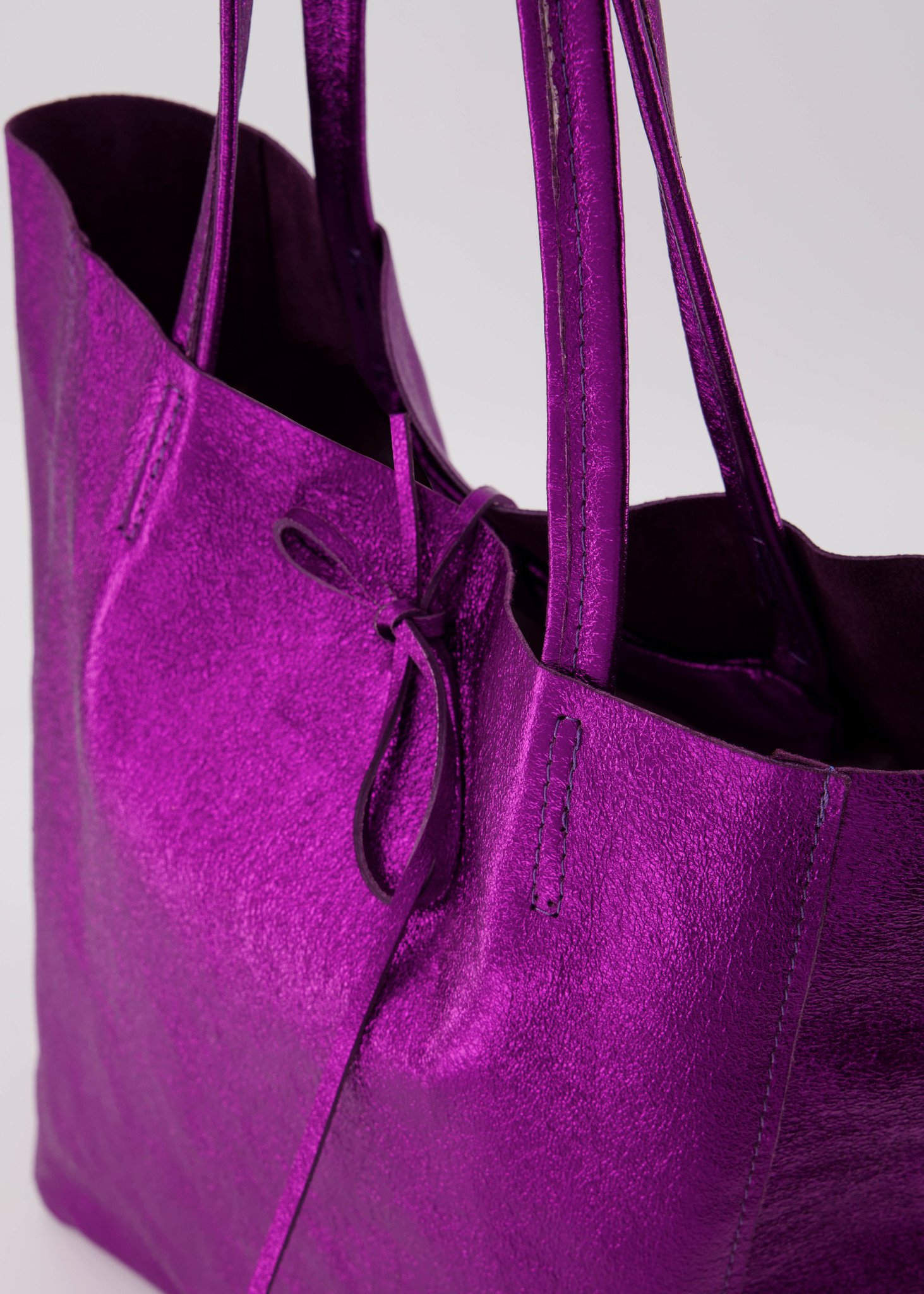 Deze soepelvallende leren shopper heeft aan de bovenkant een touwsluiting. Aan de binnenzijde zit een vakje met een ritssluiting.
