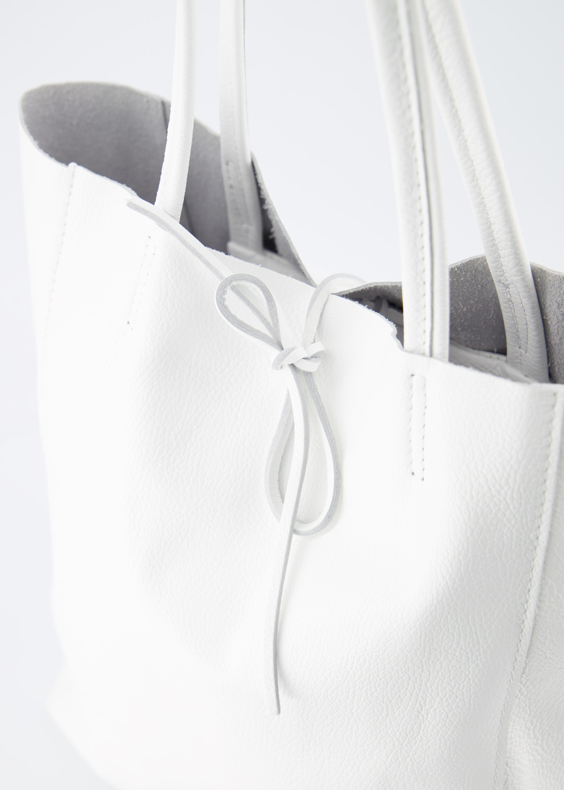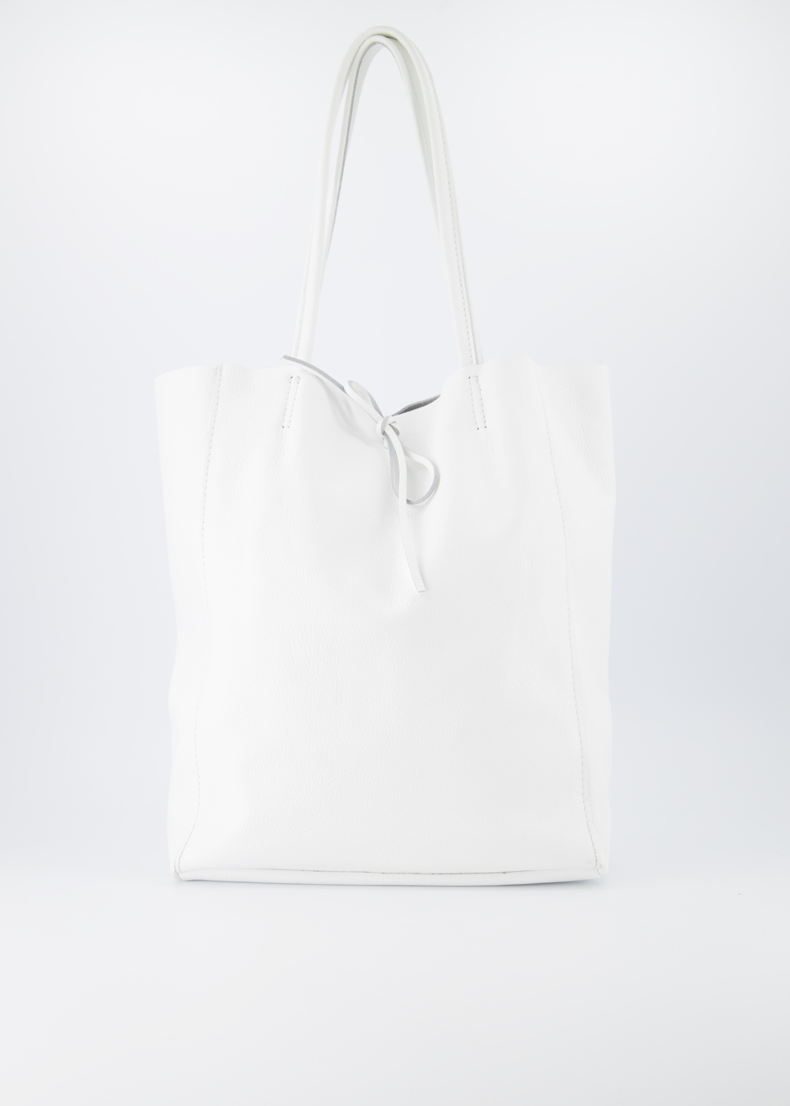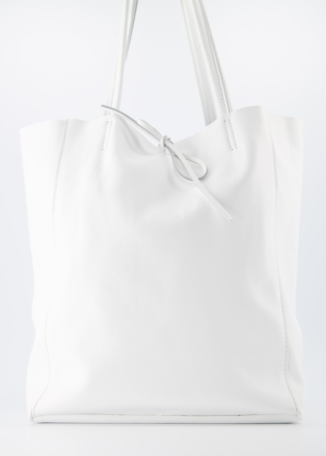 Deze soepelvallende leren shopper heeft aan de bovenkant een touwsluiting. Aan de binnenzijde zit een vakje met een ritssluiting.